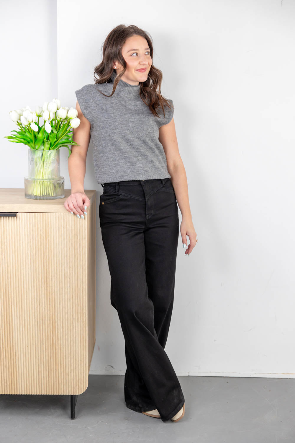 The After Hours Black Wide Leg Jeans is where sleek meets statement, made for days when you want to feel put together without overthinking it. Crafted from soft, stretchy denim in a true black wash, it offers a high-rise fit that smooths and flatters. The wide leg silhouette creates a bold, balanced shape, while a V-shaped front seam draws the eye inward for a slimming effect. A finished hem keeps the look polished, making this pair easy to dress up or down. Complete with a classic button and zip closure, it’s the kind of jean that blends comfort, confidence, and all-day wearability. No stiffness, no fuss, just jeans that work as soon as you put them on.