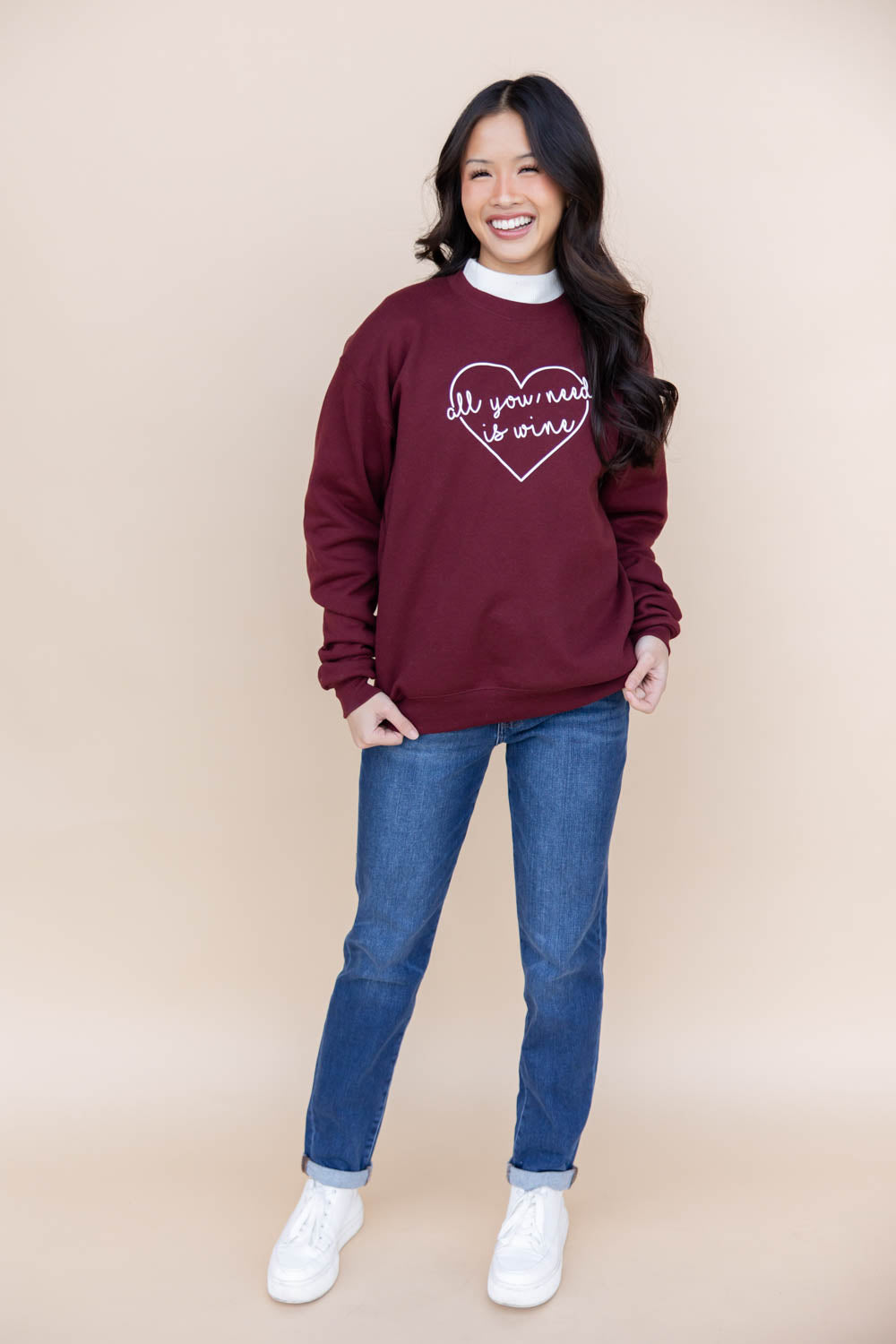 The All You Need Is Wine Graphic Sweatshirt is cozy comfort with a splash of truth. Crafted in a unisex, slightly relaxed fit with a soft, fuzzy interior, it’s made for wine nights, cozy weekends, and everything in between. The rich wine-colored base sets the mood, while crisp white cursive lettering spells out “all you need is wine” layered over a subtle heart graphic. Finished with a classic crew neckline, this sweatshirt is your new go-to for sipping in style.