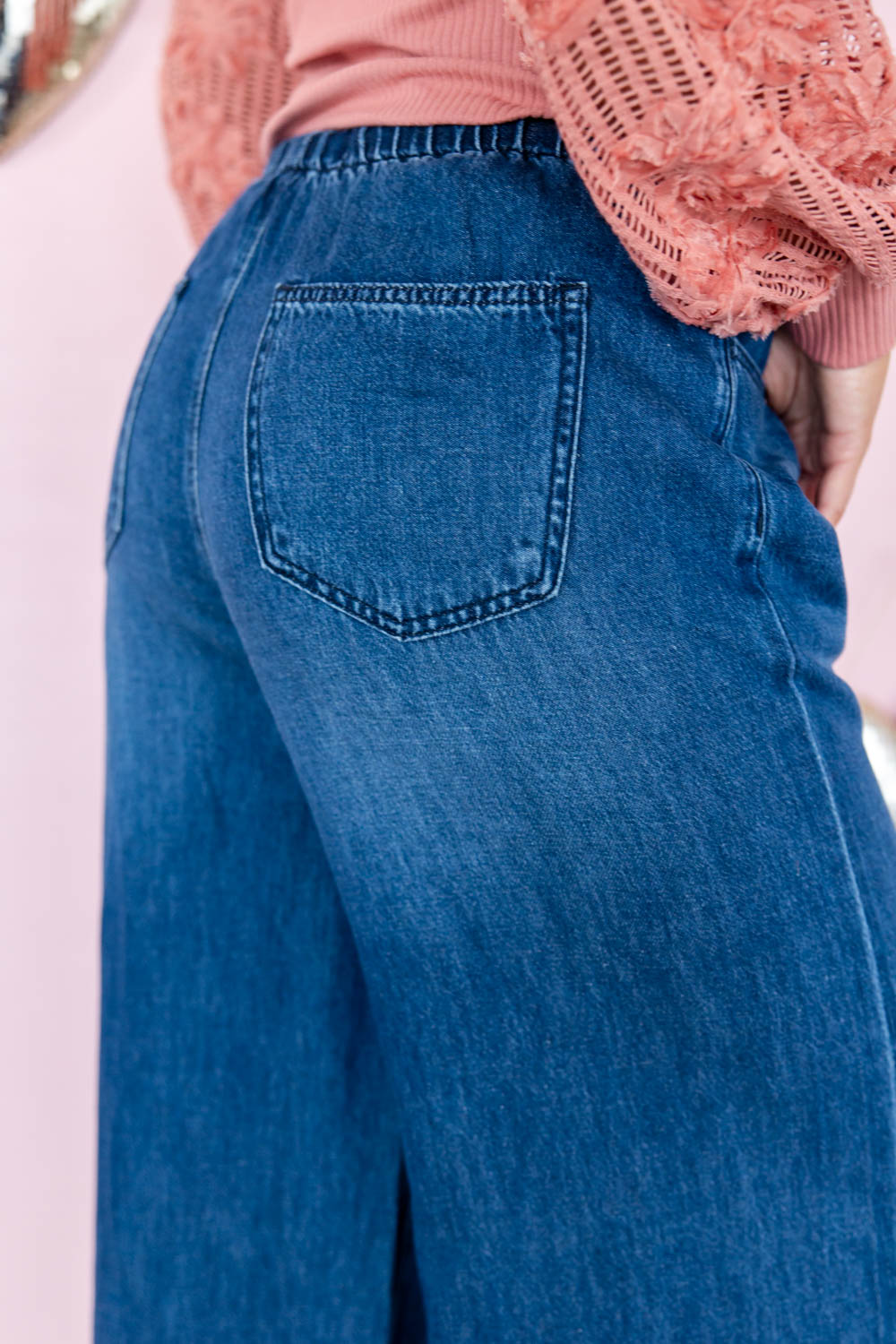 Meet the jeans that make getting dressed feel easy. The high-rise fit sits comfortably without digging, and the soft, brushed fabric feels good all day — light, breathable, and never stiff. The relaxed wide leg gives you room to move, while the elastic waistband with a drawstring adjusts to you (not the other way around). No buttons to fight with, no tight spots, no fuss. Just pull them on, slip your hands into the functional pockets, and go. These are the jeans you’ll reach for when you want comfort that still looks intentional — perfect for school drop-off, errands, and everything in between.