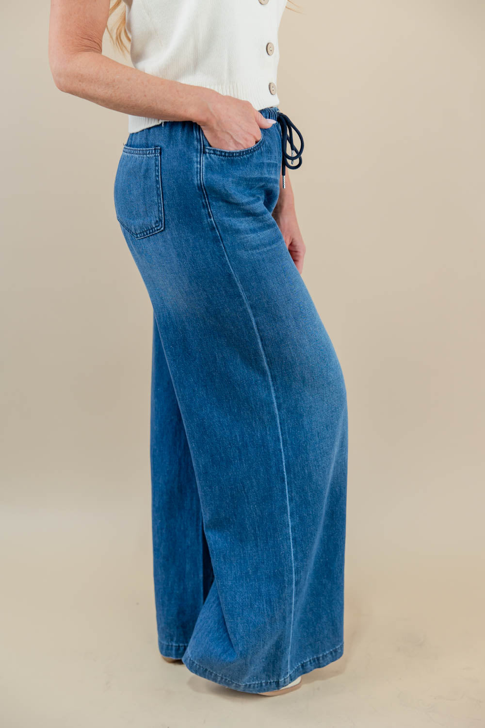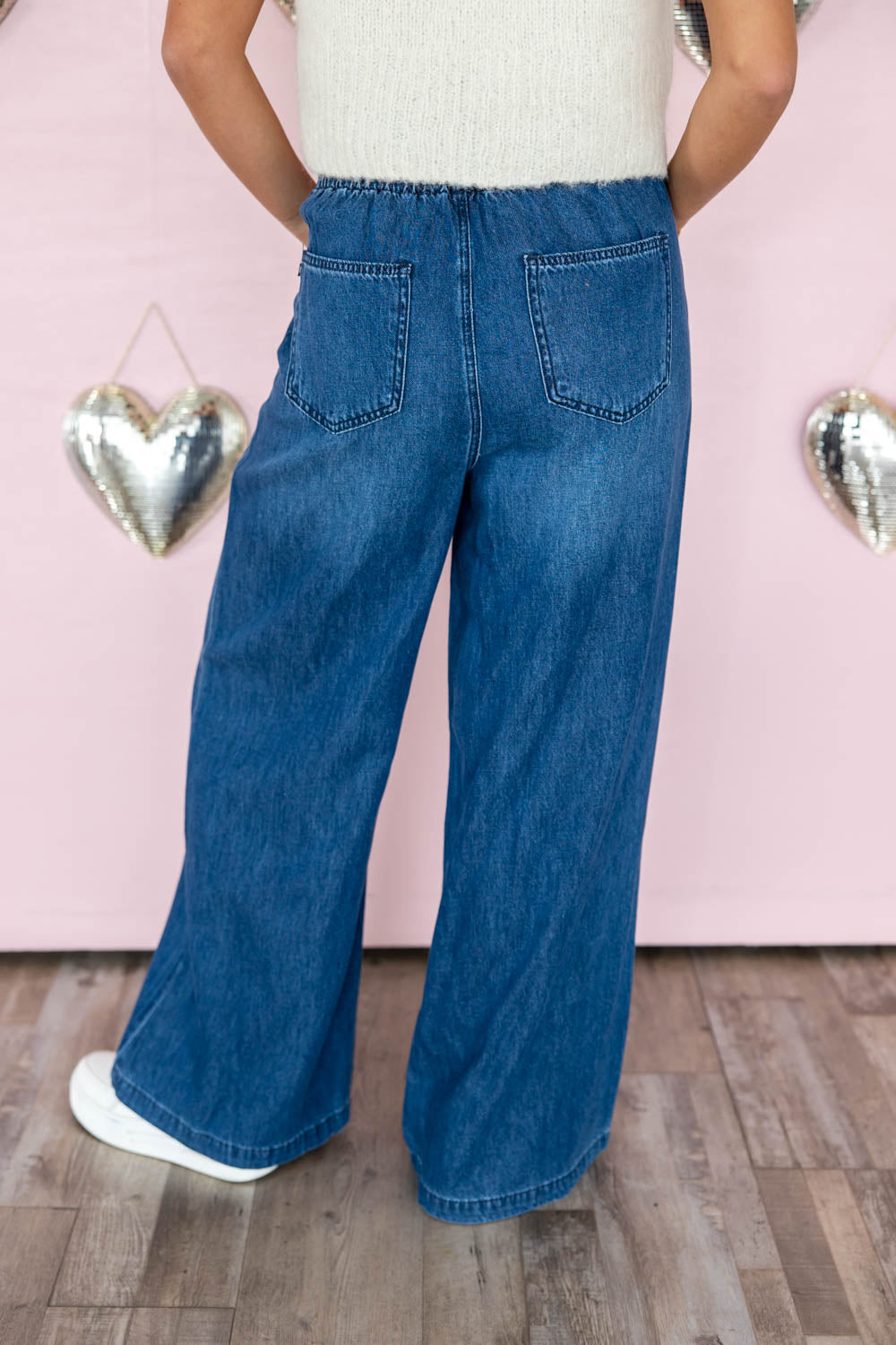 Meet the Almost Famous Featherweight Palazzo Jeans that make getting dressed feel easy. The high-rise fit sits comfortably without digging, and the soft, brushed fabric feels good all day — light, breathable, and never stiff. The relaxed wide leg gives you room to move, while the elastic waistband with a drawstring adjusts to you (not the other way around). No buttons to fight with, no tight spots, no fuss. Just pull them on, slip your hands into the functional pockets, and go. These are the jeans you’ll reach for when you want comfort that still looks intentional; perfect for school drop-off, errands, and everything in between.