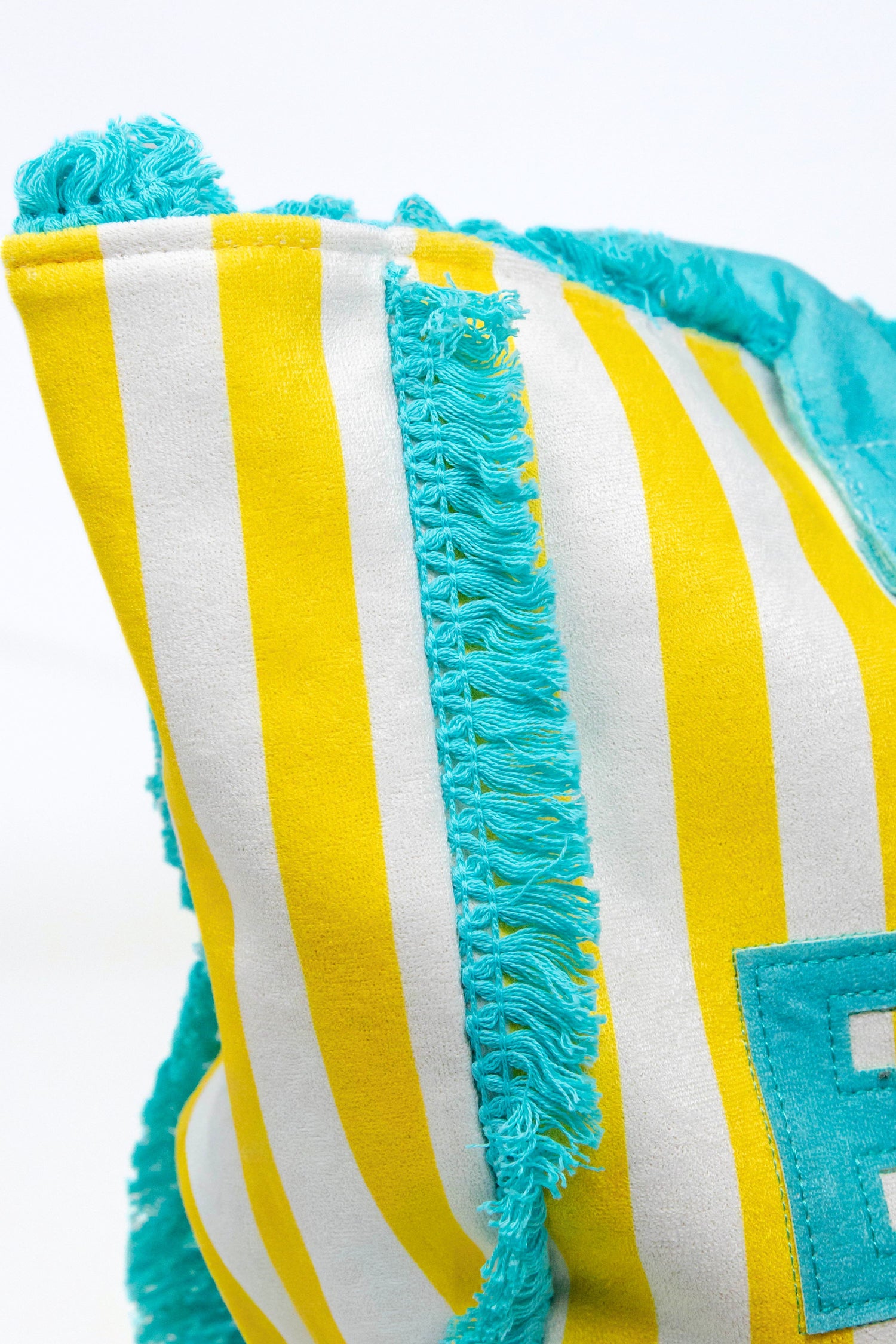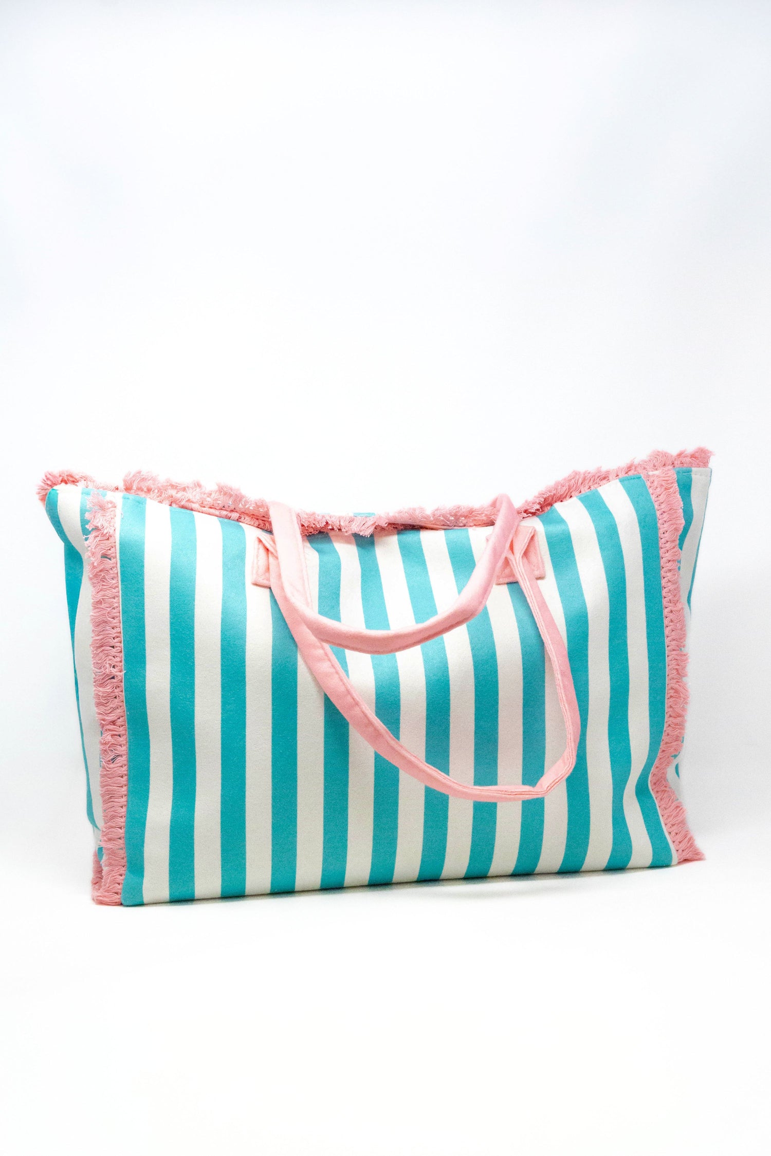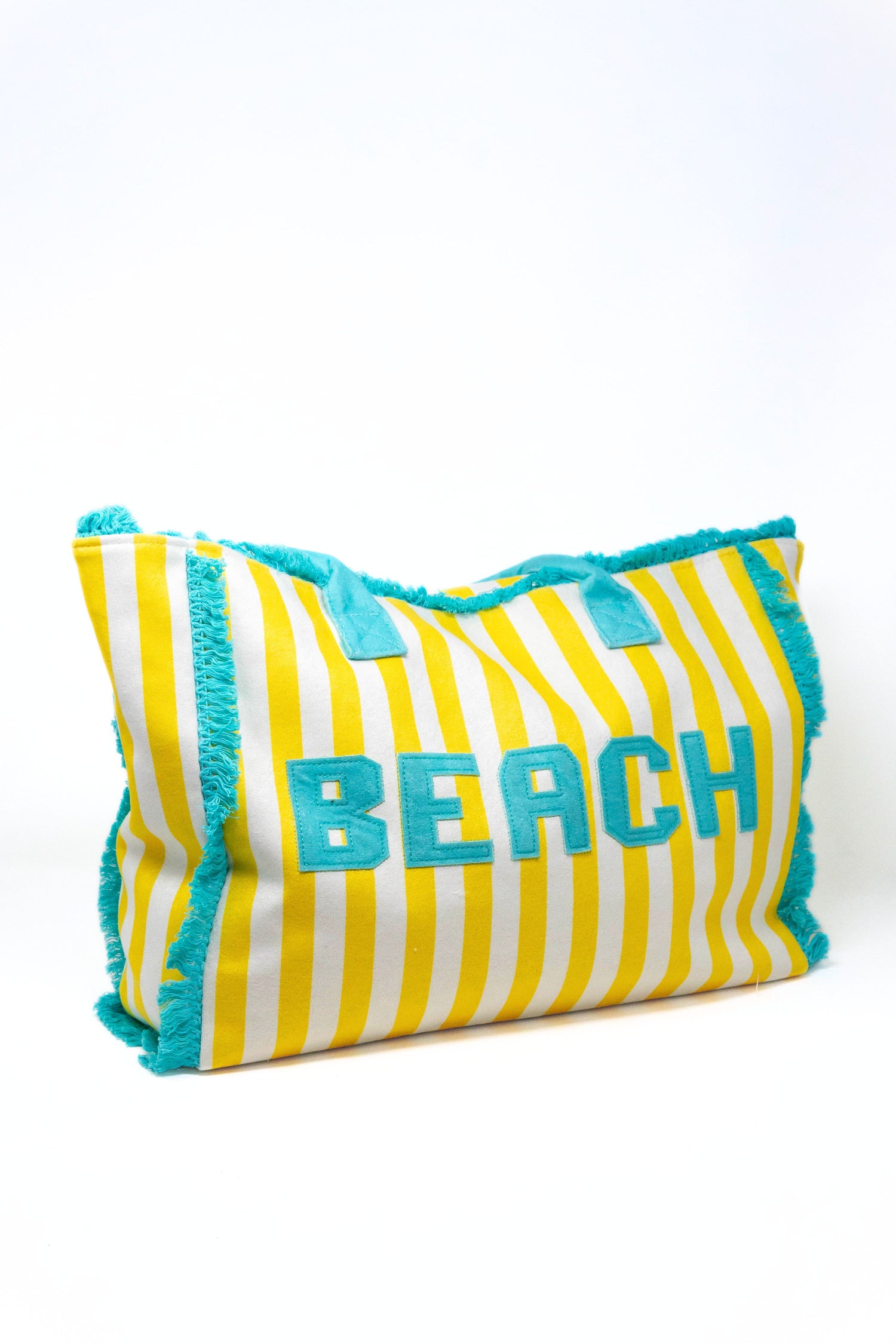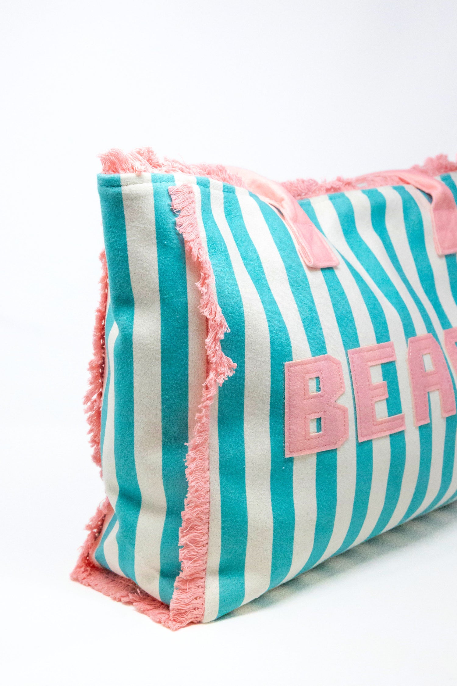 The Beach Striped Tote Bag is made to carry everything you need without sacrificing style. The roomy boxy shape gives you plenty of space for towels, sunscreen, and more, while the terry cloth material feels soft and perfectly suited for warm weather days. A secure zipper closure keeps your essentials in place, and the lined interior with an inner pocket helps you stay organized. The vegan leather shoulder strap sits comfortably on your shoulder, and the bright striped pattern with stitched “Beach” lettering adds a fun, standout finish.