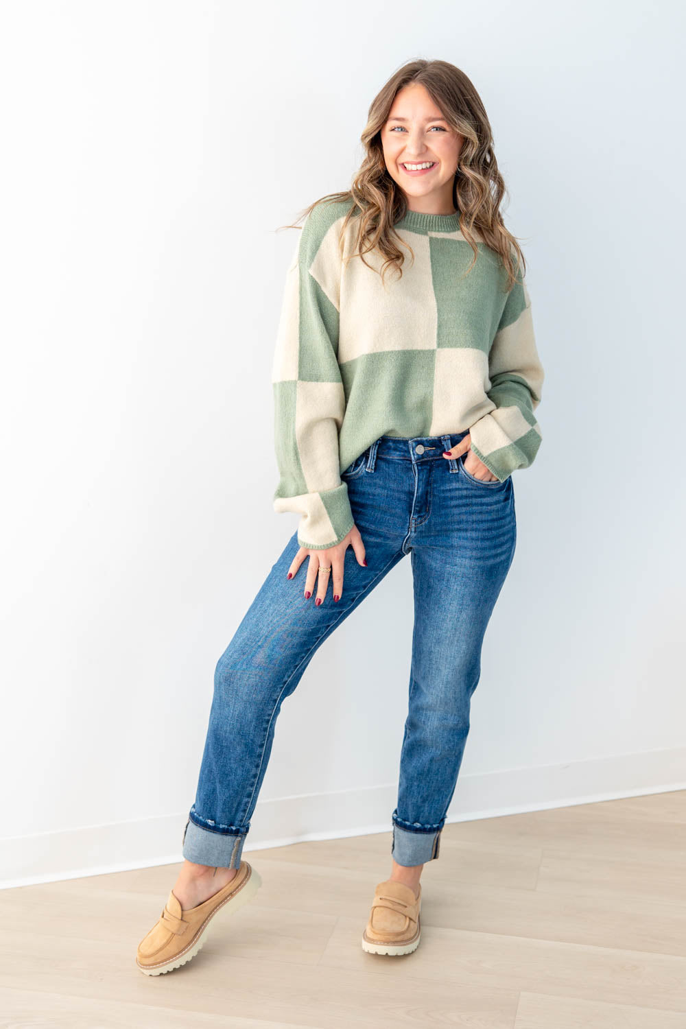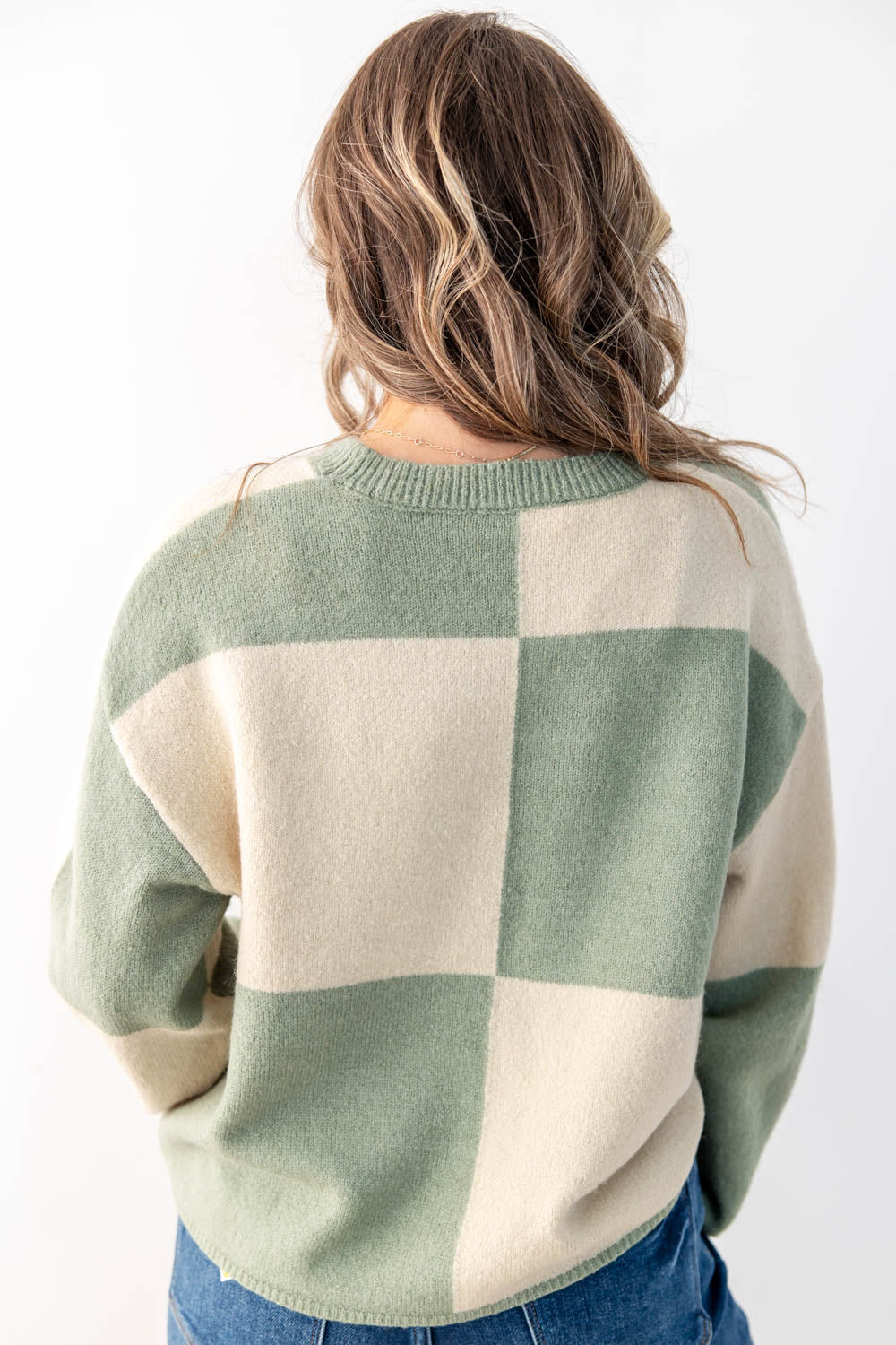 The Block It Out Checkered Sweater is all about cozy meets cool. With a relaxed fit and classic crew neckline, this mid-weight knit is easy to throw on and even easier to style. The bold checkered print covers both front and back, giving it that eye-catching vibe whether you choose the timeless black or the fresh sage color. Perfect for layering with denim, leggings, or a skirt—this sweater is ready to be your new fall favorite.