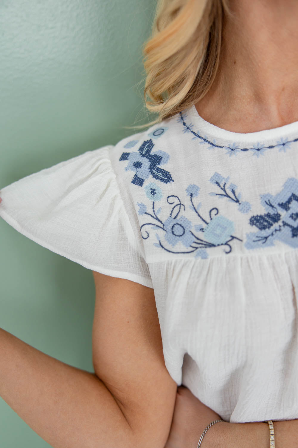 The Bloom With Me Short Sleeve Top brings soft movement and feminine charm to your everyday lineup. The flowy, true to size babydoll fit drapes comfortably without clinging, while the hip length makes it easy to wear tucked or loose. A classic crew neckline keeps it timeless, and flounce cap sleeves add light, fluttery coverage. Crafted from lightweight fabric, it feels breezy all day. The embroidered floral yoke detail adds beautiful texture that makes this top feel effortlessly special.