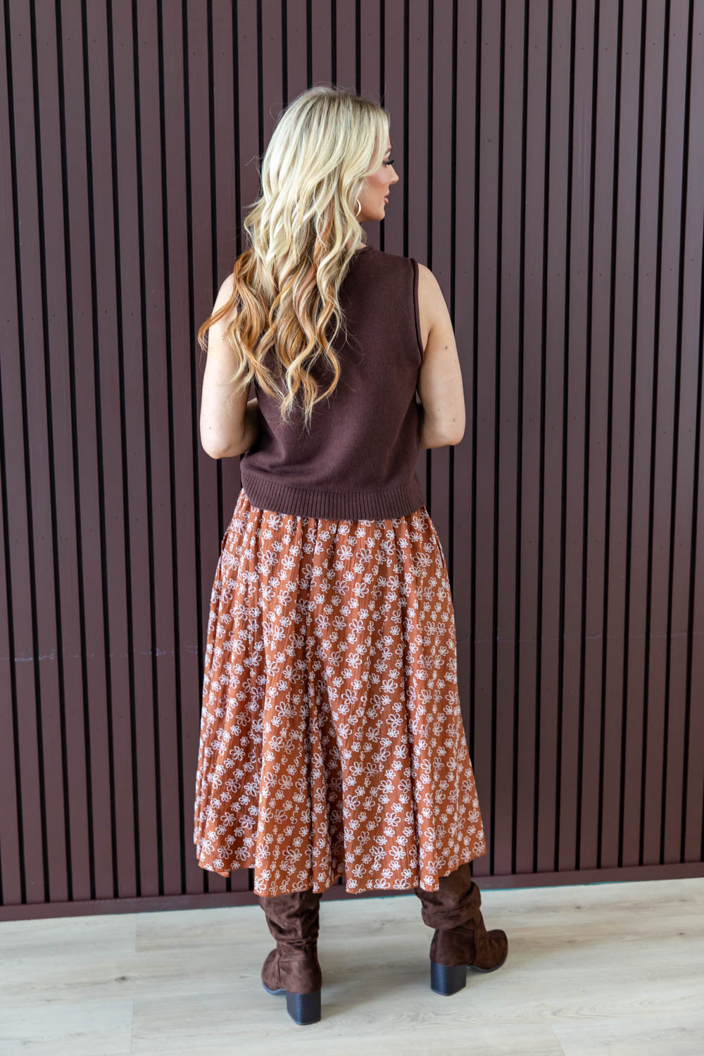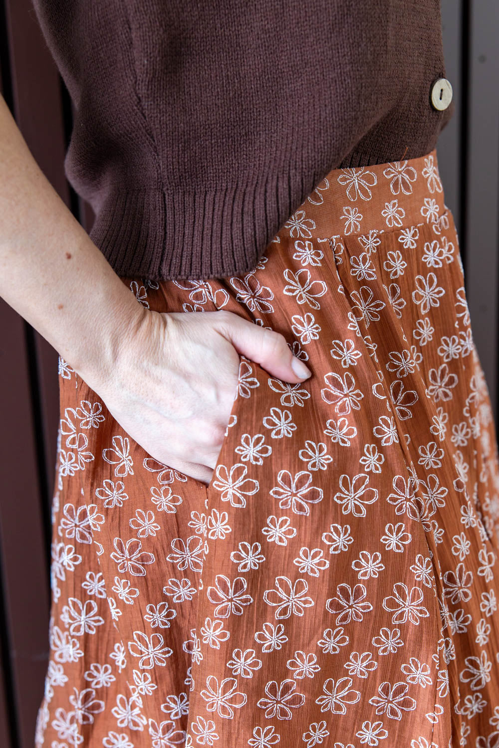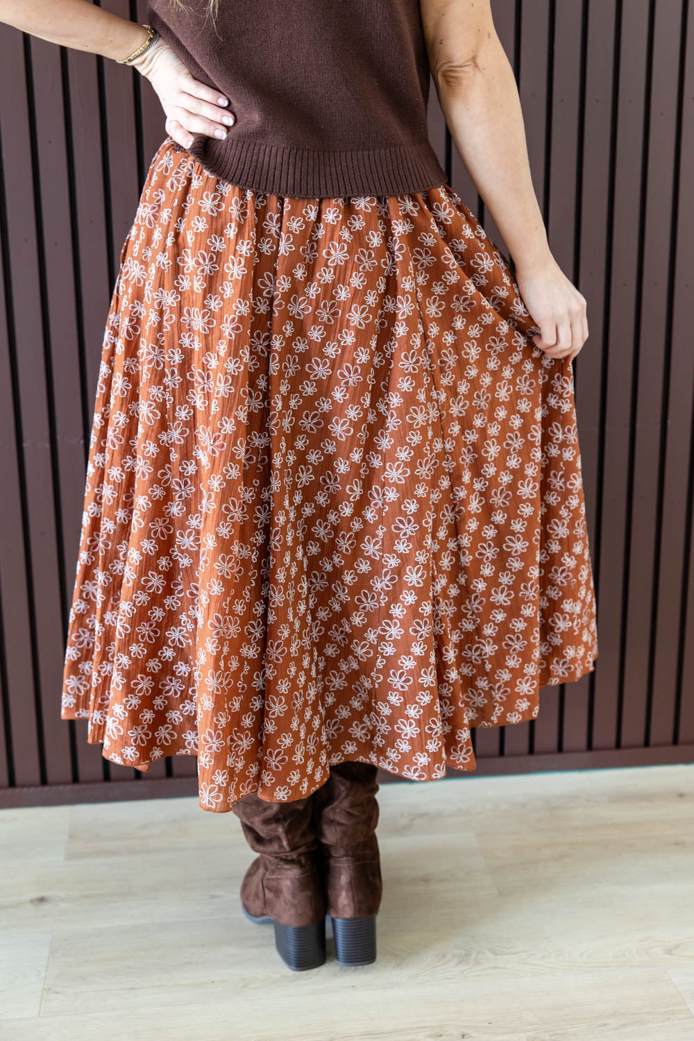 The Bloomy Babe Floral Midi Skirt brings flowy movement and soft texture to your wardrobe. Designed with a flattering A-line flare and comfortable elastic waistband, it offers ease without sacrificing style. The lightweight crepe material drapes beautifully, while functional side pockets add everyday practicality. A raised white floral pattern adds subtle texture against the rich rust background, creating a look that feels both grounded and feminine. Fully lined for coverage and comfort, this midi is perfect for dressing up or keeping it casual with your favorite basics.