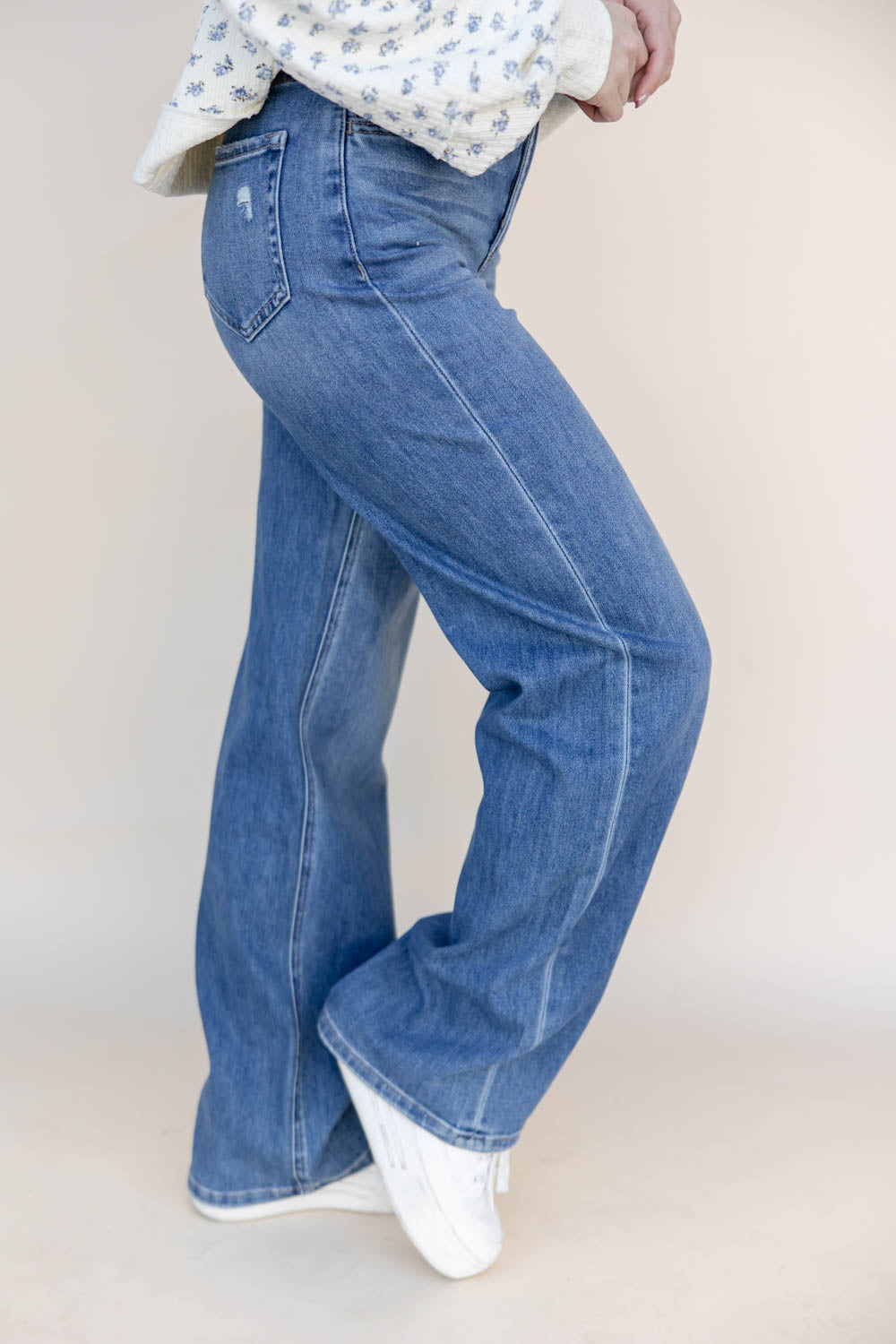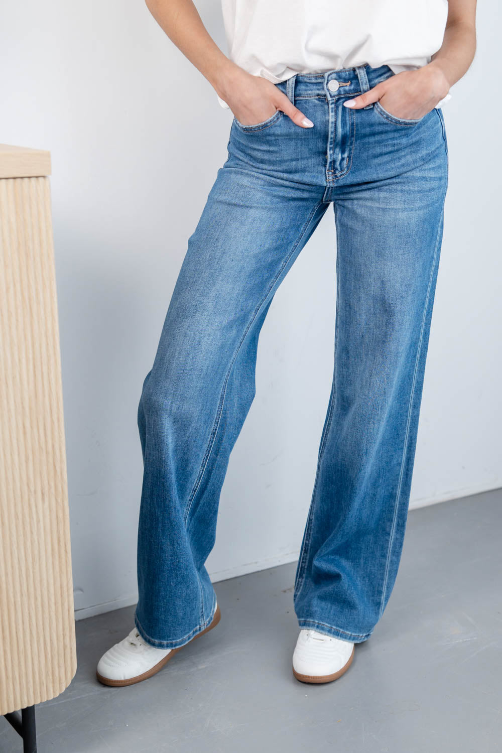 These Blue Crush jeans take high rise to new heights—literally. Crafted from soft, stretchy denim in a blue medium wash, they offer all-day comfort without sacrificing structure. The wide leg silhouette and finished hem keep things clean, while subtle distressing on the back pockets adds just a touch of edge. Finished with a classic button and zip closure, they're ready to pair with everything from tucked-in knits to oversized outerwear.