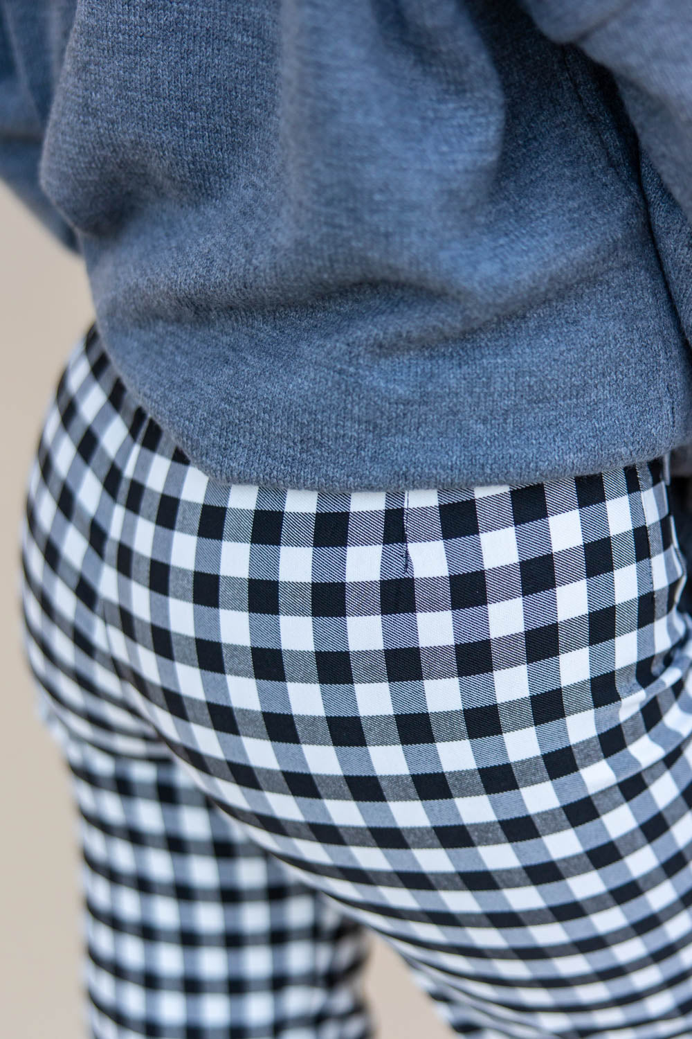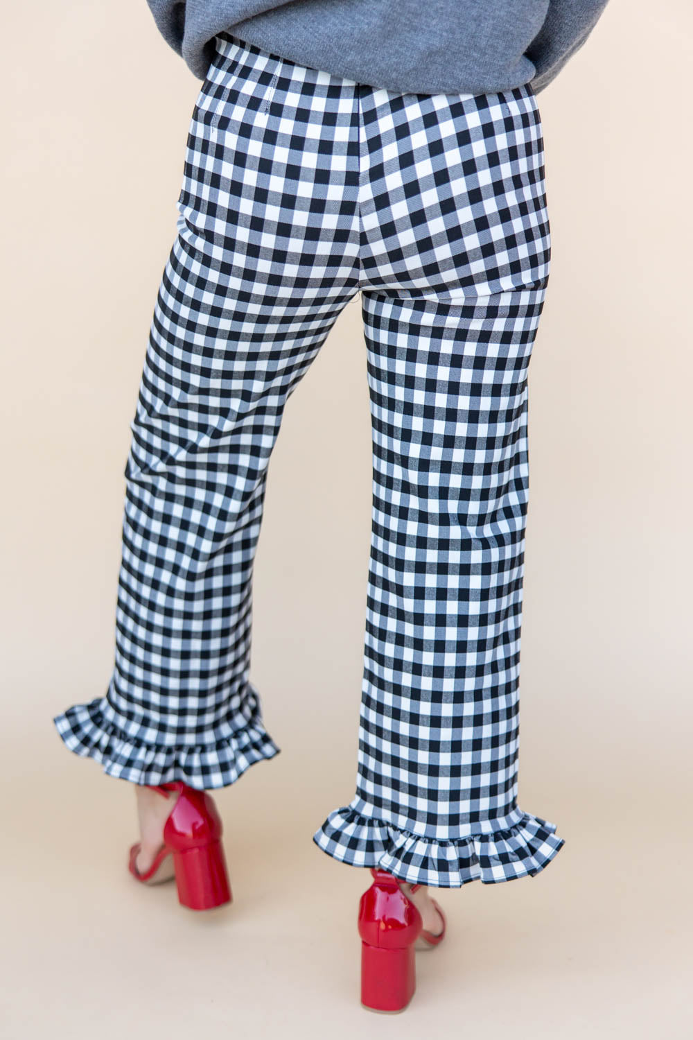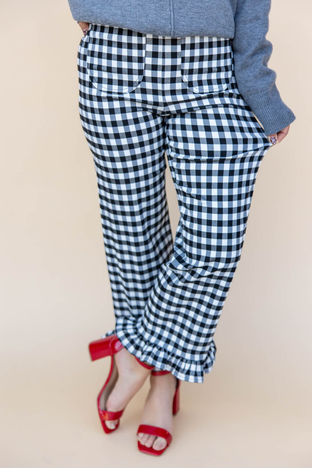 The Bold Blocks Ruffle Trim Pants serve up vintage charm with a playful twist. Designed with a flattering high rise and cropped straight leg silhouette, they feature front patch pockets and a hidden back zip closure for a clean finish. The standout detail? A ruffle-trimmed hem that adds a flirty, feminine edge to the classic gingham print. Pair them with a tucked-in sweater or a fitted blouse for a sweet-yet-bold everyday look.