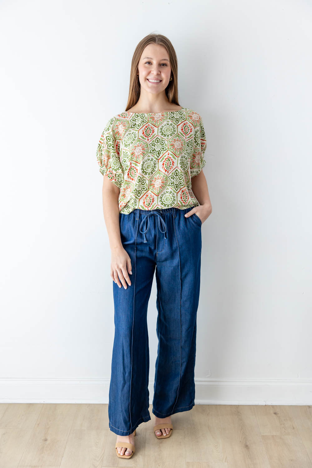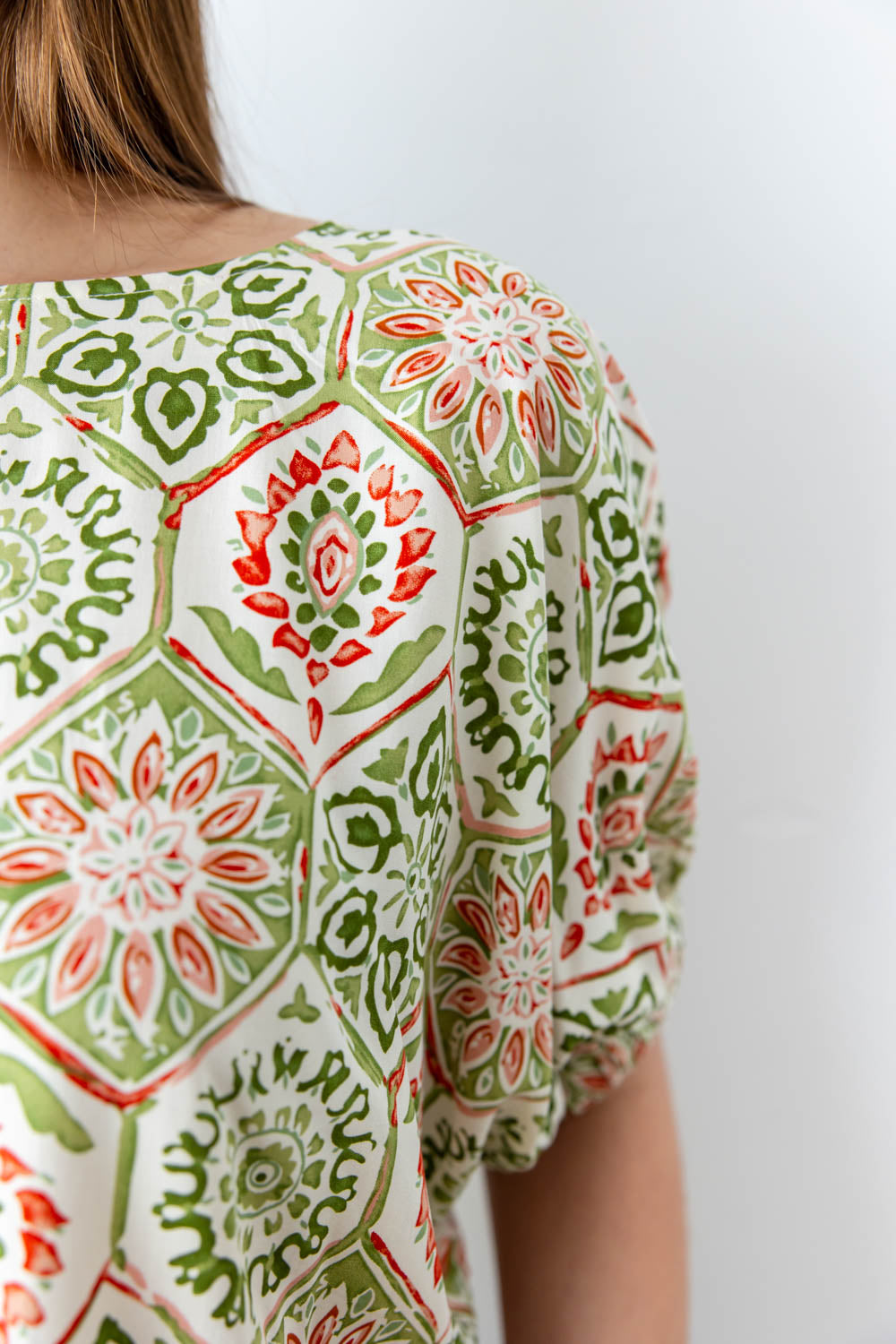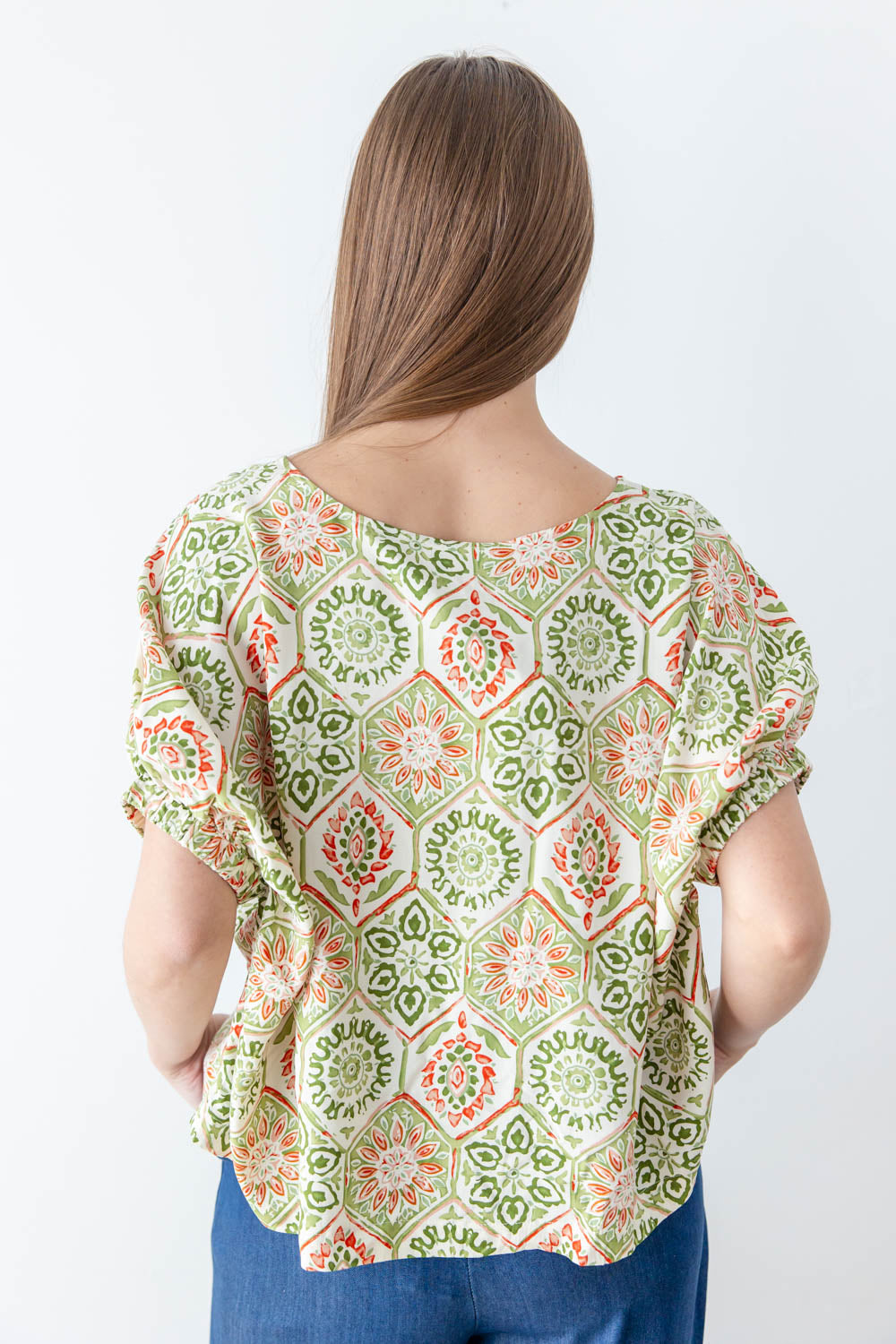 The Boldly Yours Dolman Sleeve Top brings vibrant energy and effortless comfort to your everyday wardrobe. Designed with a relaxed fit and waist-length cut, it drapes beautifully for a flattering, easygoing silhouette. The boat neckline adds a touch of elegance, while half dolman sleeves with elastic cuffs give it a soft, gathered shape. Made from lightweight fabric, it feels breathable and breezy for all-day wear. The green and orange geometric floral print adds a bold pop of color, making this top perfect for everything from weekend plans to casual workdays.