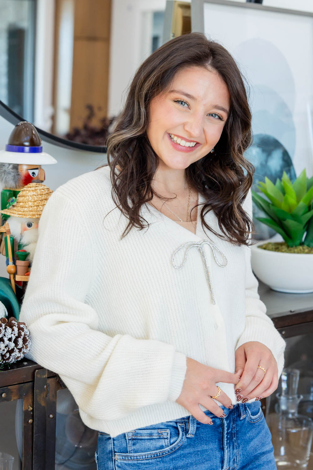 The Bow Behavior Rhinestone Sweater Cardigan is where cozy meets a little holiday sparkle. With a relaxed fit and semi-cropped length, it’s made to sit just right with high-rise denim or a festive midi. The mid-weight rib knit keeps you warm without the bulk, while the rhinestone bow detail at the front adds that perfect touch of glam. Baggy long sleeves with chunky ribbed cuffs give it a laid-back, luxe feel, and the hidden button front keeps the focus on that dazzling bow. It's the kind of sweater that makes you feel dressed up even when you're just heading out for cider and lights.
