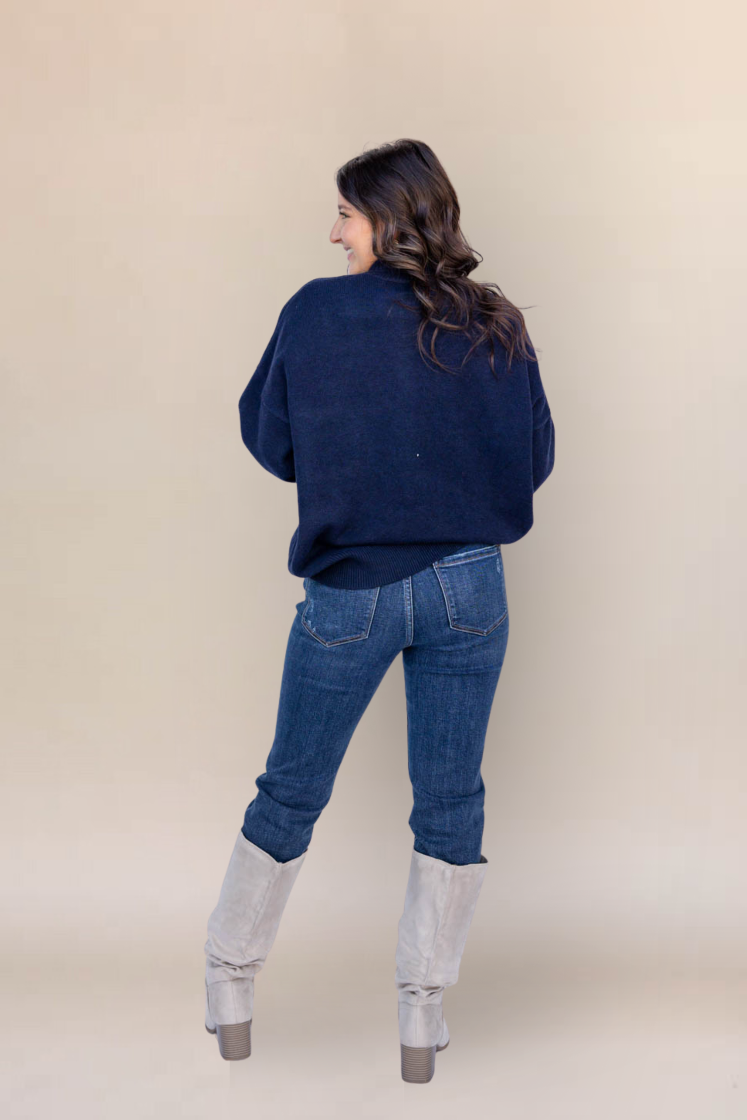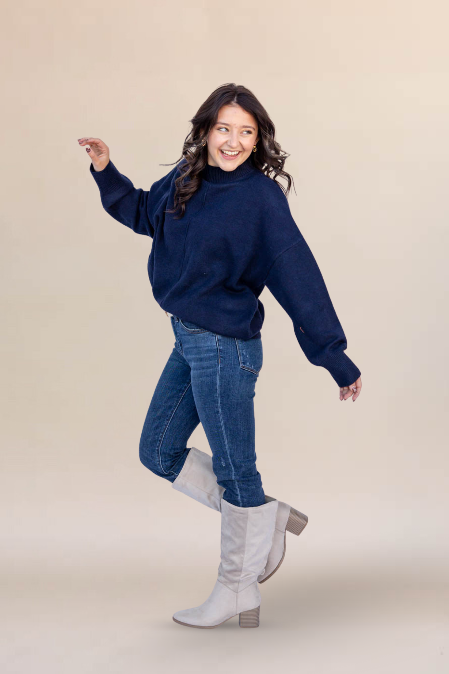 The Gentle Knit Oversized Sweater delivers cozy comfort with elevated simplicity. With an oversized fit and hip-length cut, it’s perfect for easy layering or solo wear. The mock neckline and drop shoulders give it that relaxed feel, while the front seam detail adds a subtle, structured touch. Crafted from a mid-weight knit and finished with ribbed trim at the hem, sleeves, and neckline, this sweater is a seasonal staple with effortless appeal.