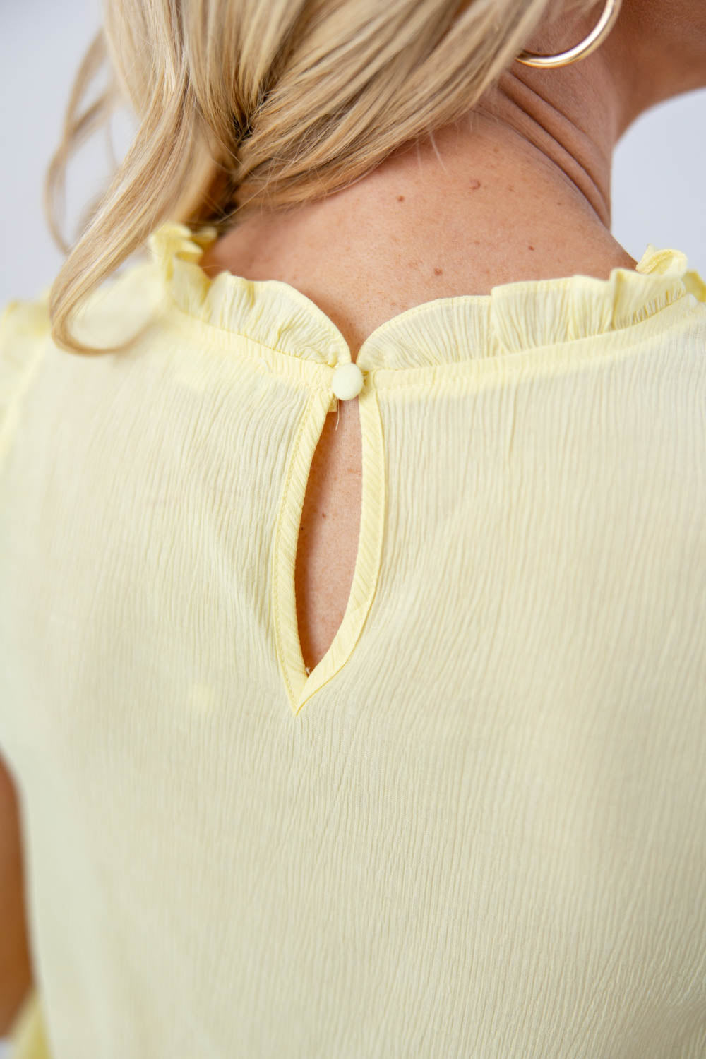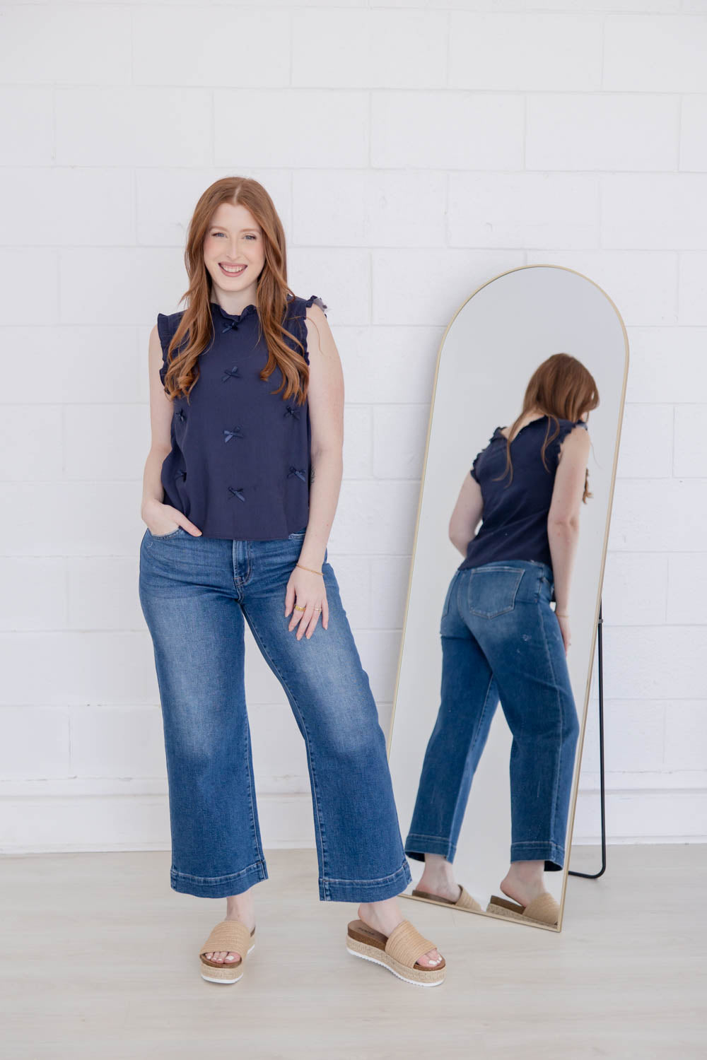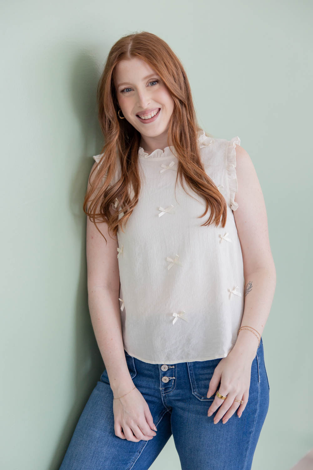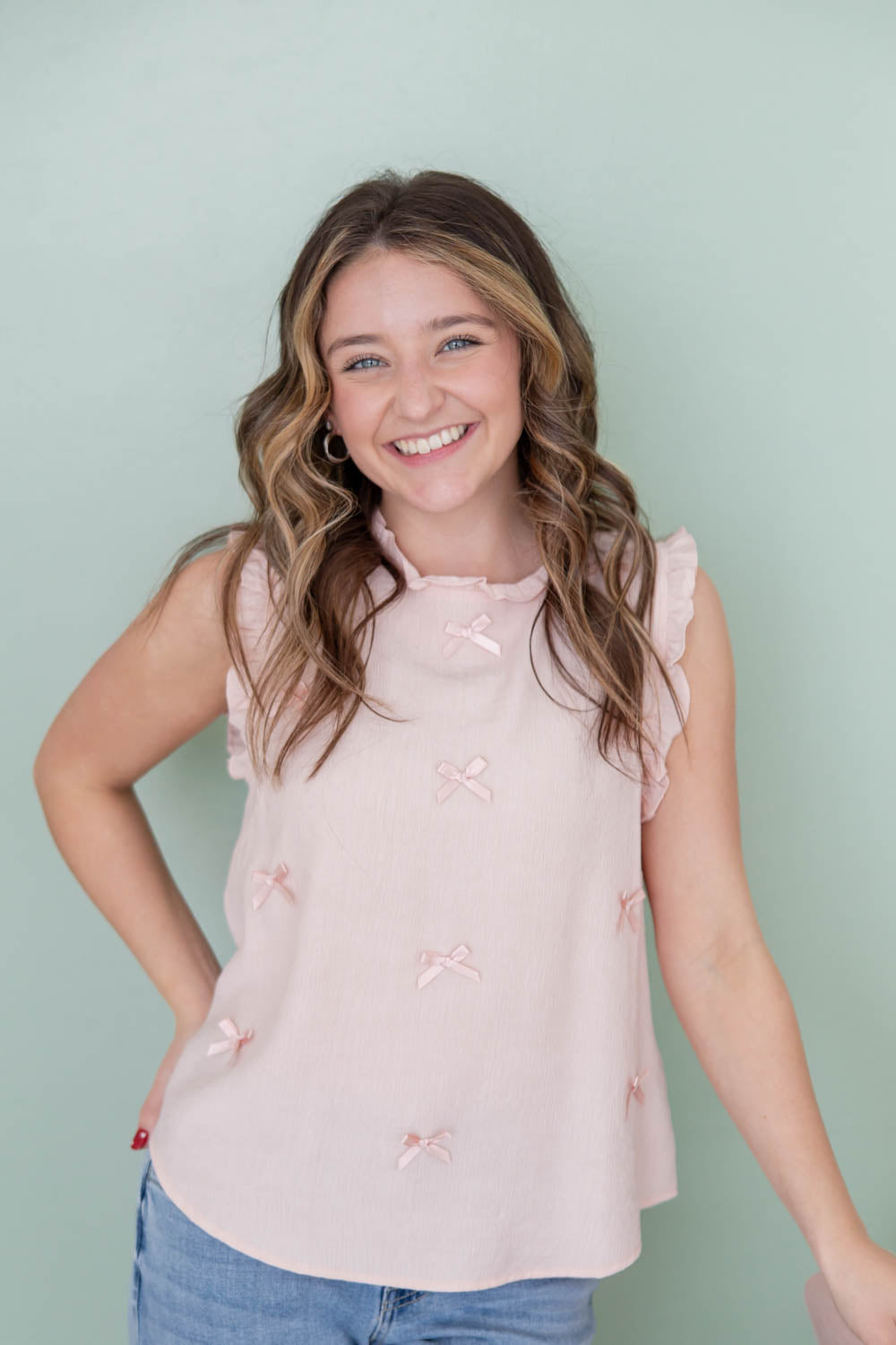 The Bowtiful Day Sleeveless Ruffle Trim Top brings a soft, feminine feel that still fits into real life. The flowy, true to size fit drapes easily without overwhelming your shape, while the barely cropped length pairs perfectly with high rise denim and skirts. Lightweight crepe fabric keeps it breathable and comfortable, and the sleeveless cut makes warm days feel effortless. Ruffle trim along the neckline and sleeves adds gentle movement, and the front bow appliques give it a playful finish that feels special without trying too hard.