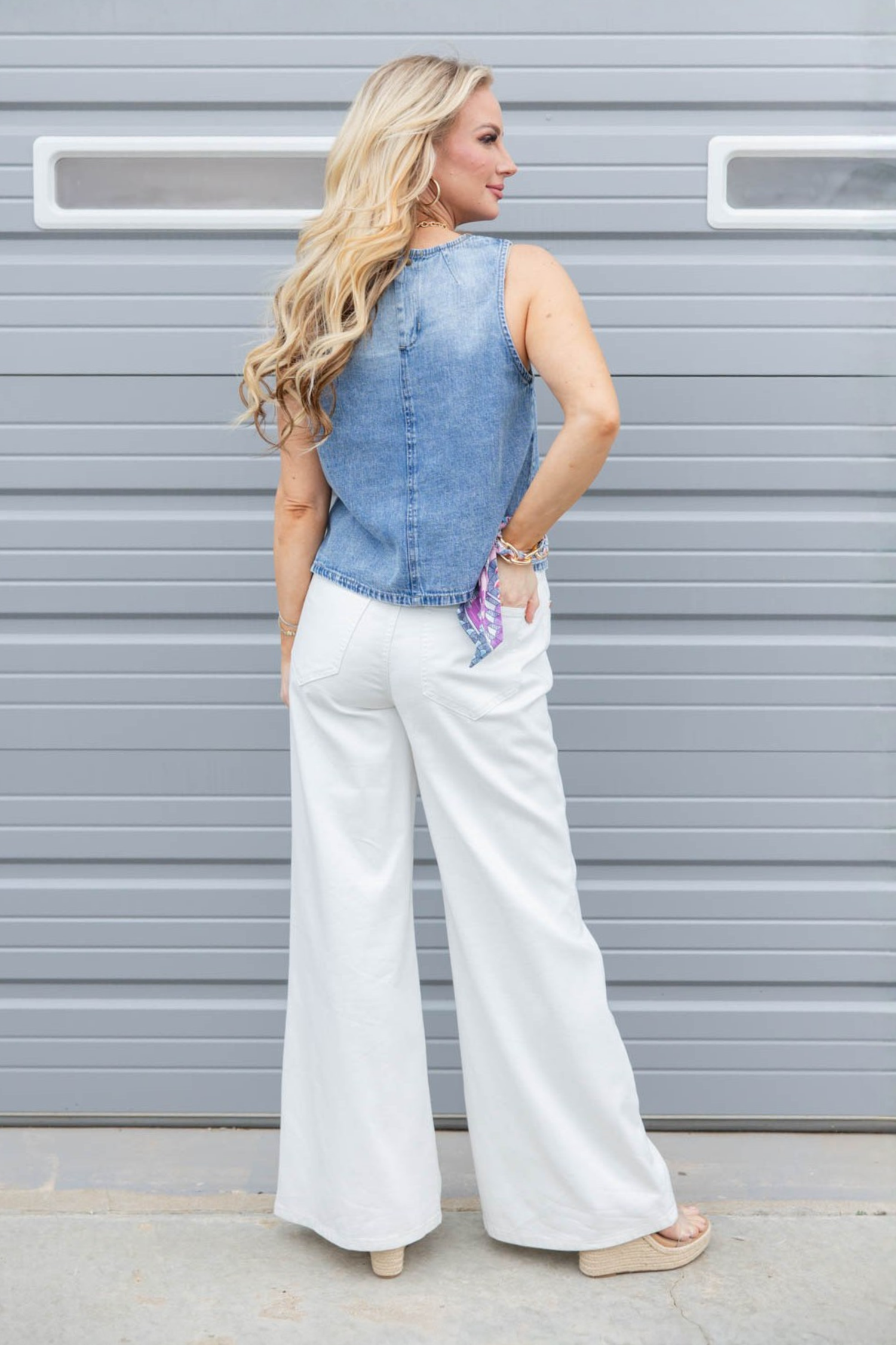The Howdy Honey Sleeveless Top gives you structure with a flattering shape. The true to size A-line fit skims comfortably, while the cropped length pairs perfectly with high rise denim. A sleeveless cut keeps it cool and easy to layer, and the crew neckline offers a clean, classic finish. Front seam detailing adds subtle shape, and the vintage wash denim gives it that lived in feel you love. Finished with a back button closure and designed to pair with the matching skirt or fresh white denim for a pulled together look.