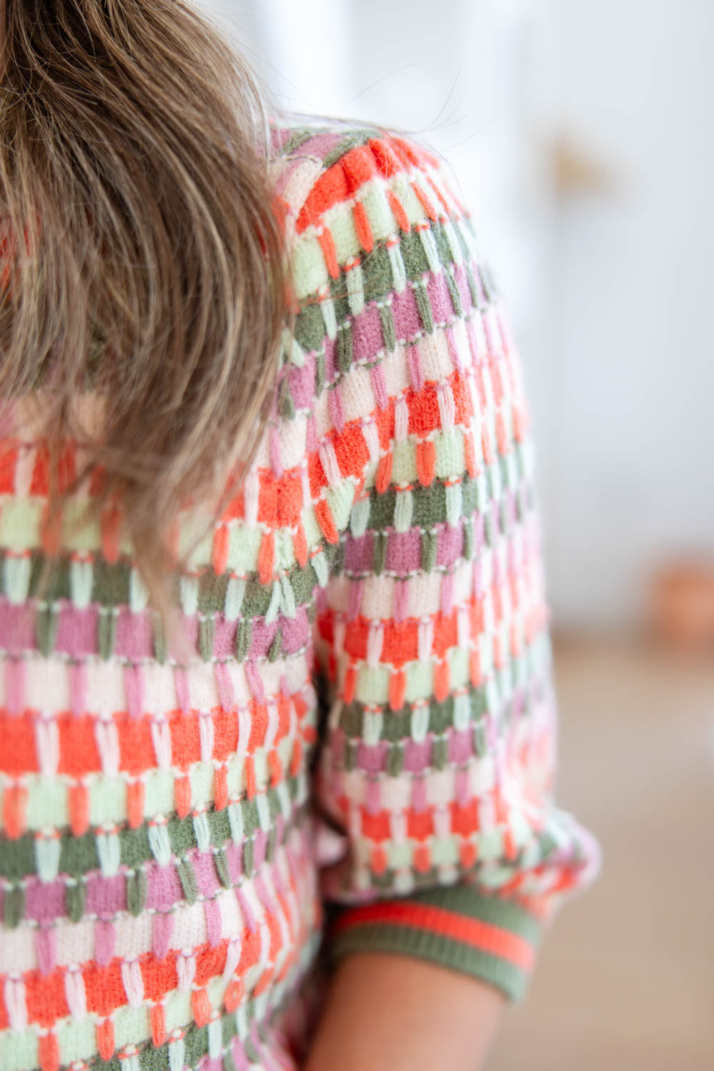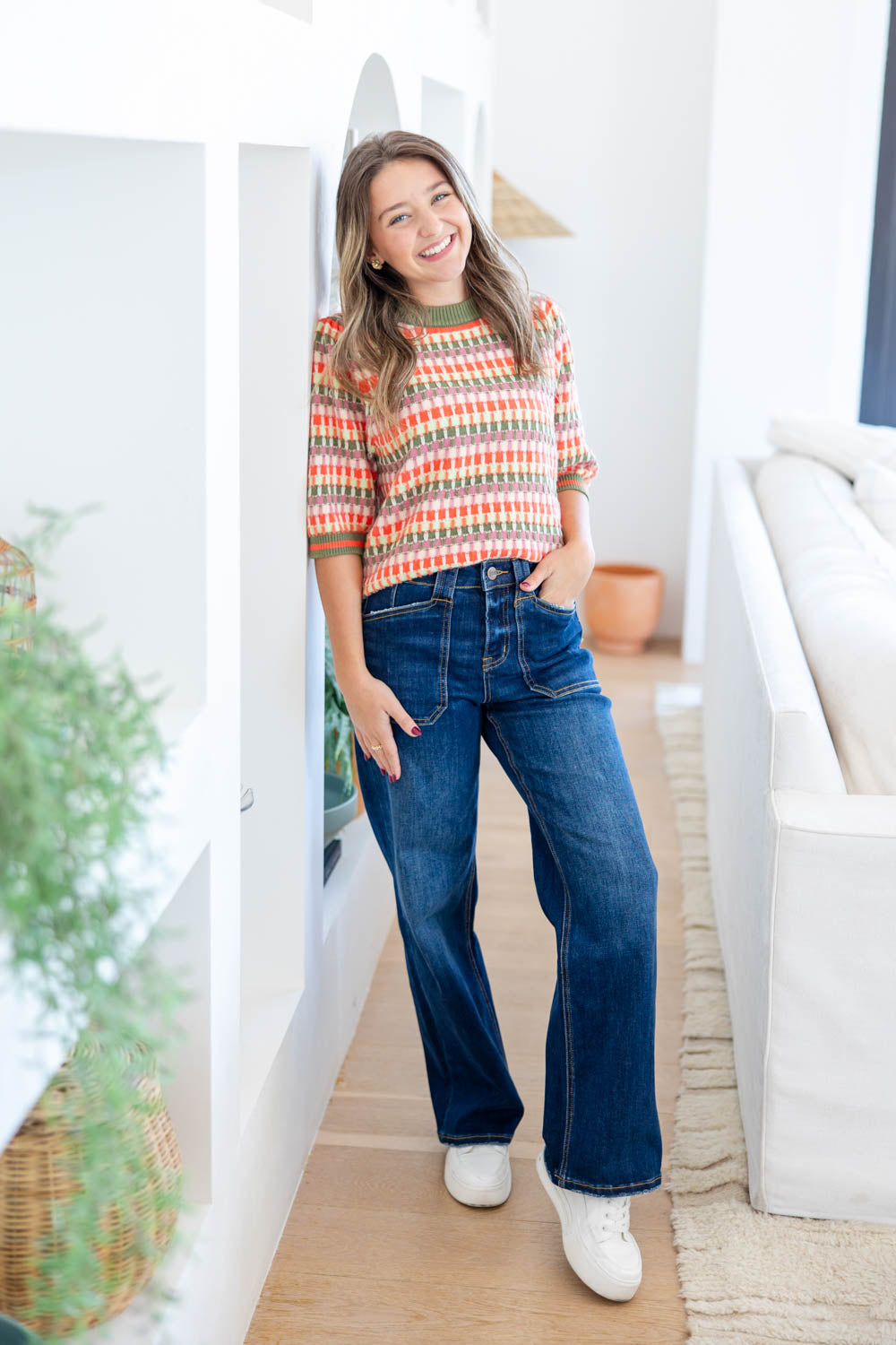 The Bright On Time Multicolor Sweater brings texture and color into perfect harmony. With a true-to-size fit and midweight feel, it features a vibrant multi-color basketweave pattern that adds dimension without overwhelming. The ribbed crew neckline, hem, and cuffs keep the silhouette classic, while 3/4 sleeves make it perfect for transitional days. Pair it with straight-leg denim or a sleek midi skirt for a playful-yet-polished look.