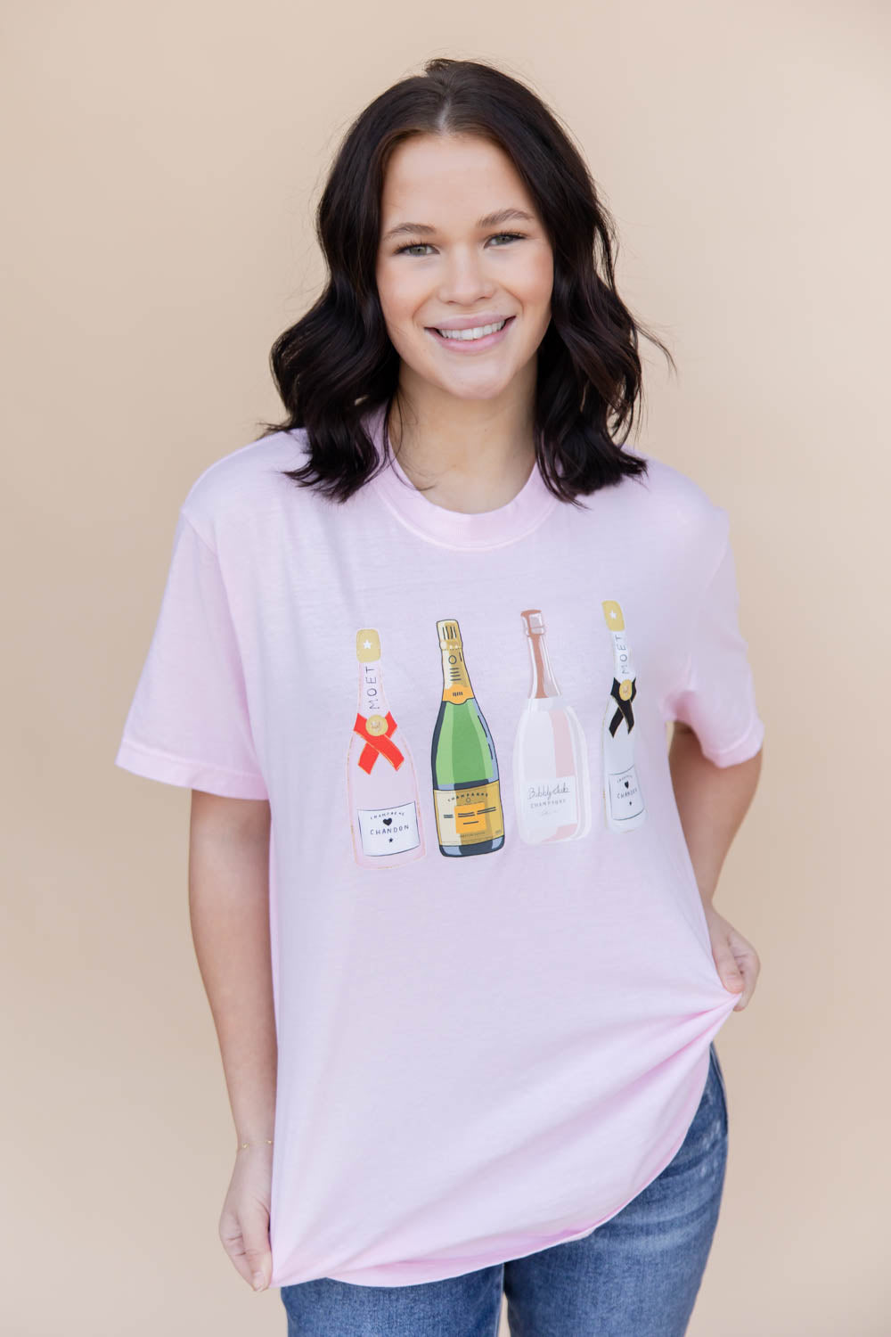The Champagne Mood Graphic Tee is all about laid-back luxury with a playful twist. Designed in a relaxed, true to size fit and made from soft, flexible cotton, this hip-length tee keeps things comfy while bringing a little fizz to your look. The short sleeve style and lived-in feel of the pink Comfort Colors fabric make it an easy everyday favorite, while the front graphic featuring champagne bottles adds a fun, celebratory touch. Whether you're brunching, lounging, or just feeling bubbly, this tee is ready to toast to good vibes.