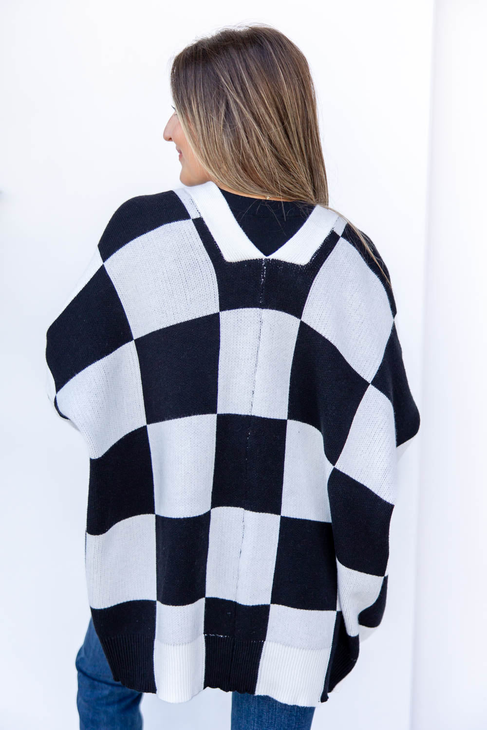 The Check Her Out Button Down Cardigan brings bold pattern and effortless layering into one standout piece. With an oversized fit and longline length, it’s perfect for throwing over leggings, bike shorts, or slim denim. The deep V-neck and button front closure keep things relaxed, while drop shoulders and ribbed cuffs add to the cozy feel. Finished with front welt pockets and a bold checkered print, it’s the kind of piece that does the styling work for you, just add boots and go.