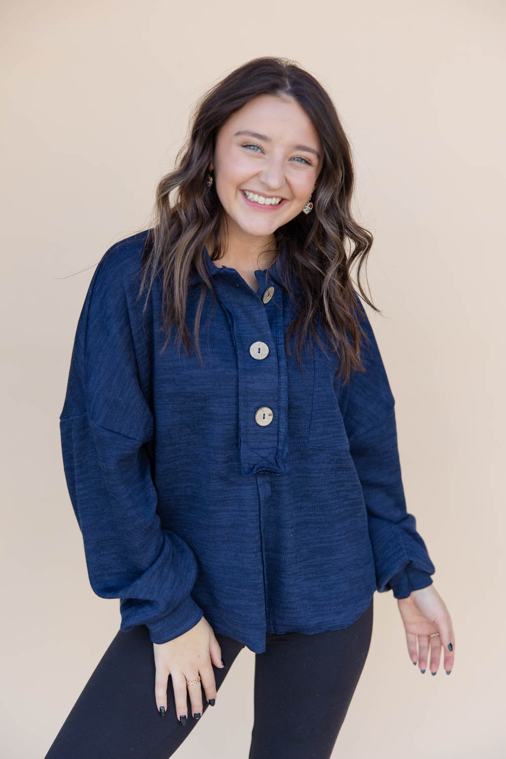 The Classic Comfort Long Sleeve Collared Knit Top is your easy answer to laid-back layers with a little edge. Designed with a relaxed fit and hip length cut, it features a curved front and back hem that adds shape without trying too hard. The oversized button front placket gives it a cool, undone feel, while raw hems and front seam detailing bring just the right amount of lived-in charm. Baggy long sleeves and a single front pocket keep things casual and functional, making this top a throw-on-and-go favorite whether you're lounging, layering, or running out the door.