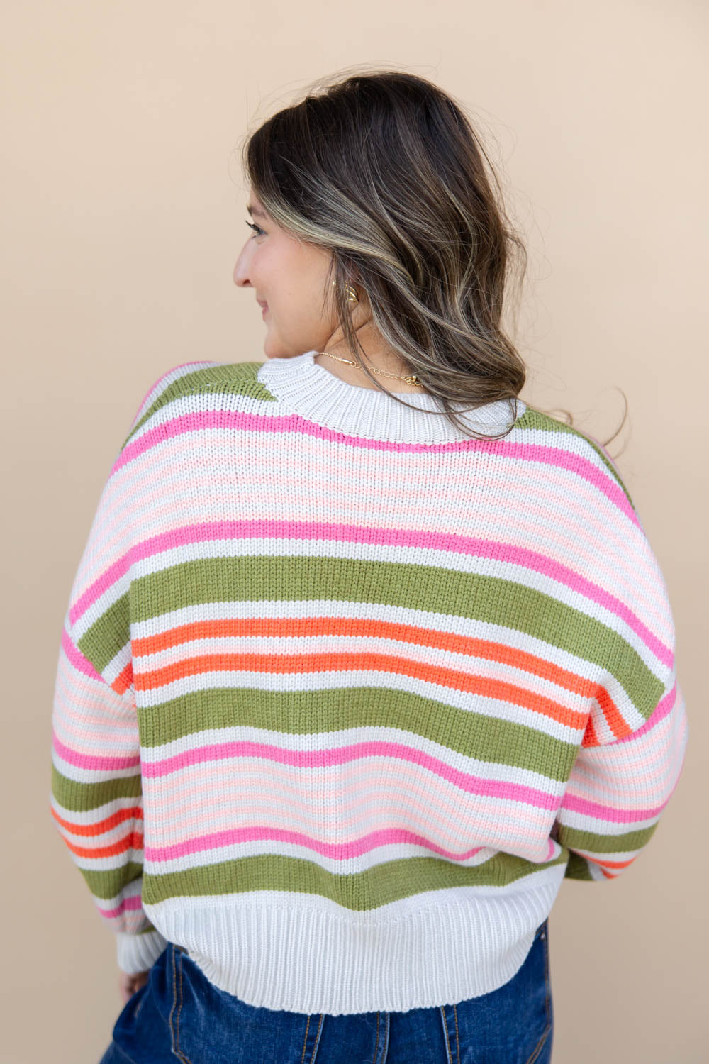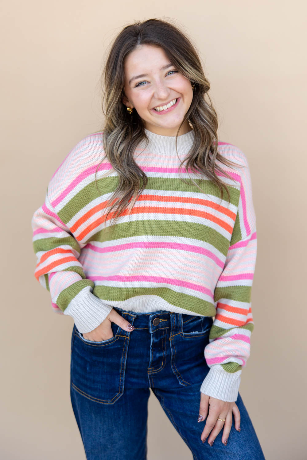 The Colorway Crush Knit Sweater adds a playful pop to your cool weather rotation. With a true to size fit and semi-cropped length, it offers a flattering silhouette that pairs effortlessly with high-rise denim or trousers. The mock neckline and mid-weight knit keep you cozy, while ribbed detailing at the neck, hem, and cuffs adds a polished finish. Featuring a cheerful mix of green, pinks, orange, and cream stripes, it’s an easy way to brighten up layered fall and winter looks.