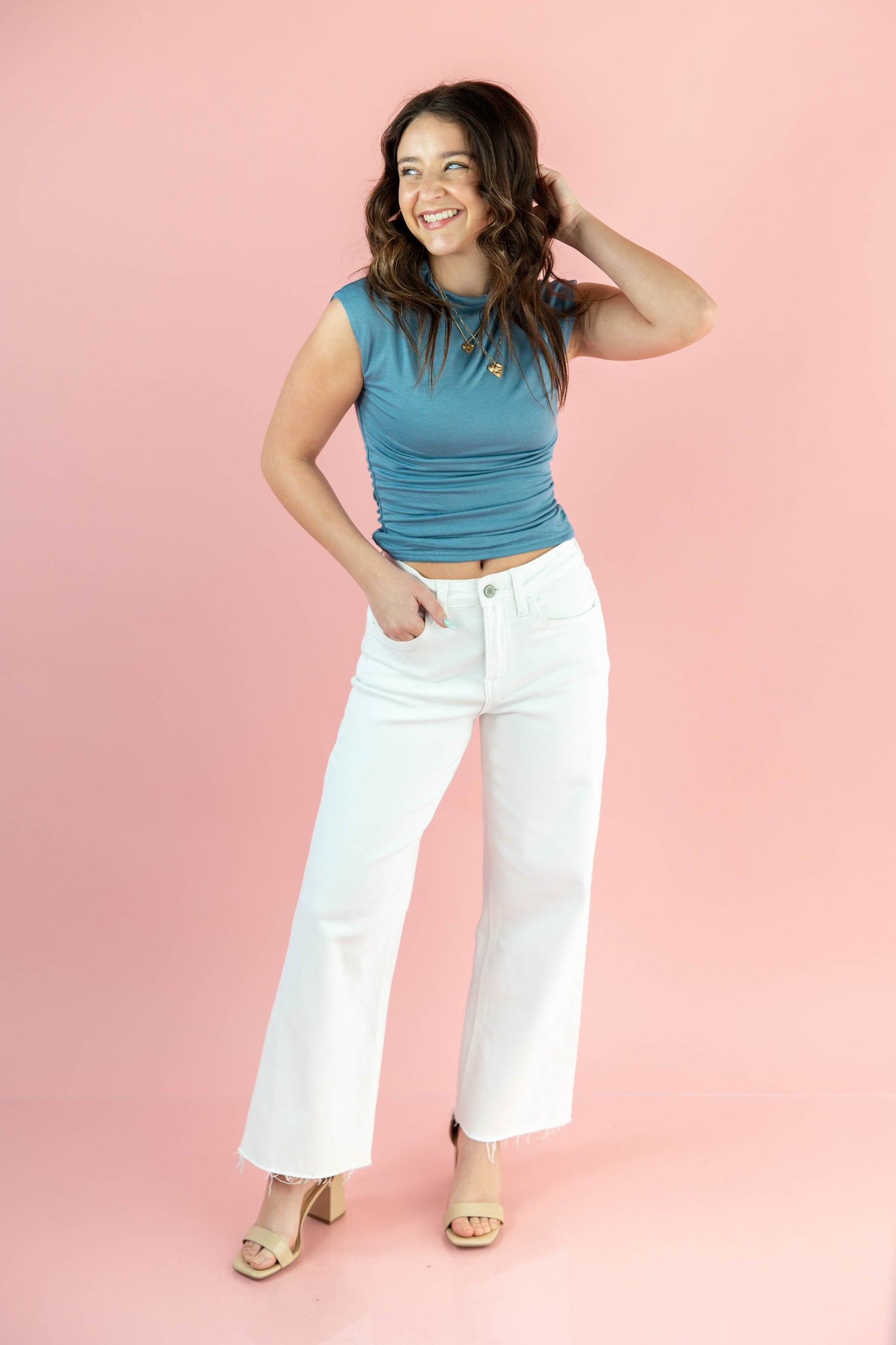 The Daily Classic Sleeveless Knit Top is sleek, stretchy, and designed to flatter. With a fitted, true to size cut and semi-cropped length, it hugs your shape while offering a clean, modern silhouette. Ruched sides create subtle texture and define the waist, while the mock neckline and slight cap sleeves add structure without bulk. Fully lined and made from soft, stretchy material, it moves with you and feels comfortable from day to night — perfect for layering or wearing solo.