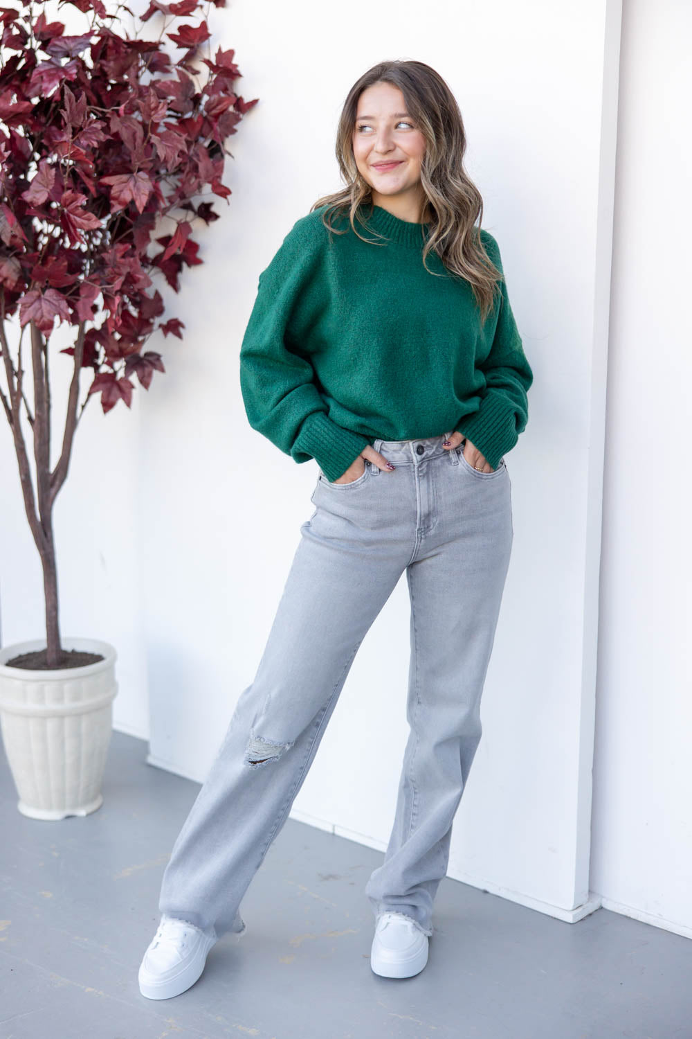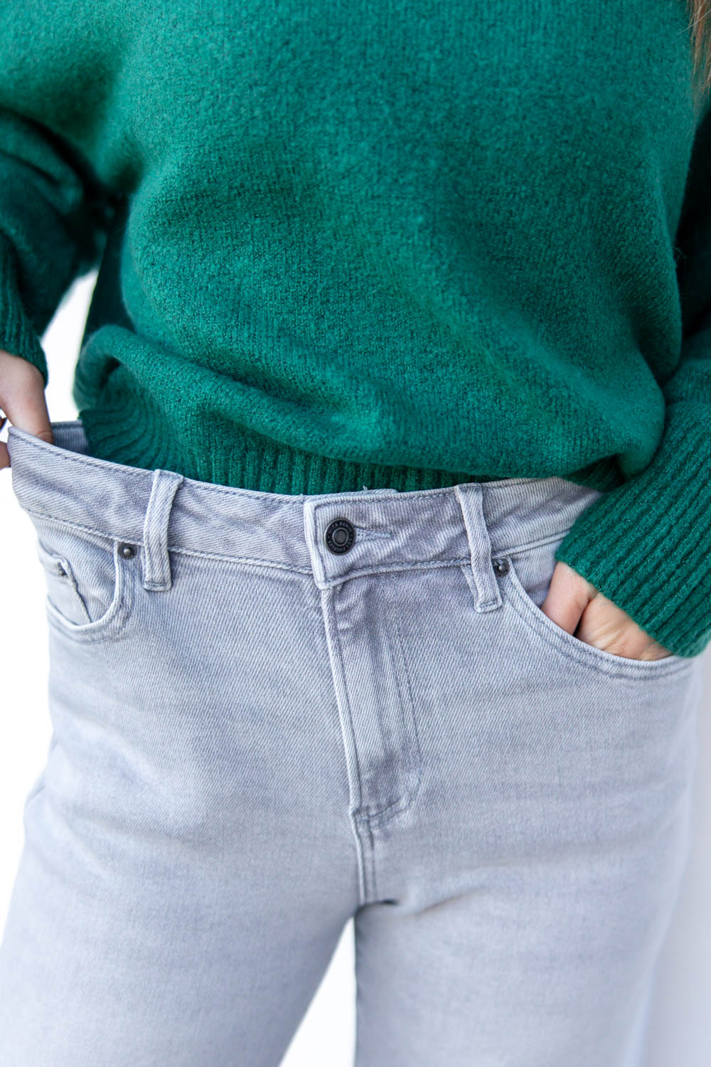 The Drama Queen Wide Leg Jeans bring a fresh edge to your denim lineup. With a flattering high rise and light gray wash, they strike the perfect balance between soft and bold. The wide leg silhouette offers relaxed movement, while a distressed knee and frayed hem add lived-in character. Finished with a classic button and zip closure, these jeans pair effortlessly with everything from cozy knits to structured tops for that cool, undone look.