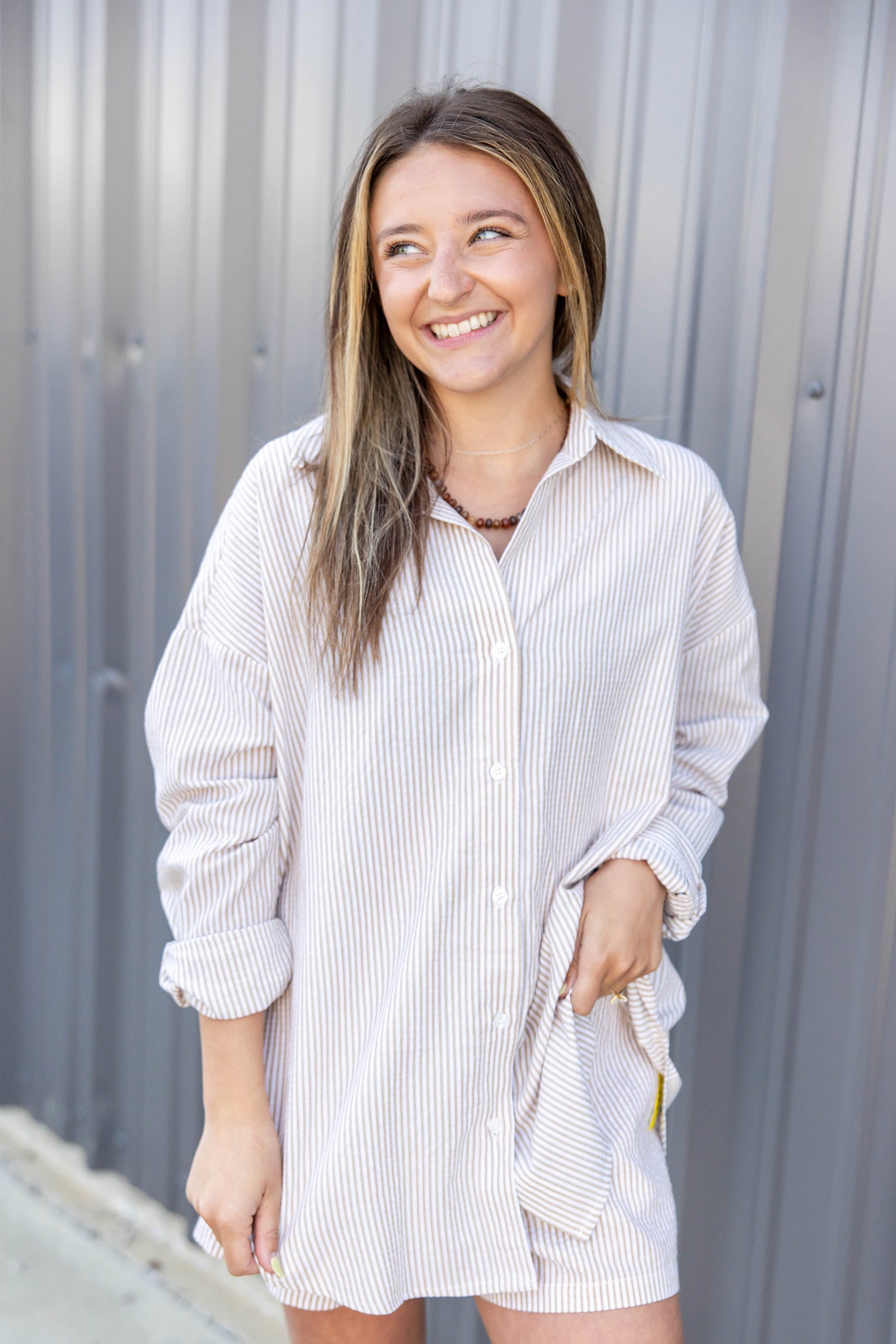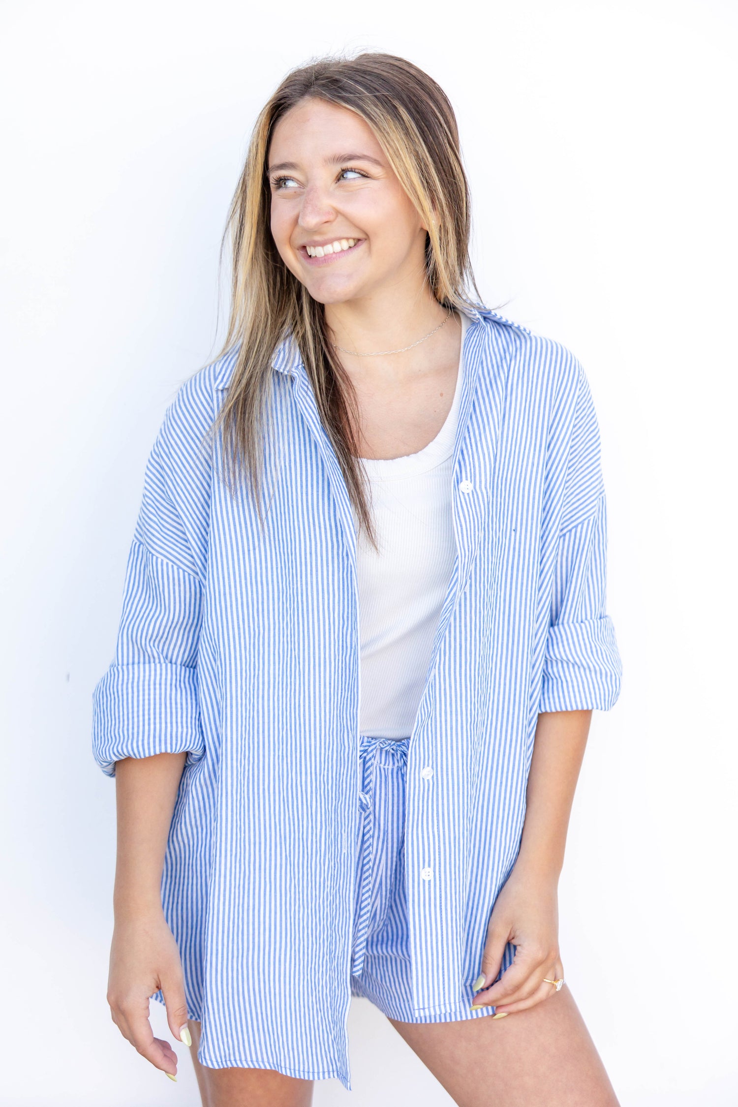 The Dream Darling Striped Long Sleeve Button Down Top is the effortless layer your warm weather wardrobe needs. The oversized fit and tunic length create a relaxed, easy drape that feels breezy and flattering. A collared button front adds timeless structure, while long sleeves with button cuffs give you styling flexibility. Crafted from lightweight seersucker fabric, it stays breathable and comfortable all day. Finished with vertical stripes that elongate your look, it is perfect worn loose, layered, or paired with the matching Dream Darling Striped Shorts for a coordinated set.