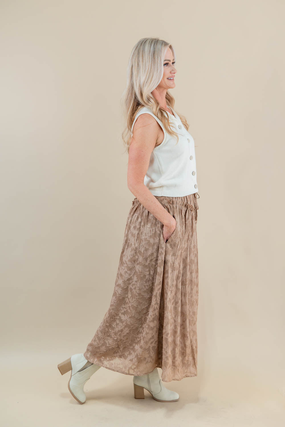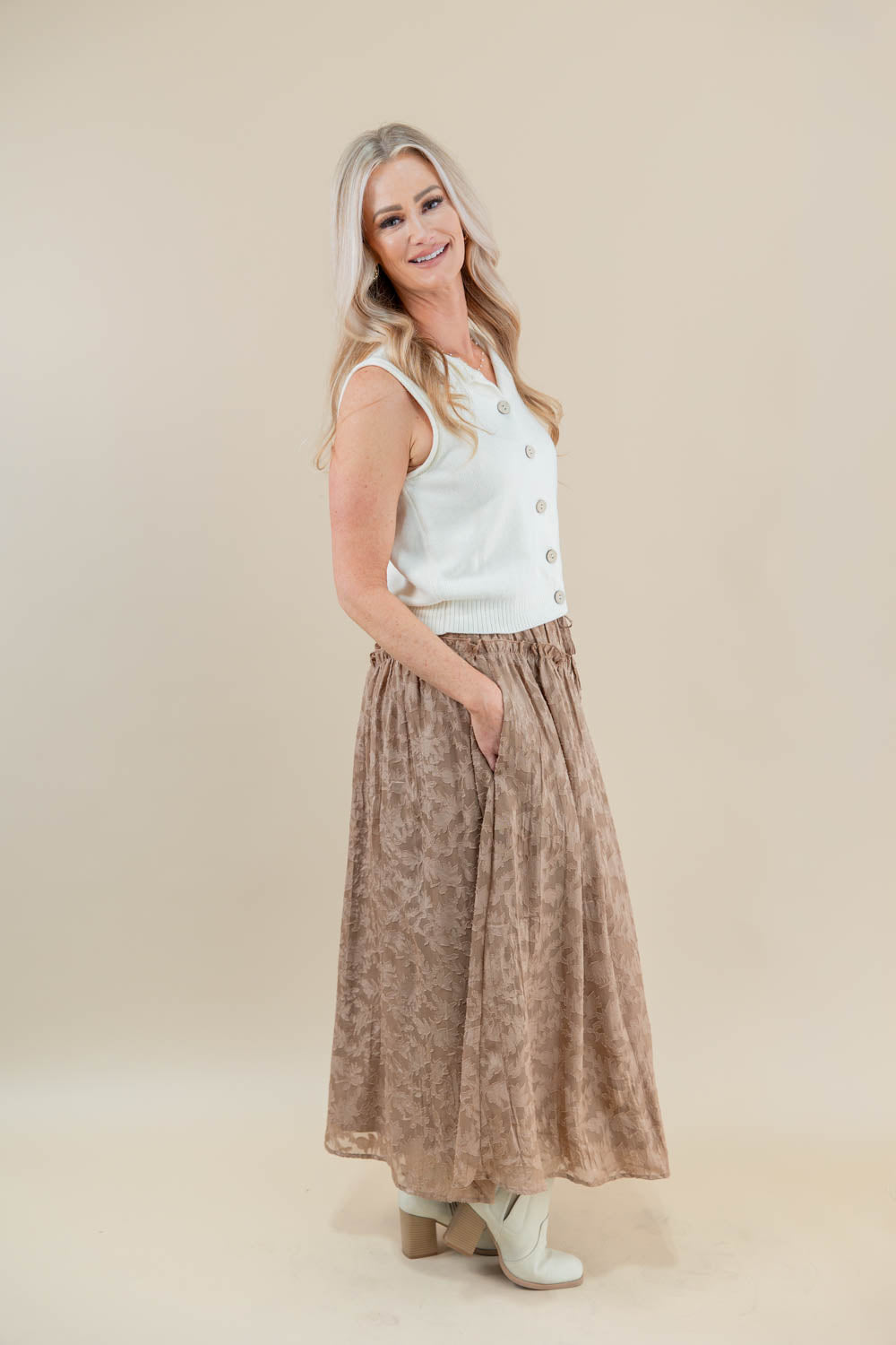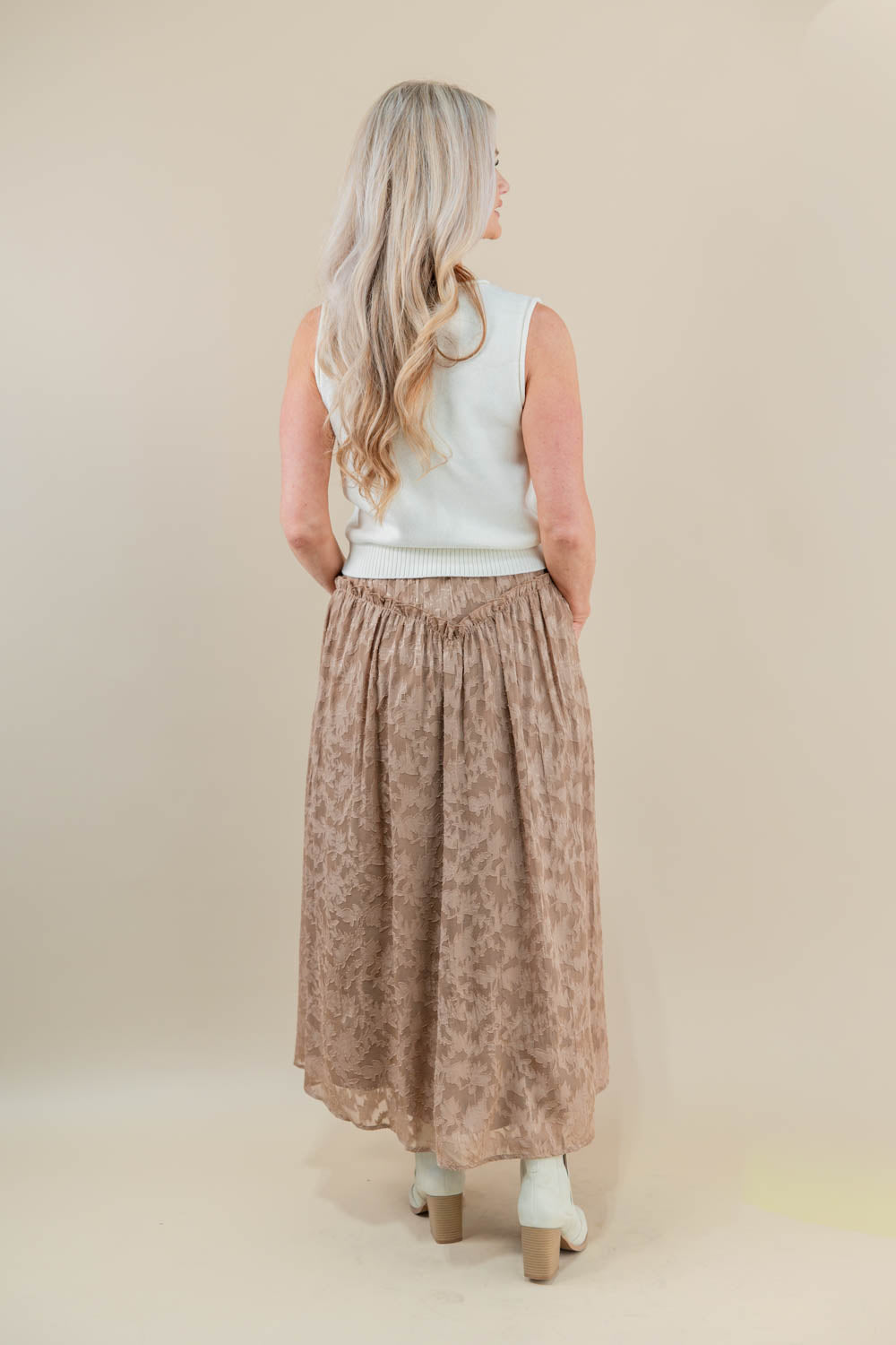 The Sweet Mirage Floral Textured Maxi Skirt is made for those twirl-worthy moments and easygoing days. With a flowy A-line cut and relaxed fit, it drapes beautifully without feeling bulky. The elastic and drawstring waistband gives a custom feel, while the ruffle trim adds a soft, romantic detail right below the waist. Allover floral burnout fabric gives texture and movement, and yes — it has side pockets. Fully lined and effortlessly versatile, it's ready for anything from coffee dates to spontaneous getaways.