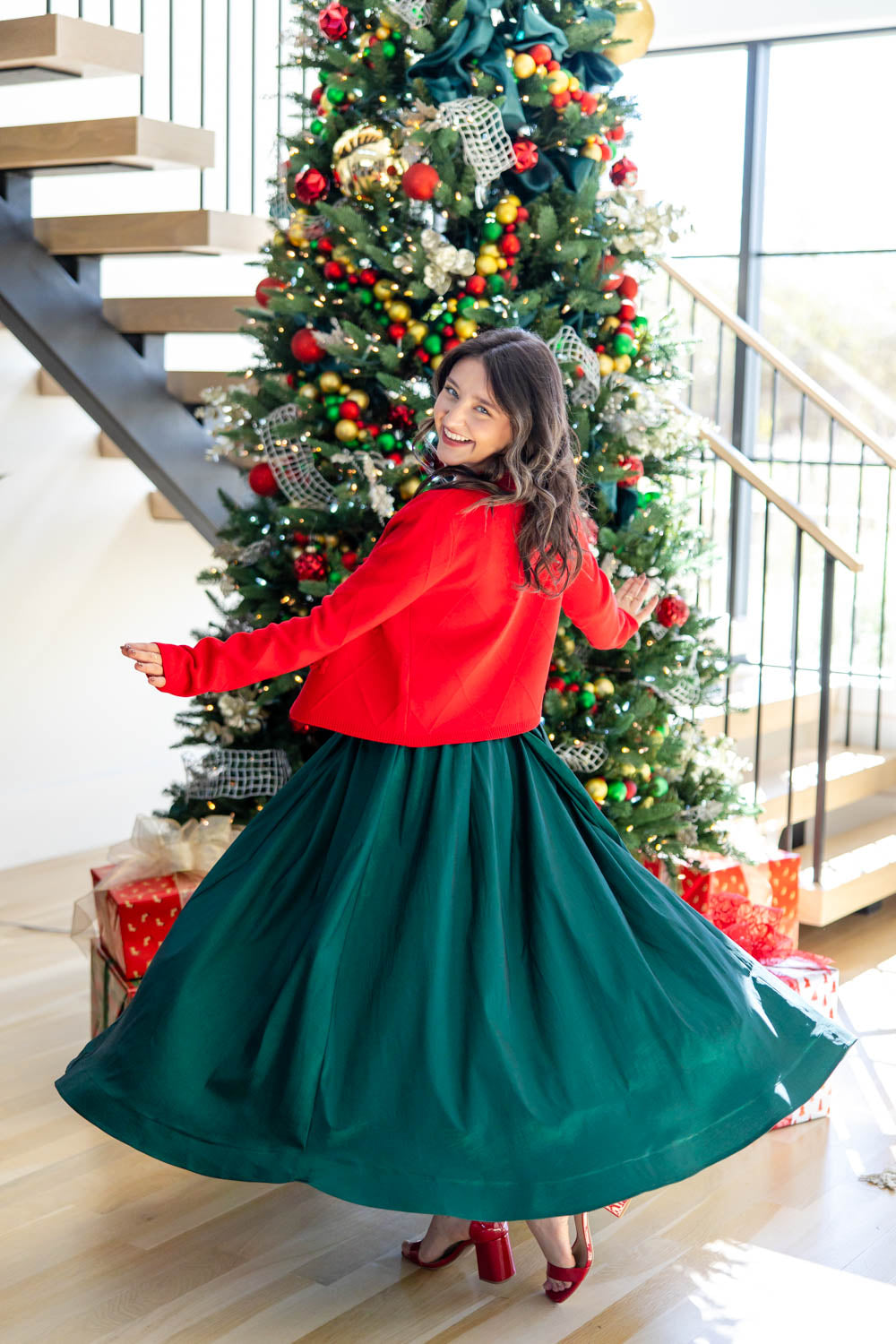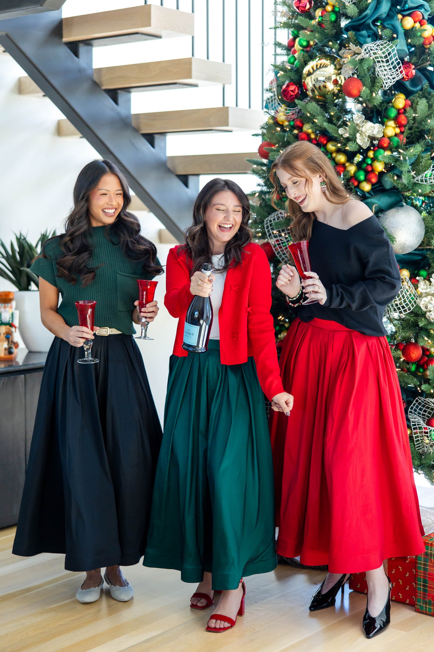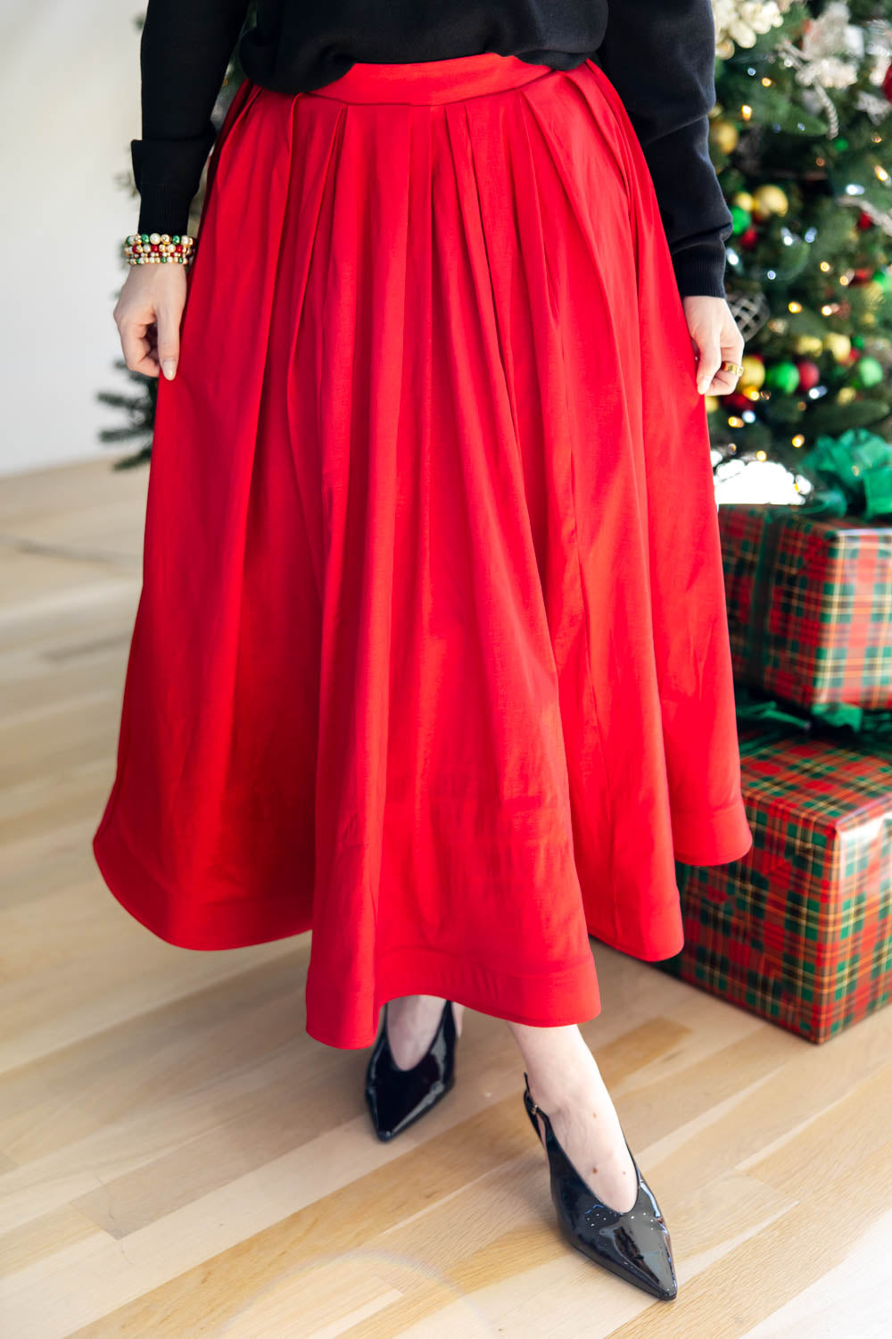 The Evening Ease Maxi Skirt is your go-to for making an entrance this season. With its structured A-line silhouette and crisp pleated taffeta fabric, it brings all the festive drama, in the best way. The maxi length adds elegance, while the crinoline hem gives it that subtle volume that swishes with every step. A back zip closure keeps the fit sleek and secure, and the unlined finish makes it light enough to move in, yet bold enough to stand out. Pair it with a simple sweater or glam it up with a sparkly top—either way, this skirt is made to shine.