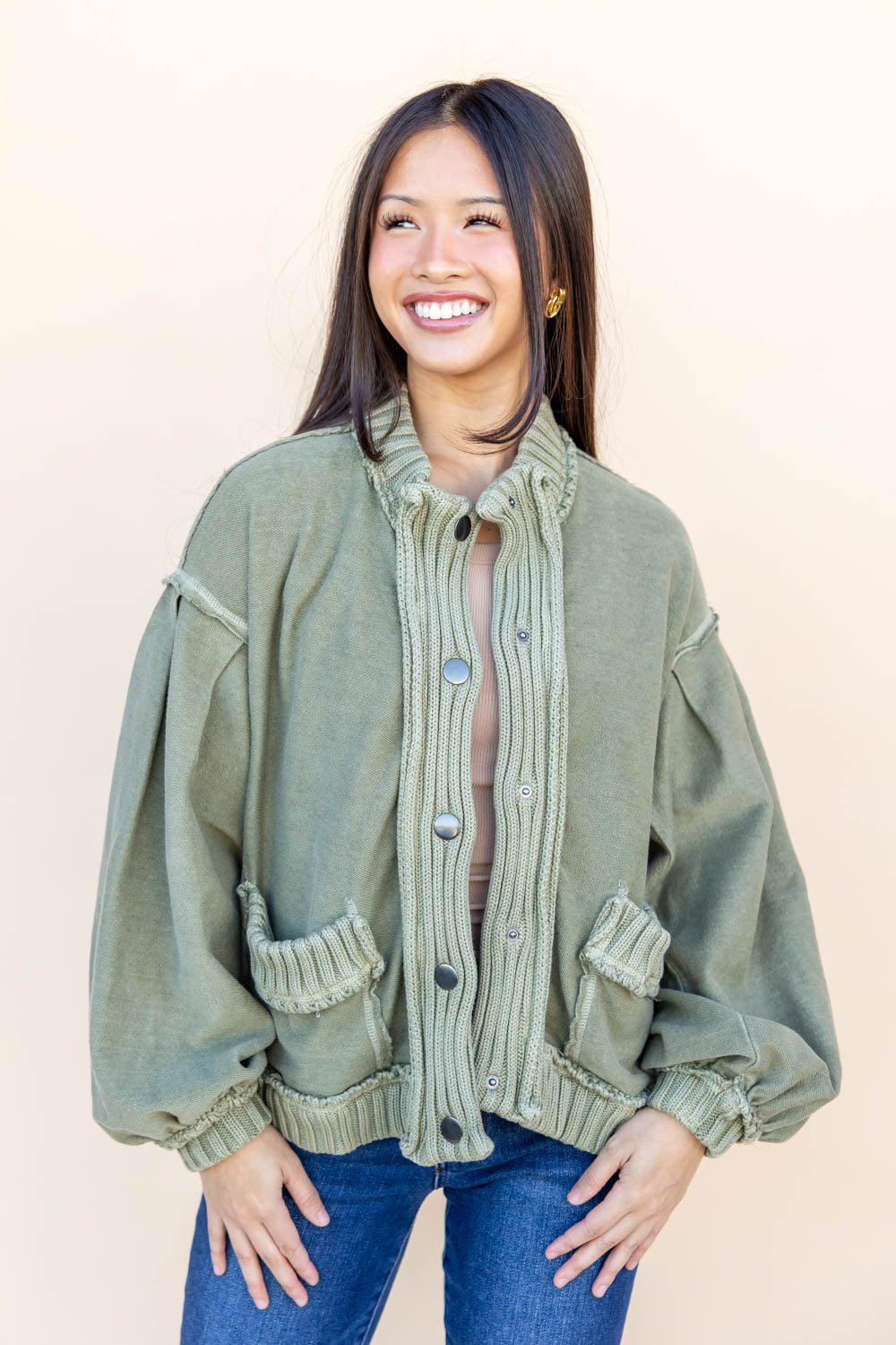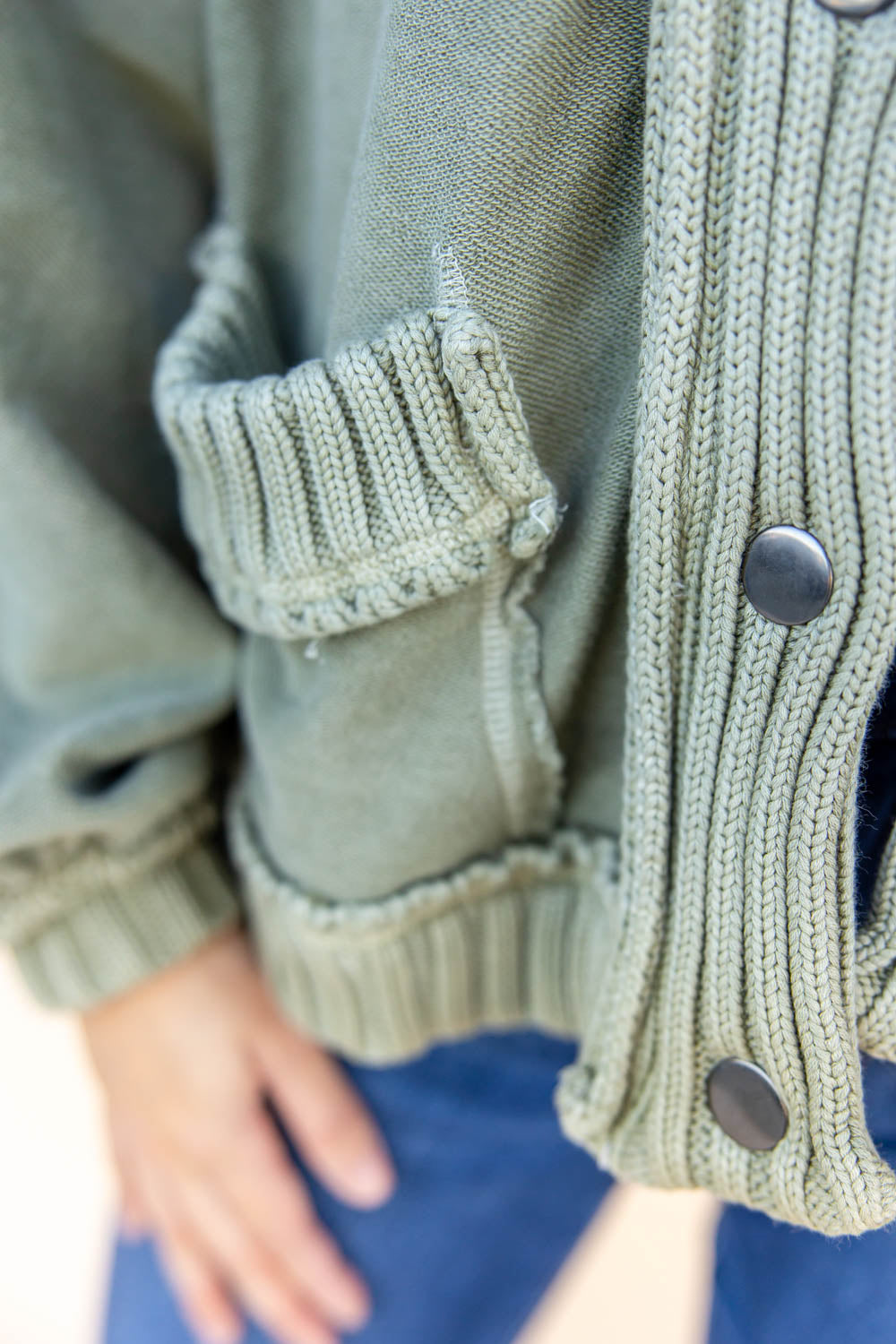The Faded Romance Knit Button Down Jacket is the ultimate blend of laid-back and standout. With its relaxed fit and hip-length cut, it layers effortlessly over anything in your closet. The vintage wash gives it that perfectly broken-in look, while the snap button closure and front patch pockets keep it casual and functional. Drop shoulders and exaggerated bishop sleeves add volume and style, finished off with rib knit trim at the neckline, placket, cuffs, and hem for a cozy, structured touch. It’s the cardigan-meets-jacket piece you’ll throw on for everything from morning coffee runs to evening strolls.