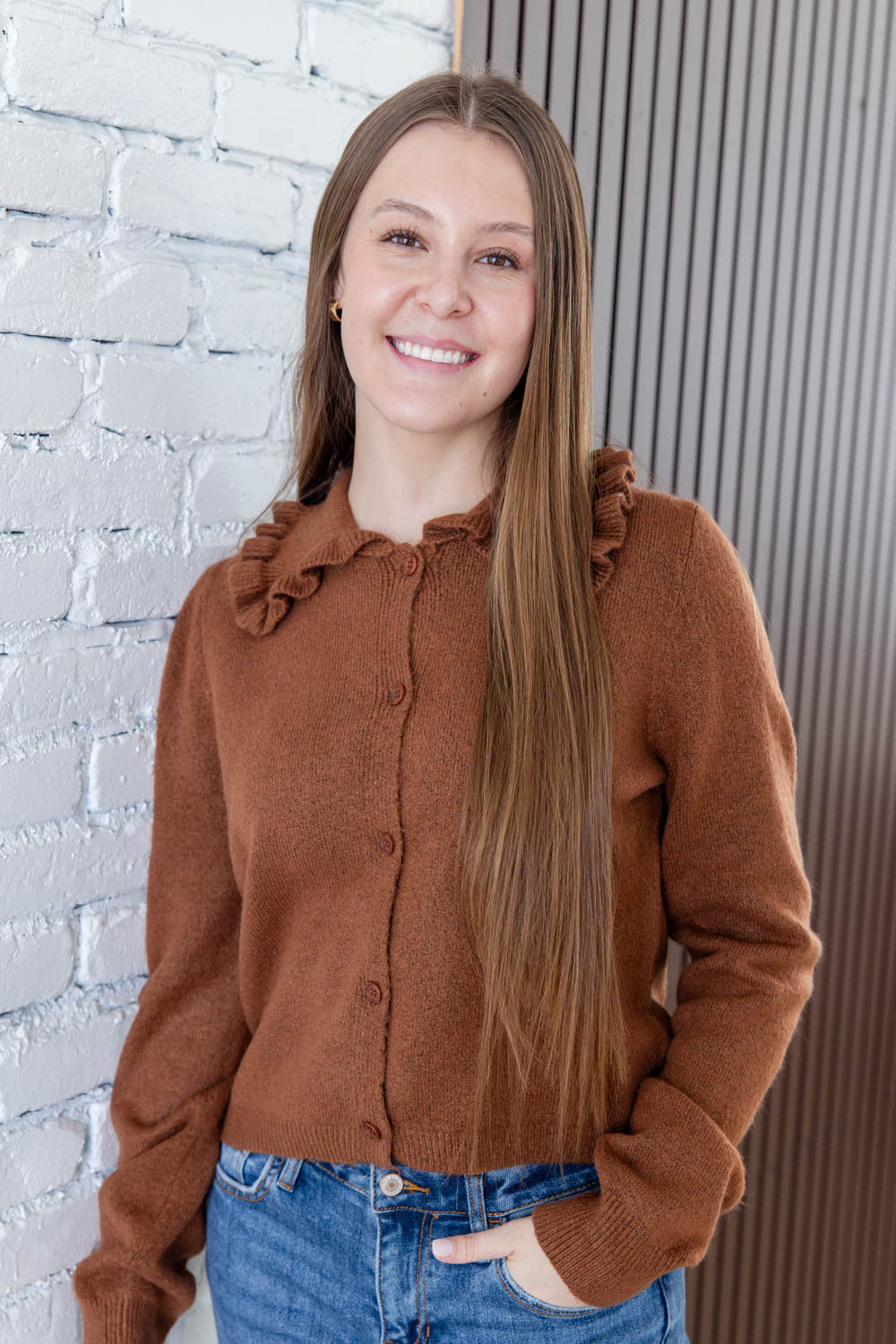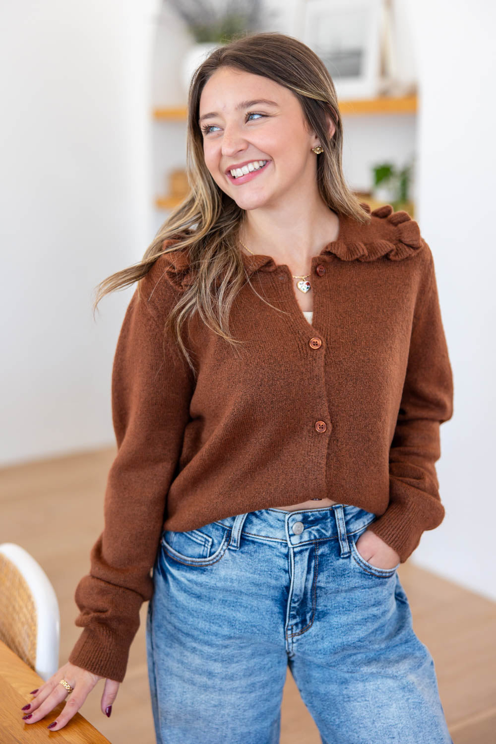The Femme Frill Ruffled Cardigan brings a little charm to your chill. With its relaxed fit and hip-length cut, it’s made for layering over just about anything. Baggy sleeves and a soft, cozy material make it feel like your favorite blanket — only way cuter. The functional button front gives you styling options, while the ruffled collar adds a playful, romantic touch. It’s the kind of cardigan you toss on for comfort and keep on because it looks that good.