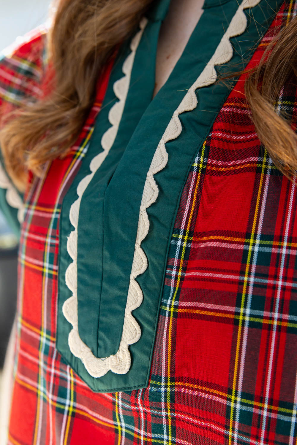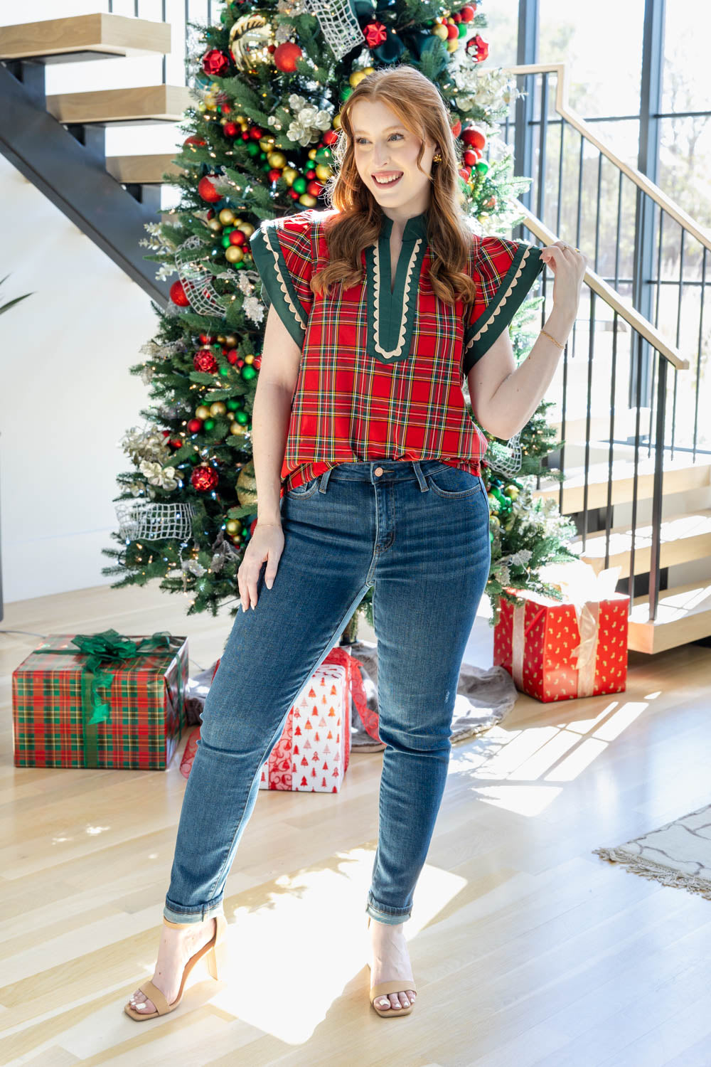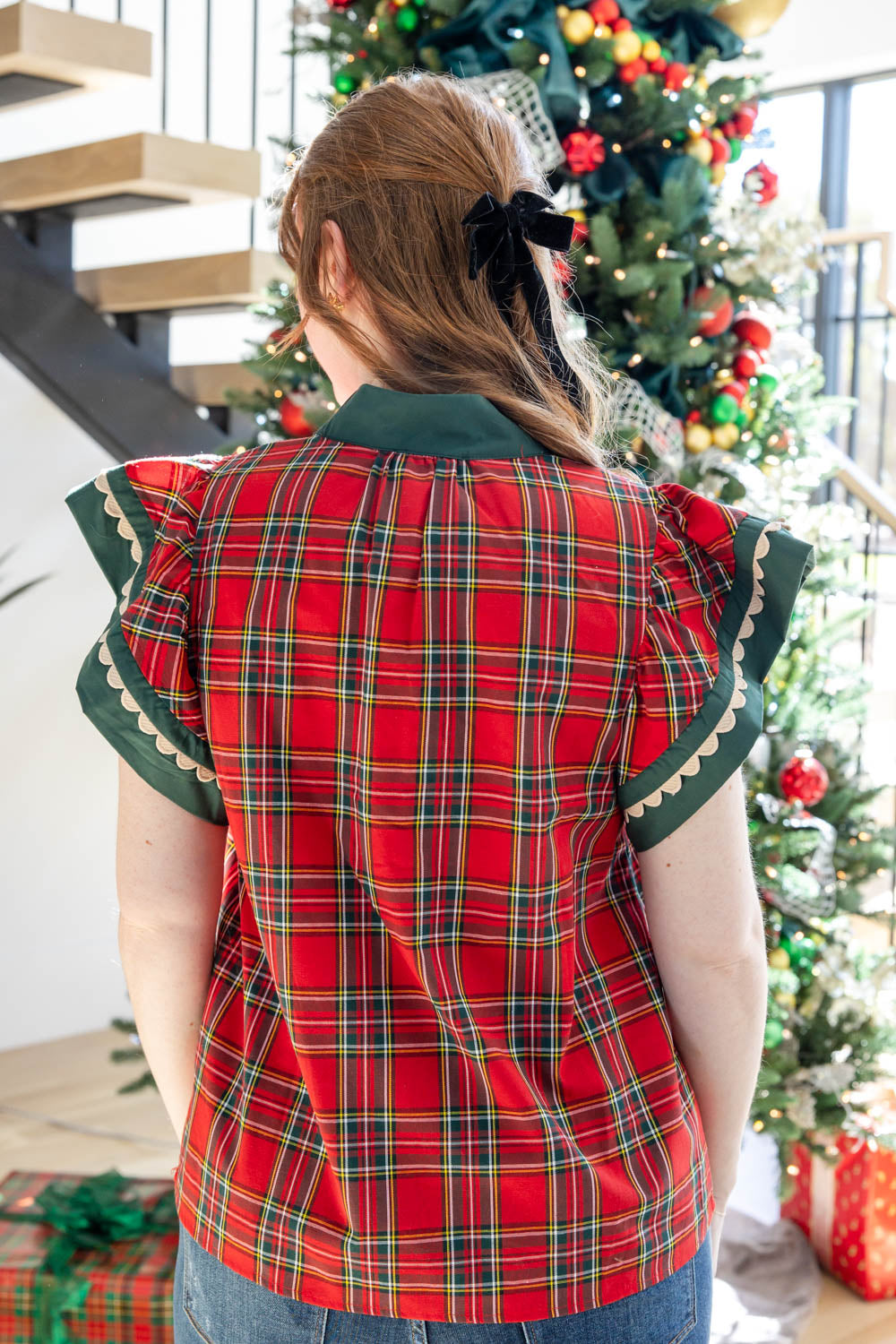 The Festive Flutter Plaid Top is bringing all the festive feels with none of the fuss. With a billowy, true to size fit and flutter sleeves, it’s equal parts easy and elevated. The notched collar neckline adds a soft structure, while the hip length cut makes it perfect for tucking into jeans or letting it flow free. A cheerful plaid pattern sets the holiday mood, but it’s the green trim and delicate lace detailing across the neckline and cuffs that really steal the show. From holiday concerts to cookie exchanges, this blouse is ready to sleigh.