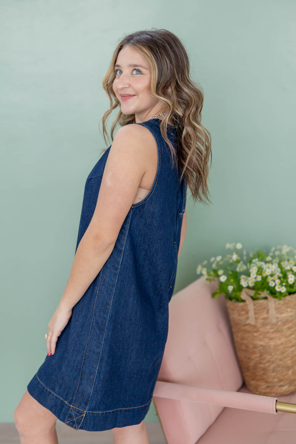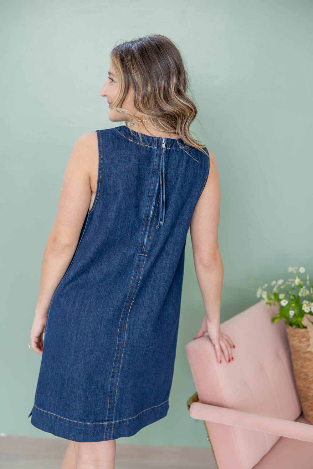 The Flirty in Blue Mini Denim Dress keeps things simple and flattering. The flowy shift silhouette offers relaxed comfort without losing shape, while the mini length shows just enough leg to keep it playful. Crafted in a dark wash denim, it feels polished and easy to style day or night. A sleeveless cut and classic crew neckline keep it clean and versatile, and front and back seam details add subtle structure. Finished with a back zip closure for a smooth fit, it is effortless and confident all in one.