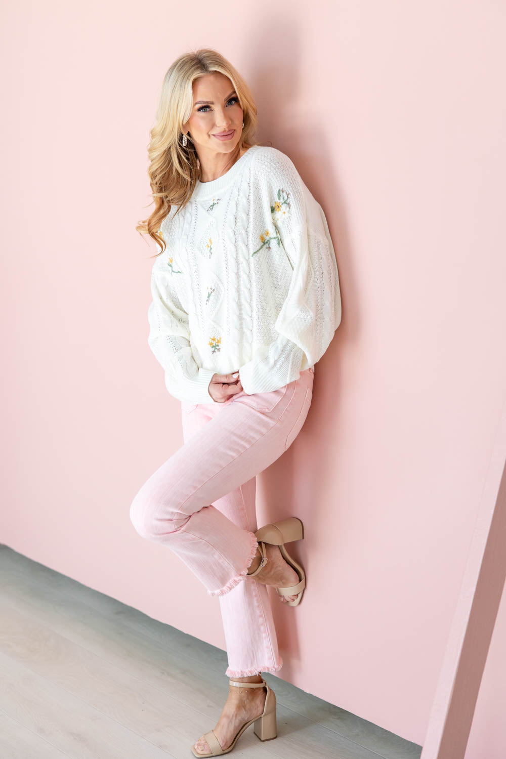 The Flower Patch Knit Sweater brings cozy charm with a touch of whimsy. With an oversized fit and hip-length cut, it layers effortlessly and keeps things relaxed without losing shape. The classic crew neckline and ribbed hem add structure, while baggy long sleeves enhance the laid-back vibe. Mid-weight cable knit gives it texture and warmth, and delicate embroidered floral details add just the right amount of sweetness. It’s the kind of sweater that feels like comfort and looks like intention — made to stand out softly.