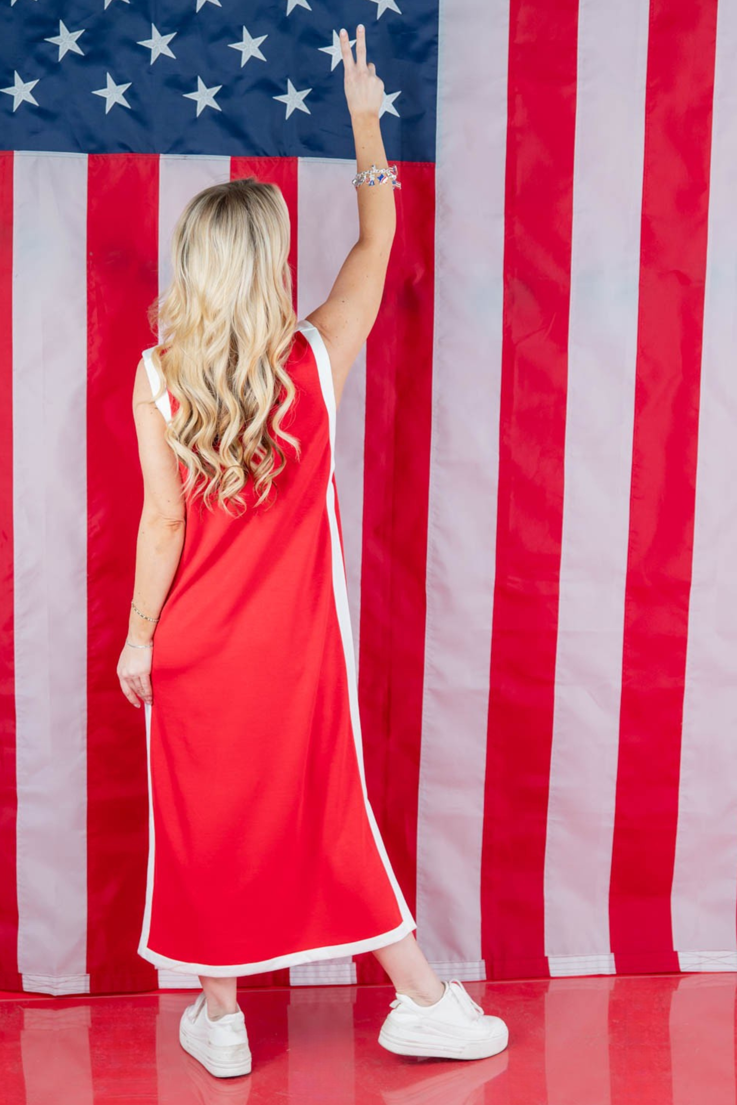 Made for comfort but styled to stand out, the Freedom Flame Sleeveless Midi Dress is the definition of effortless. The relaxed slip silhouette drapes easily, while the midi length gives you flattering coverage with plenty of movement. Stretchy pull over fabric keeps it comfortable all day, and the bandeau panel adds extra coverage at the armholes. Side slits allow easy movement. Finished in bold red with crisp white trim for a clean, classic look