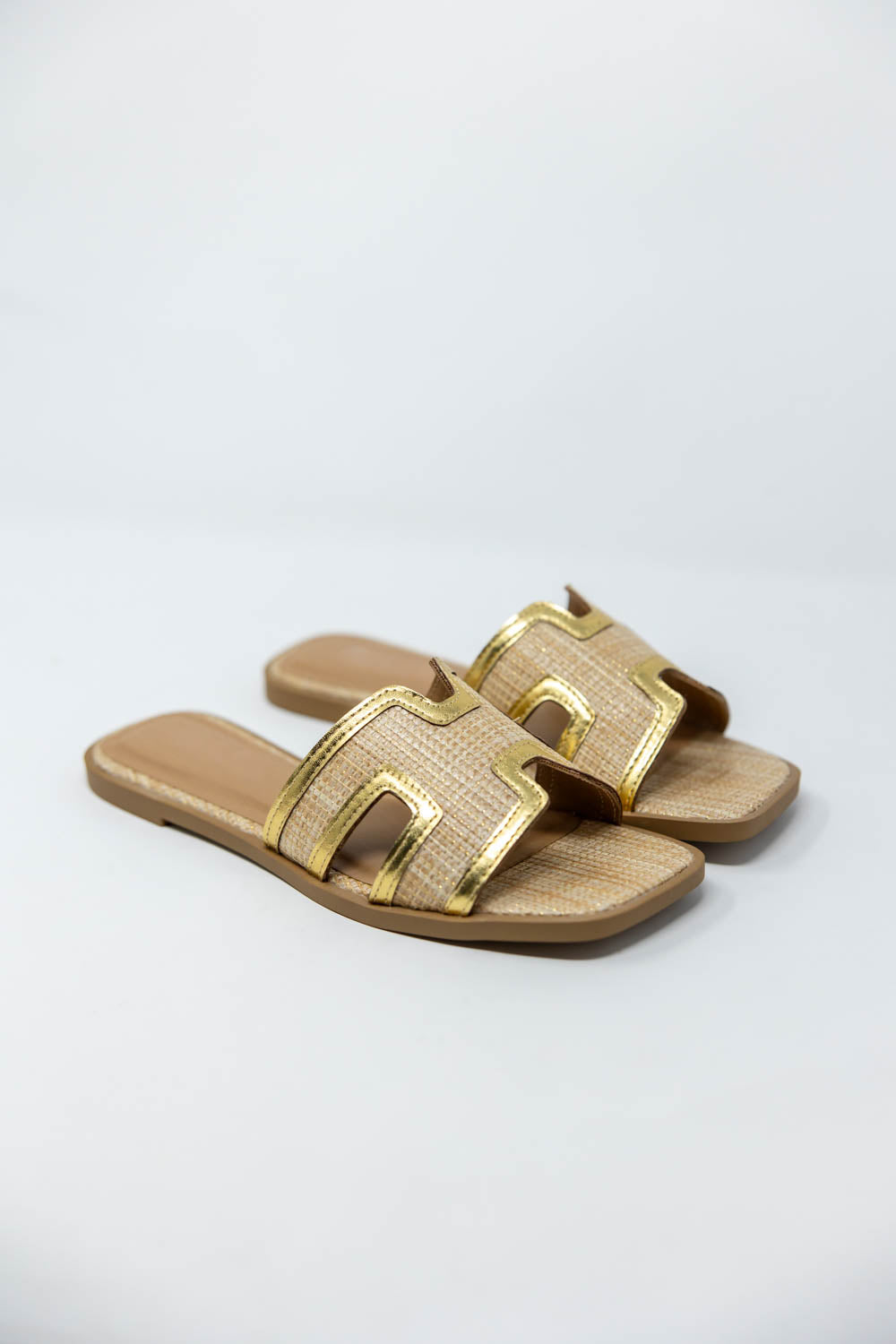 The Golden Getaway Sandals is your effortless warm weather essential. Designed true to size, it slips on easily and feels comfortable all day with a slightly padded footbed. The square toe gives it a modern, flattering shape, while the flexible raffia upper keeps the look relaxed and breathable. Finished with subtle gold trim for a hint of polish, this sandal pairs just as easily with denim as it does with flowy dresses. Simple, chic, and ready for sunshine.