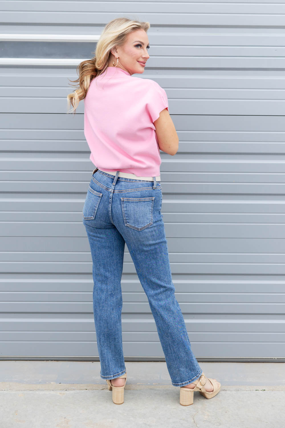 Meet the Shameless Flirt Mid Rise Straight Leg Jeans that make getting dressed feel simple. The mid rise sits comfortably at your waist without digging, and the soft stretch denim moves with your day while keeping its shape — no sagging, no slipping. The relaxed straight leg gives you a clean, lengthening line that works with every shoe in your closet, and the classic medium wash makes them easy to pair with anything. With three inseam options, you get a length that actually fits your height, so they feel right from the moment you put them on. These are the dependable, wear-anywhere jeans you’ll reach for when you want comfort, ease, and a modern, no-fuss look.