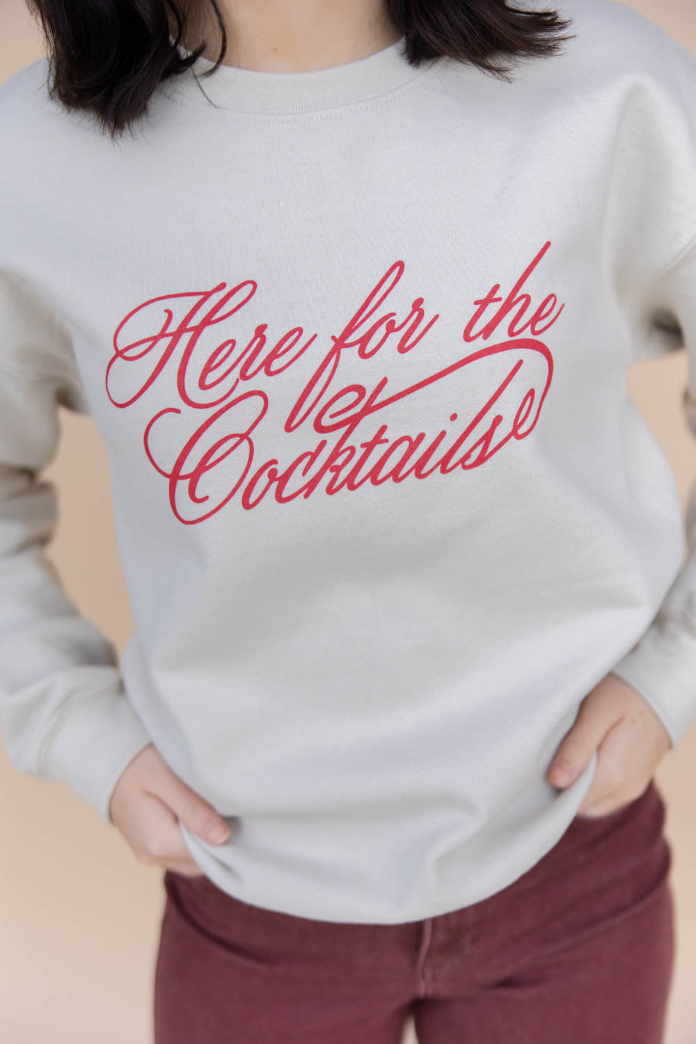 The Here for the Cocktails Graphic Sweatshirt brings the party vibes, no RSVP required. With a unisex, slightly relaxed fit and soft, fuzzy interior, it’s as cozy as it is cheeky. The classic beige base is paired with bold red cursive lettering that reads “Here for the Cocktails,” making it the ultimate conversation starter. Finished with a timeless crew neckline, this sweatshirt is perfect for happy hours, holiday mixers, or sipping something fun while staying in.