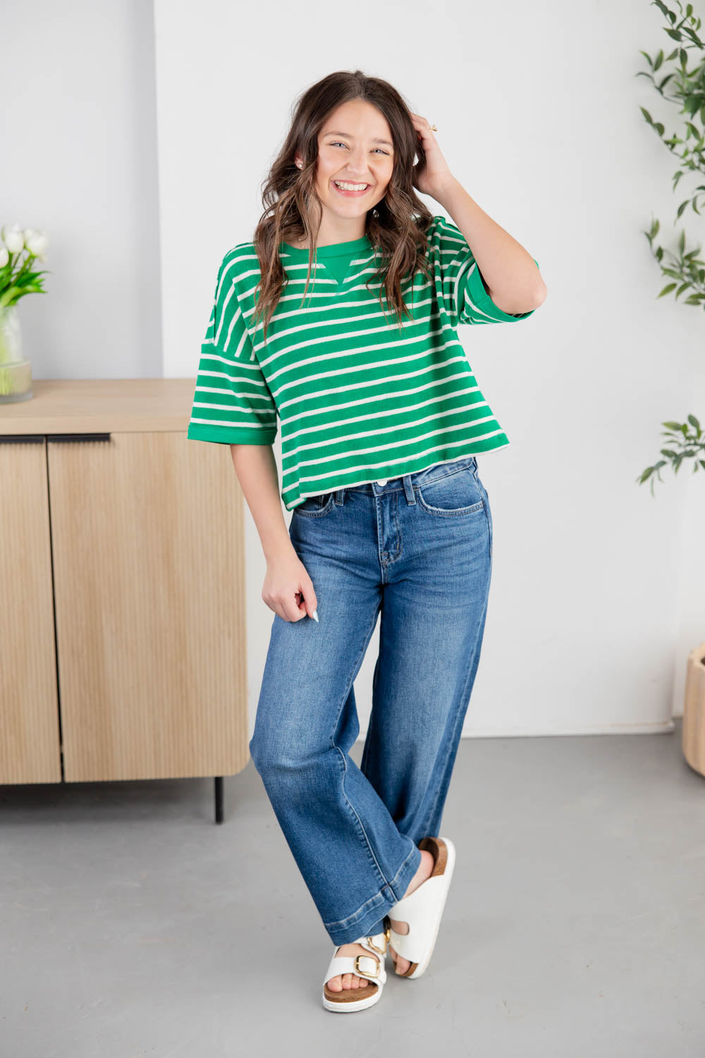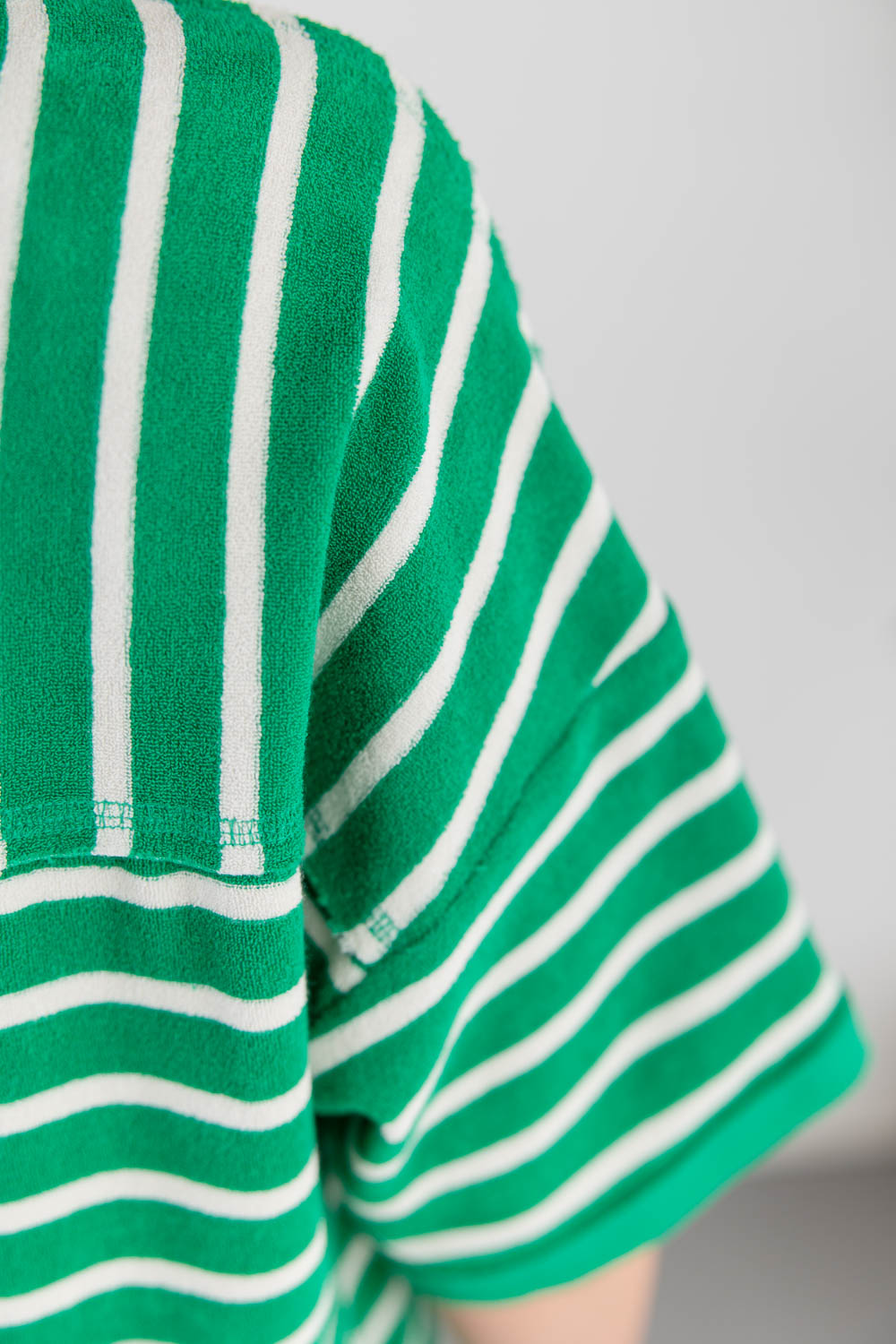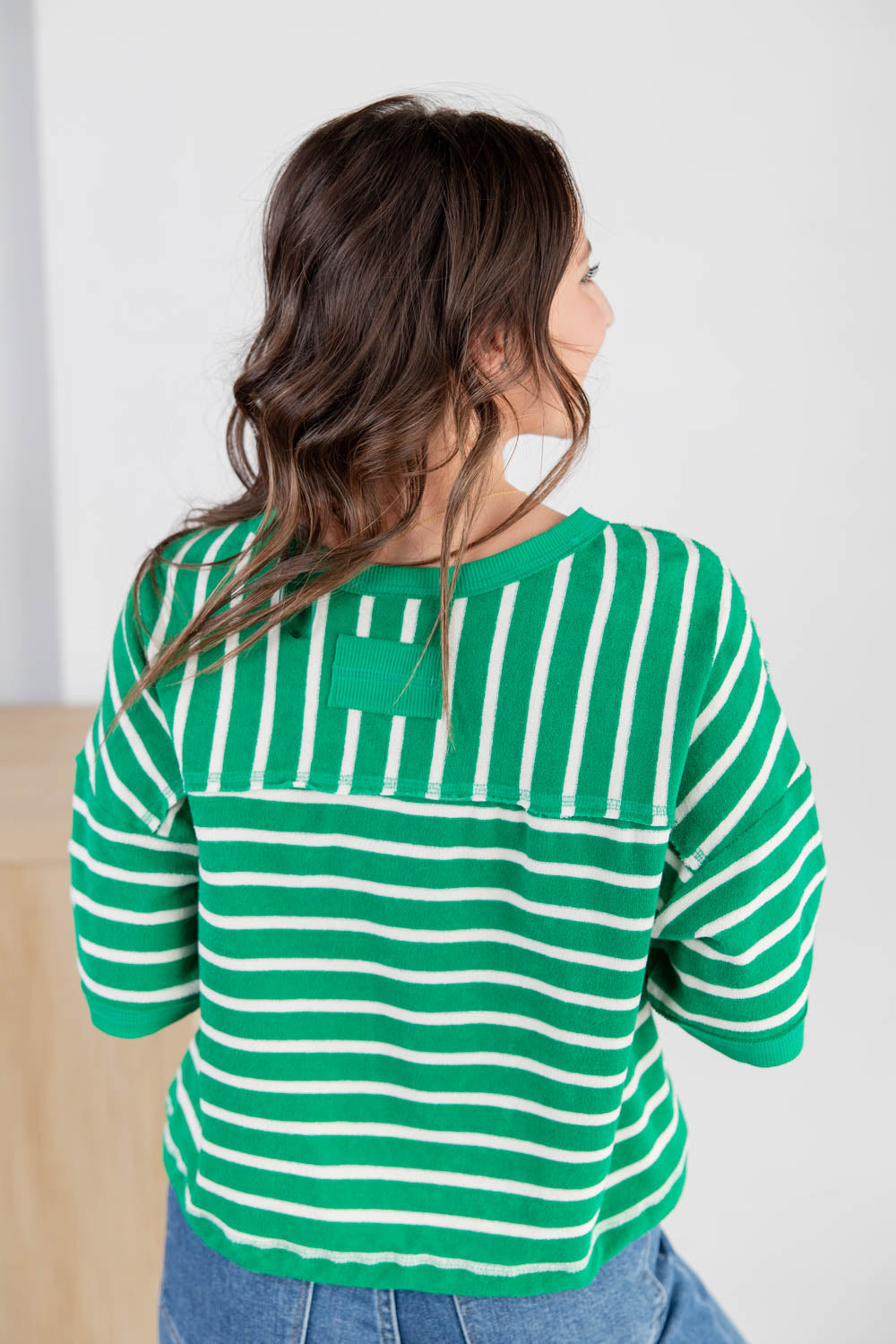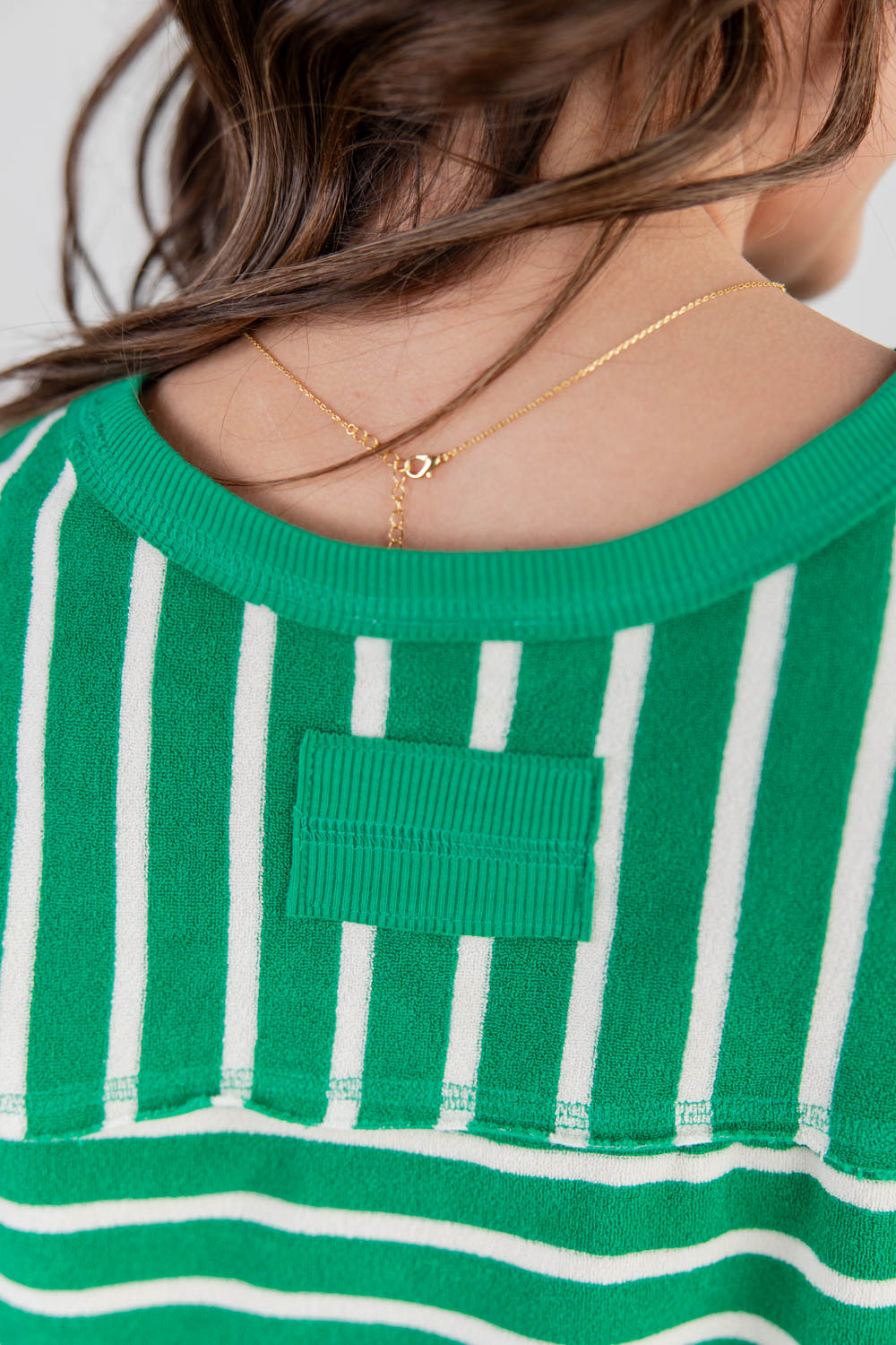 The In My Era Short Sleeve Top is made for effortless, everyday wear. With its oversized fit and cropped length, it offers a relaxed shape that feels both easy and modern. The soft terrycloth fabric adds a cozy texture, while the drop shoulder sleeves and front gusset detail bring subtle structure. The horizontal stripe pattern adds a pop of contrast, and the absorbent terrycloth makes it a perfect choice for throwing on after the beach or pool.
