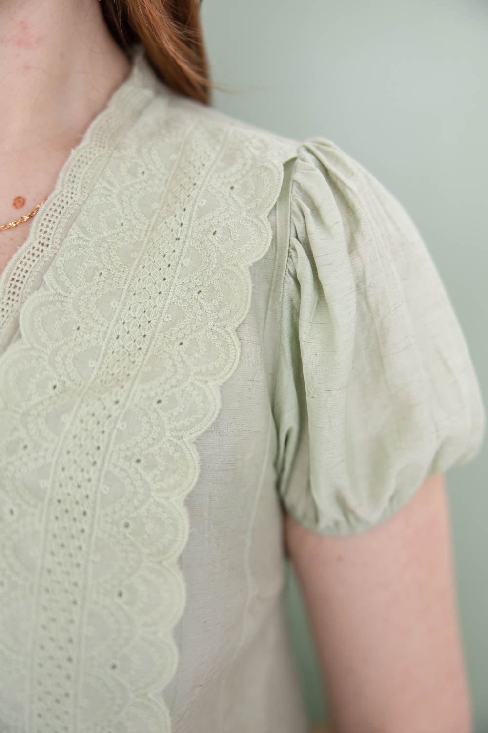 The Lace Kissed Beauty Short Sleeve Blouse brings soft detail and easy polish to your everyday wardrobe. The true to size fit gives you a flattering shape without feeling snug, and the semi cropped length pairs effortlessly with high rise denim and skirts. A scalloped V neckline frames your face beautifully, while the functional button front lets you style it open or closed. Slight puff sleeves add gentle structure, and the thick scalloped lace panel across the front creates eye catching texture that makes even simple outfits feel special. Feminine, wearable, and instantly elevated.