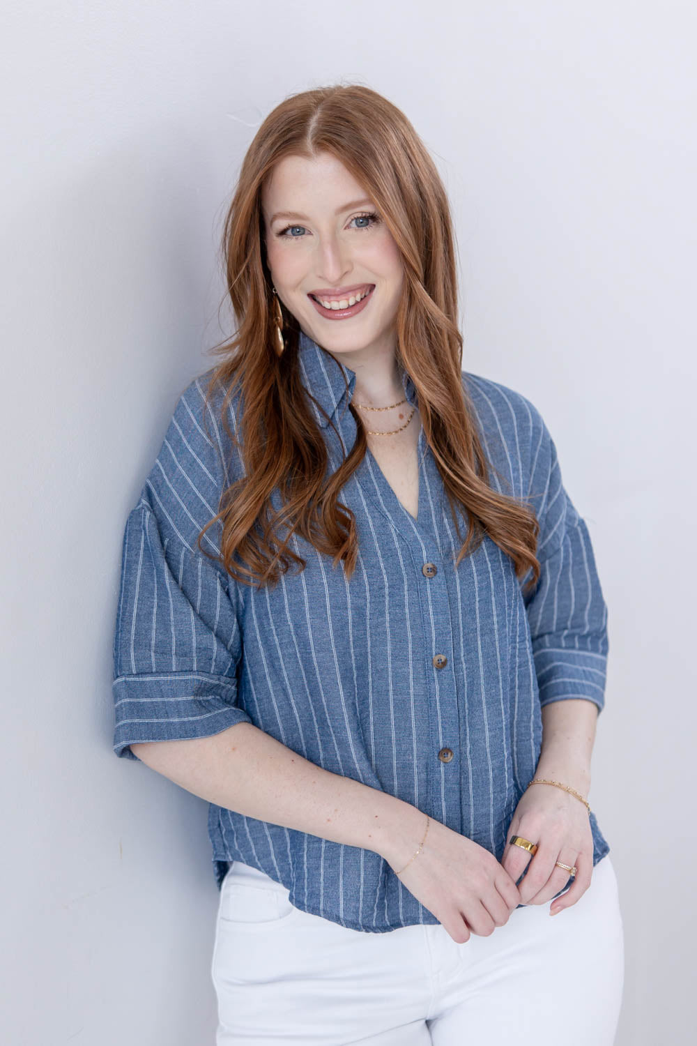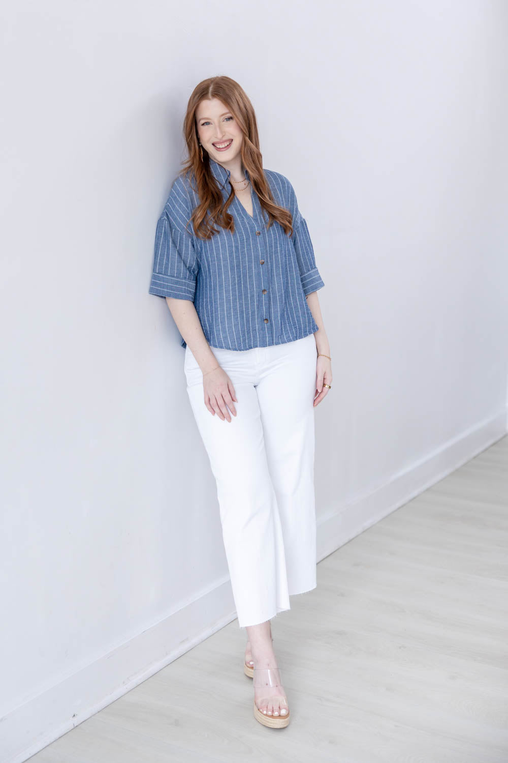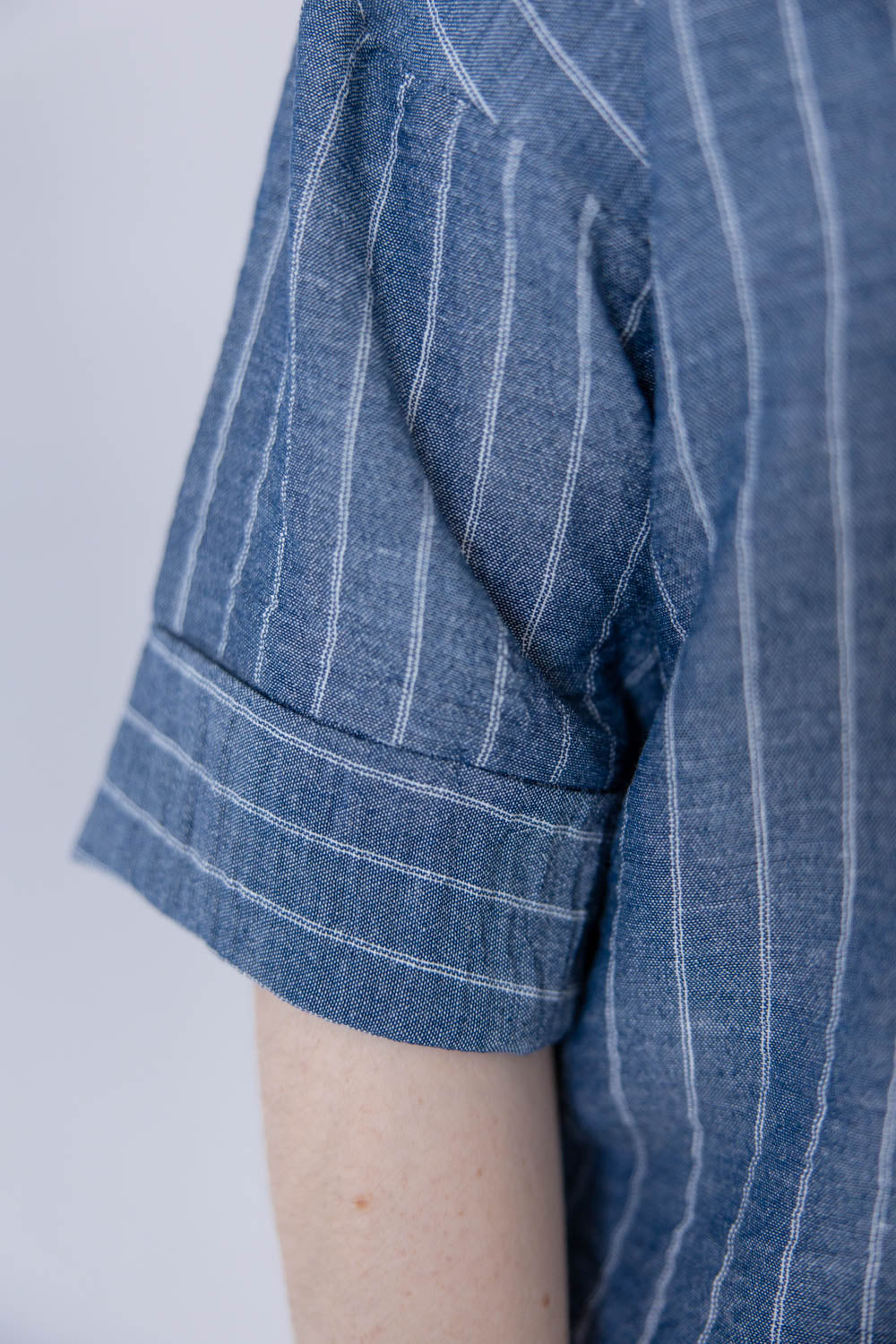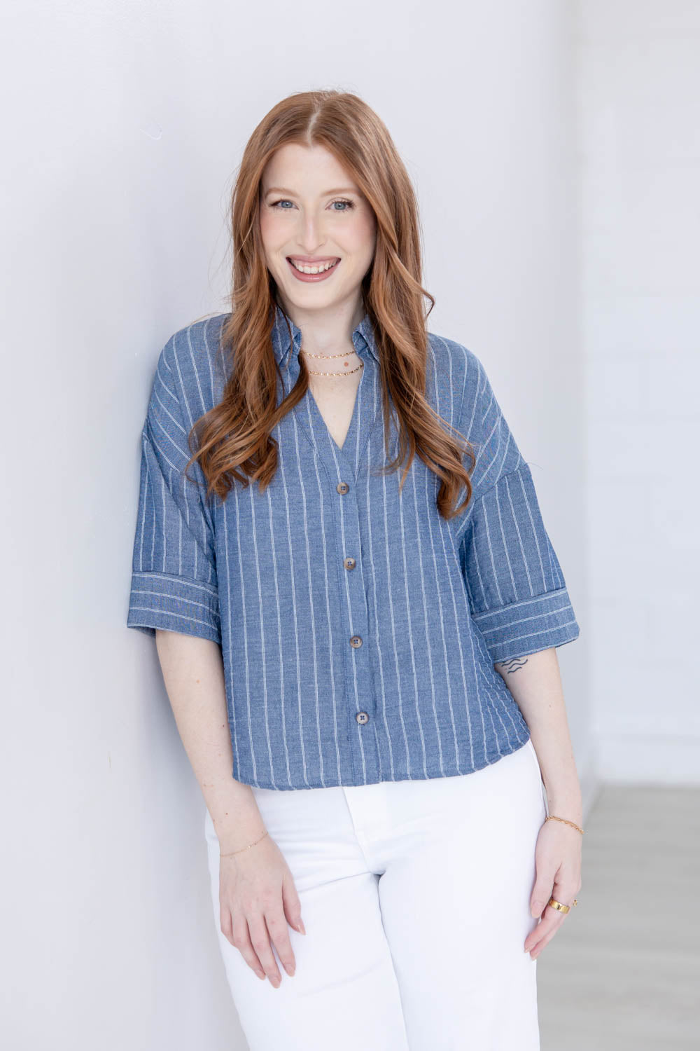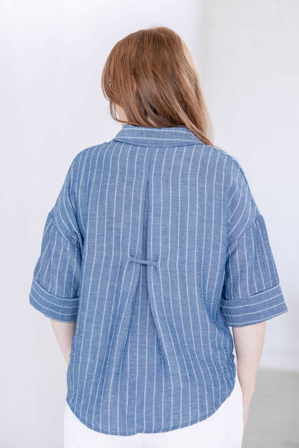 The Line Leader Striped Short Sleeve Top delivers easy structure without feeling stiff. The true to size, boxy fit gives you a relaxed shape that still looks intentional, and the semi cropped length pairs effortlessly with high rise denim and shorts. A collared V neck opens up the neckline for a flattering finish, while the functional button front lets you style it your way. Faux cuffed half sleeves add a laid back touch, and the lightweight striped chambray fabric feels breathable and comfortable for all day wear.