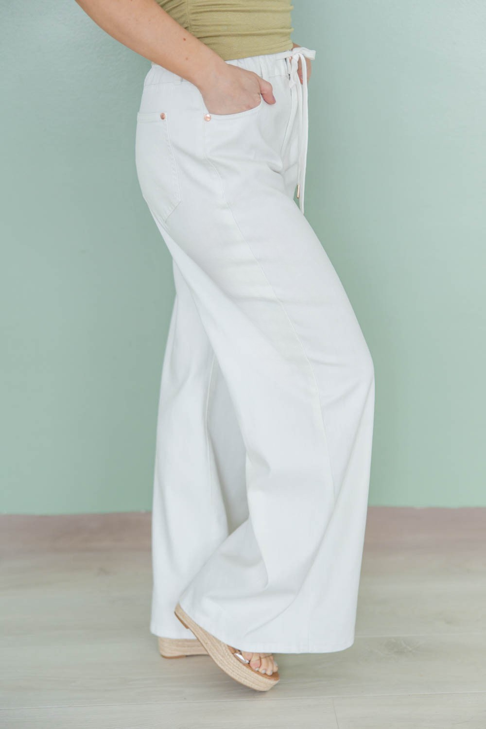 The Little White Lies Featherweight Palazzo Jeans offers a fresh, easy take on classic denim. With a high-rise fit and relaxed wide leg, it flatters while giving you plenty of room to move. The true white color keeps your look crisp and versatile, perfect for pairing with anything from bold prints to soft neutrals. A back elastic waistband adds hidden comfort, while the drawstring, button, and zip closure give you a secure, adjustable fit. Made from lightweight, non-distressed denim, this pair feels breathable and looks effortlessly polished.