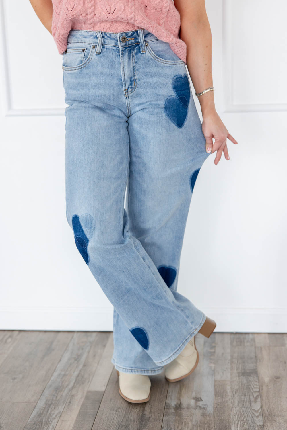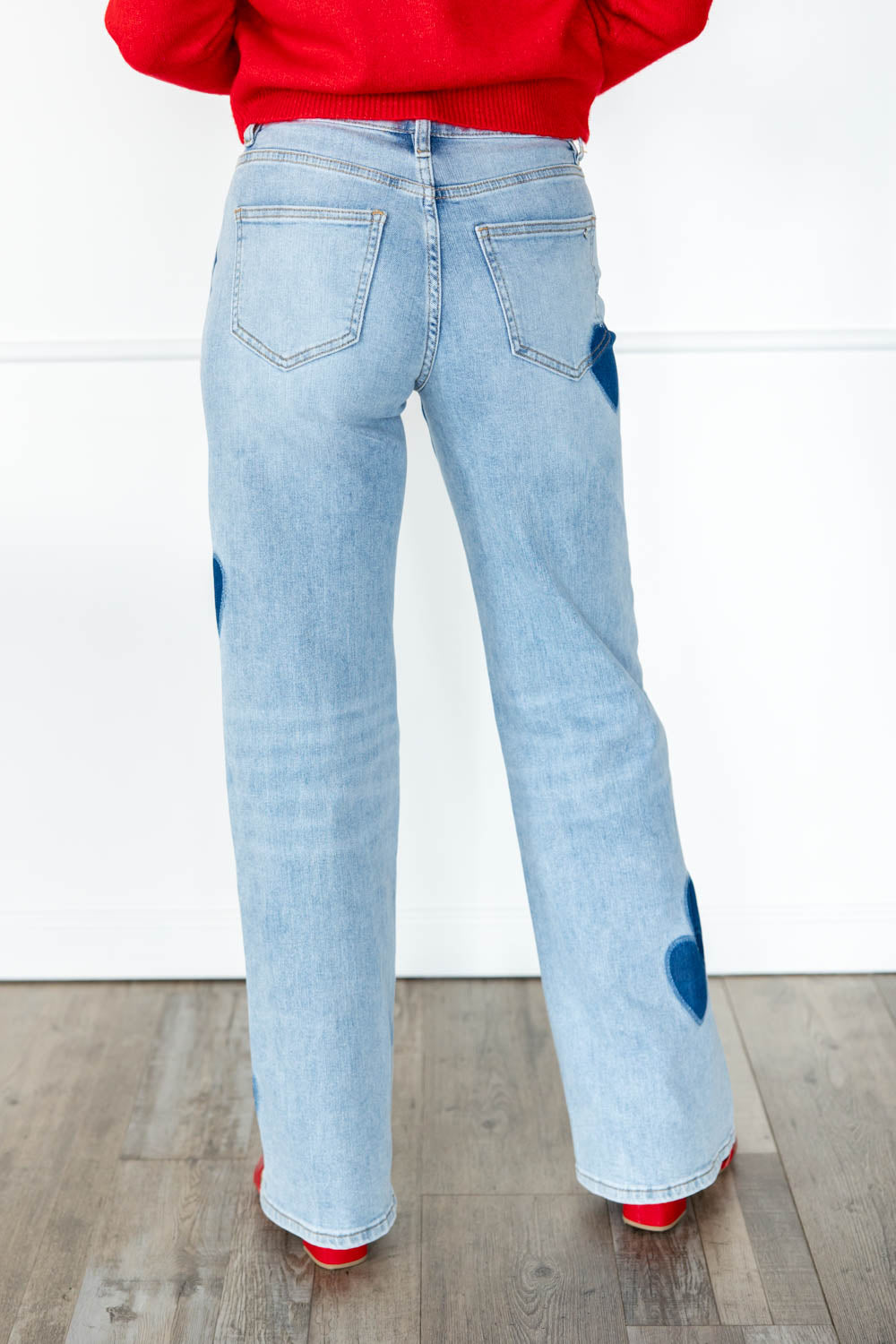 The Lover’s Lane Wide Leg Jeans bring the fun without sacrificing the fit. With a flattering high-rise waist and a light wash that goes with everything, these jeans are your new outfit anchor. The wide leg cut gives movement and ease, while the non-distressed finish keeps the look clean and elevated. A classic button and zip closure gives you a secure fit, but it’s the burnout heart patches that steal the spotlight. Just the right hint of love for days when you want to wear your mood on your denim.