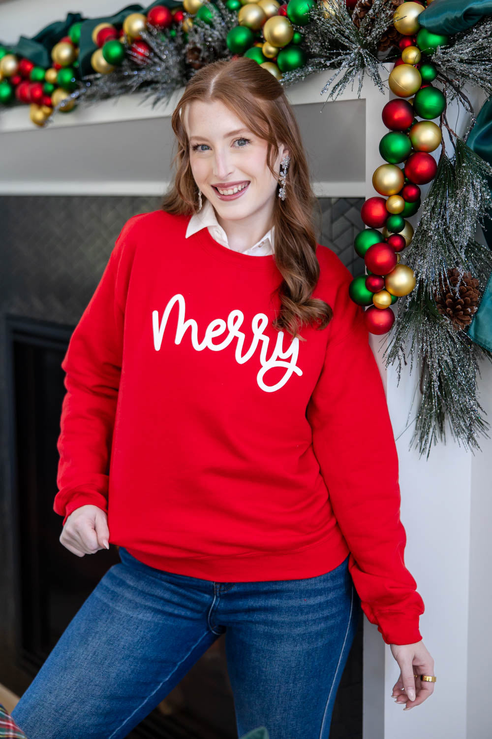 Thisfestive red sweatshirt is the perfect way to spread holiday cheer! With its bold "Merry" graphic and cozy fleece-like interior, you'll be feeling warm and stylish all season long. The slightly relaxed fit and classic crew neckline make it perfect for pairing with your favorite jeans or leggings. Add some holiday magic to your wardrobe with this must-have sweatshirt!