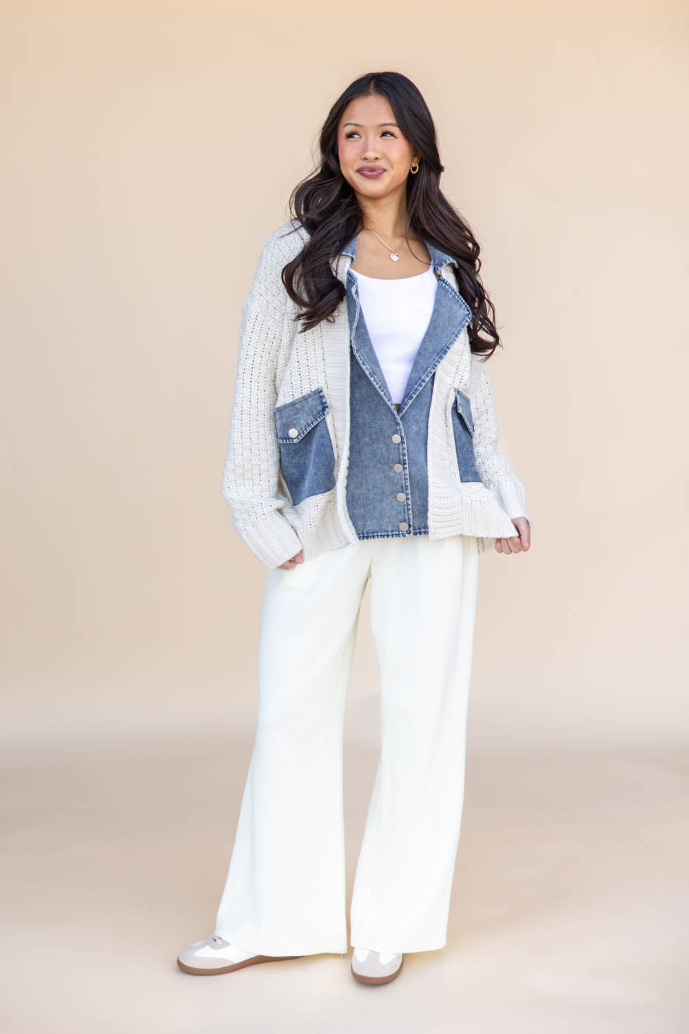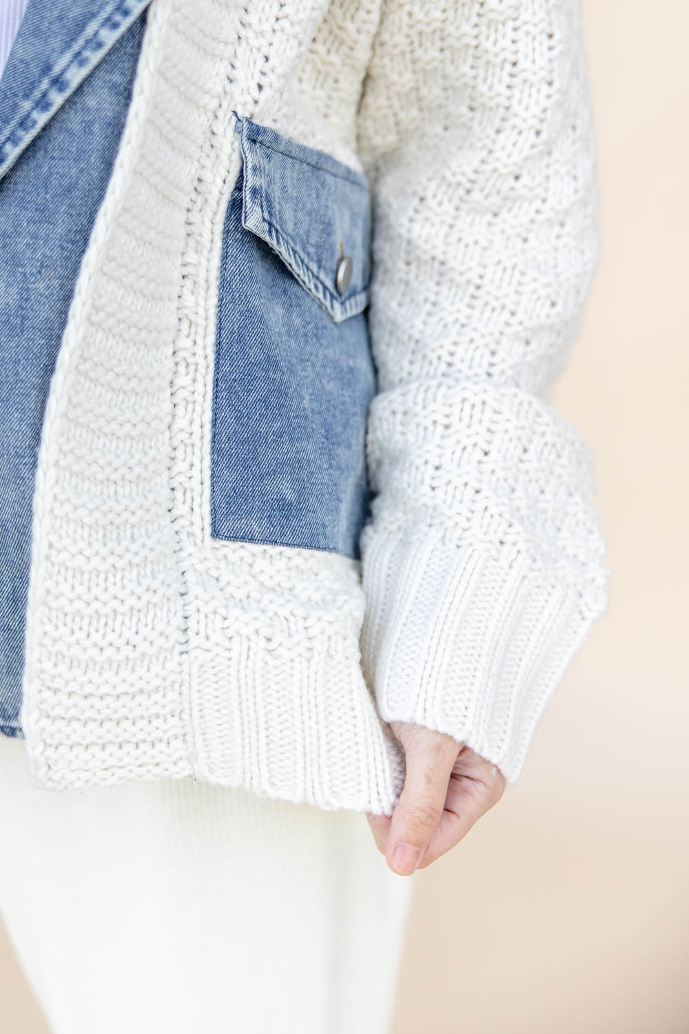 The Mixed Media Cable Knit Denim Jacket brings all the cozy without the bulk. Designed with a relaxed fit and hip-length cut, this clever piece combines the comfort of a heavyweight knit with the structure of classic denim. The notched collar and front patch pockets are done in light wash denim, giving the look of a perfectly layered cardigan over your favorite jean jacket. Finished with a snap button closure for easy wear, it's the ultimate throw-on-and-go style for chilly mornings and casual winter days.