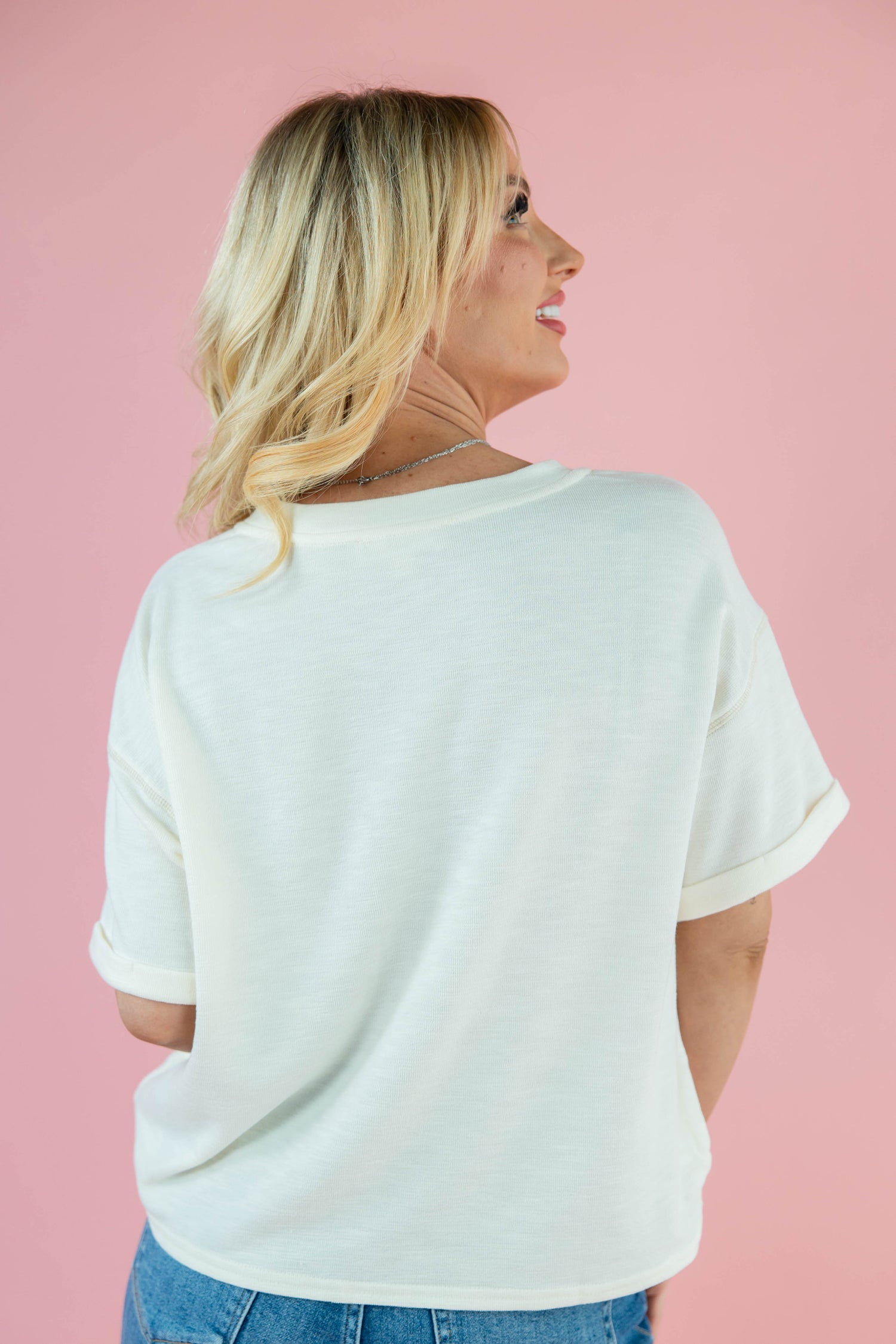 The Modern Day Chic Short Sleeve Top is made for effortless comfort that still looks styled. The true to size, boxy fit gives you room to move without feeling oversized, while the semi cropped length works perfectly with high rise bottoms. A notched V neckline draws the eye up and adds a flattering touch, and front stitching gives the look subtle structure. Drop shoulders and extended short sleeves with cuffs create a relaxed shape that feels intentional, and the lightweight fabric keeps things cool and comfortable from morning to night.