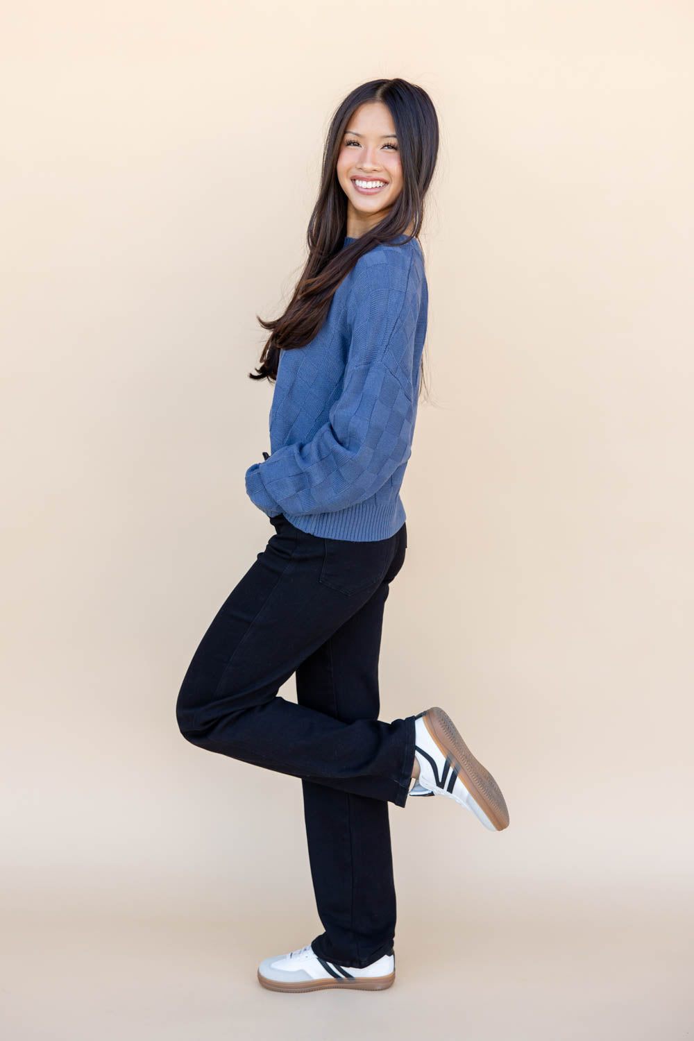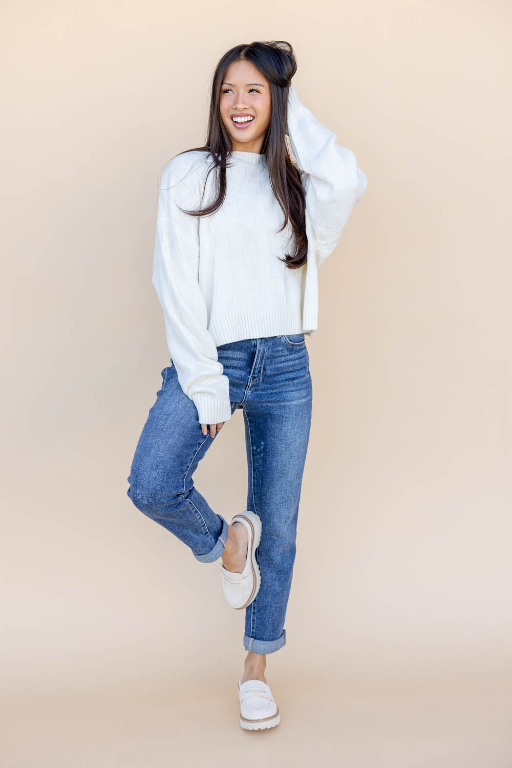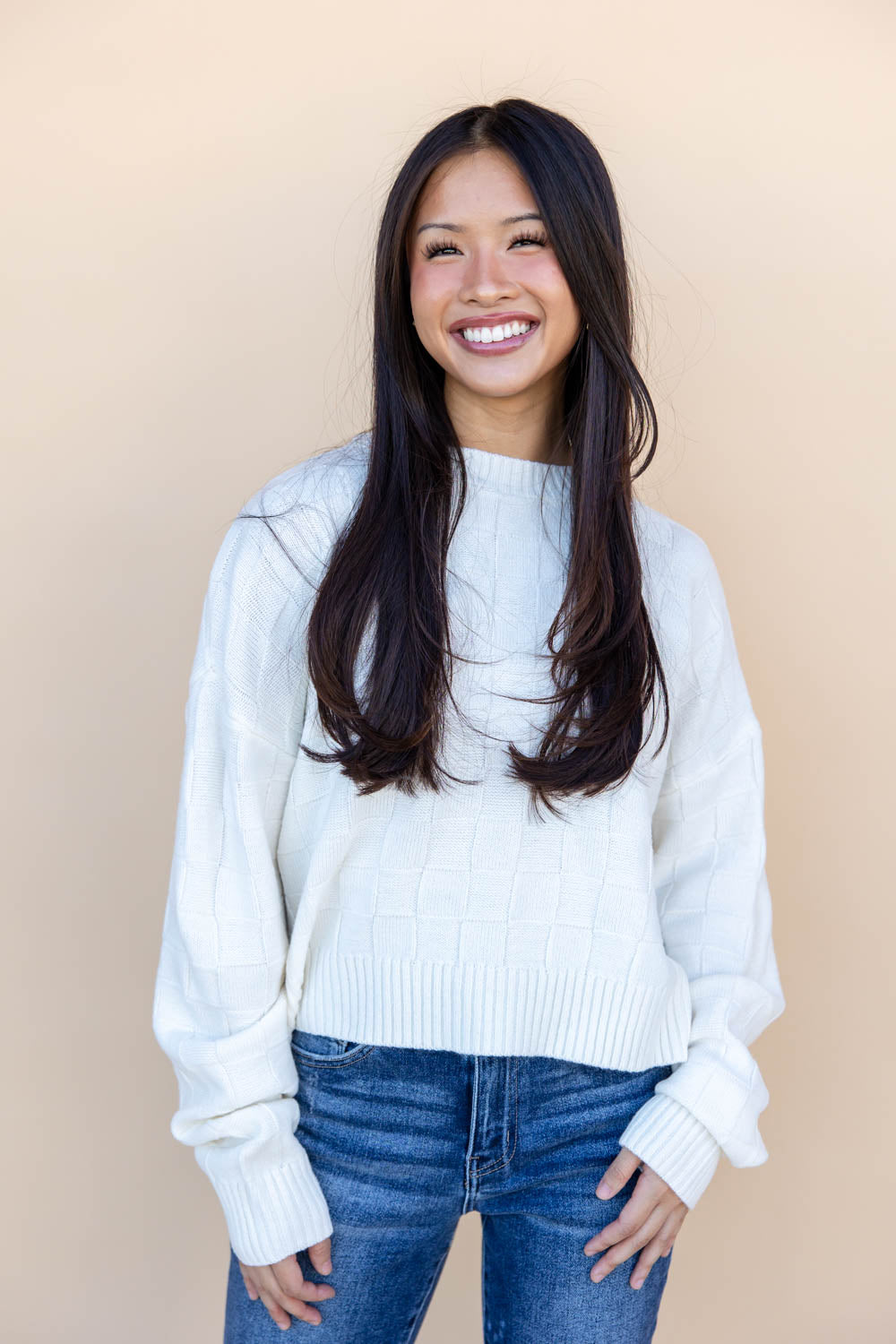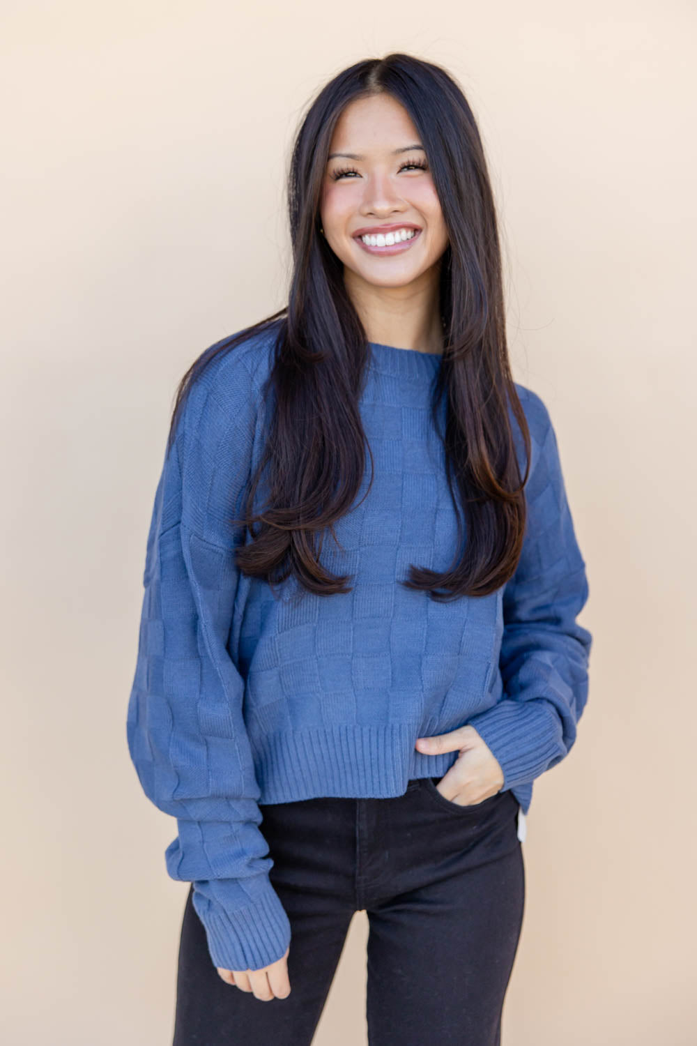 The Morning Chill Sweater brings cozy attitude with a cool-girl edge. With a slouchy, relaxed fit and cropped length, it’s made for laid-back styling that still stands out. The drop shoulders and long sleeves add to the easy vibe, while the knit checkered pattern gives it that statement touch. Finished with ribbed trim at the neckline, hem, and cuffs, this sweater pairs perfectly with high-rise denim or layered over a slip dress for a hint of contrast.
