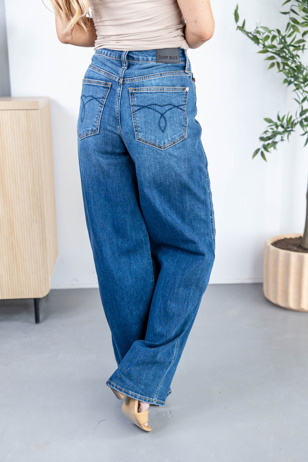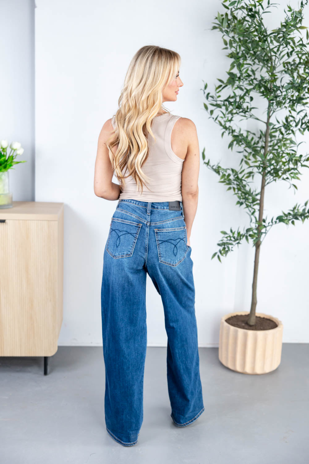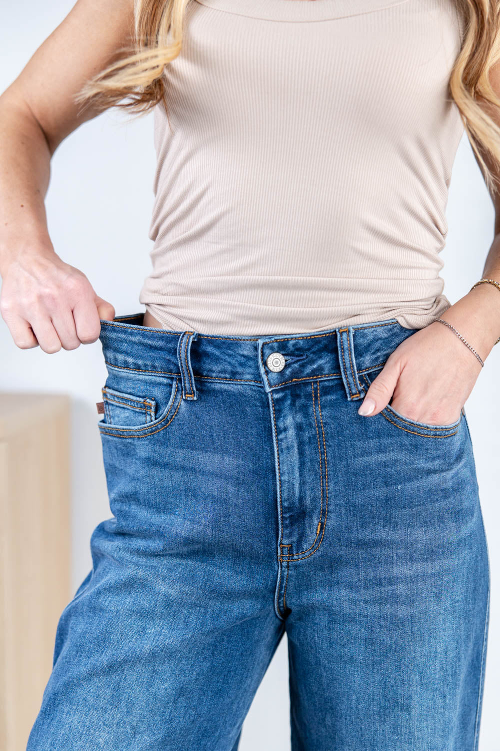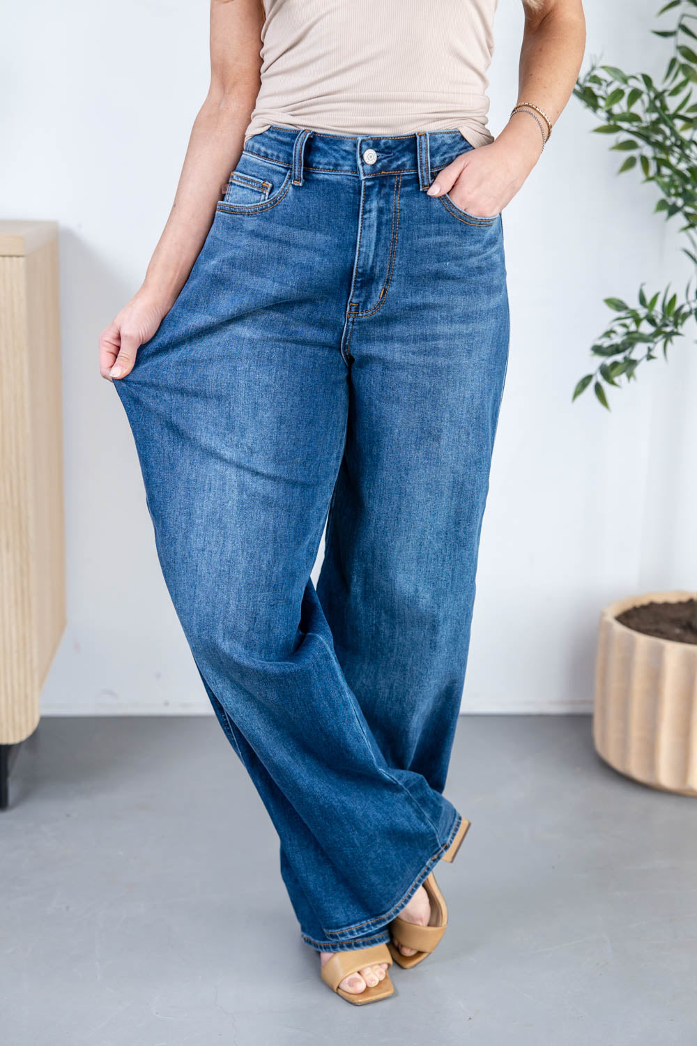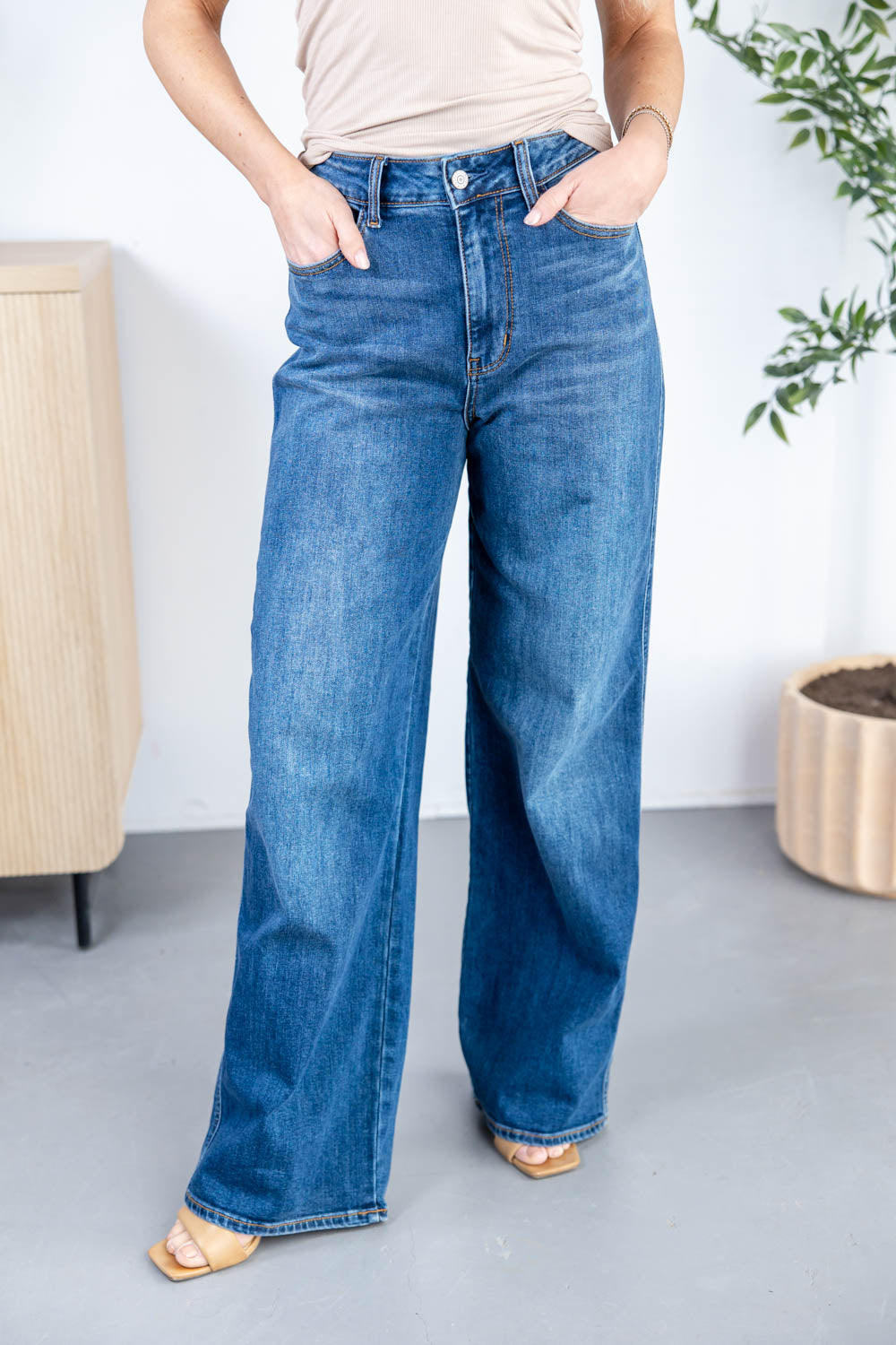 Designed for comfort without sacrificing shape, the Never Better Dark Wash Baggy Jeans deliver relaxed comfort with a polished finish. These high-rise baggy wide leg jeans sit smoothly through the midsection to create a flattering, held-in feel that helps visually slim and balance your shape. The classic dark medium wash keeps the look versatile, while the finished hem and non-distressed finish make it easy to dress up or down. Made from soft, stretchy denim, this pair combines structure and flexibility for all-day wear. Finished with a button and zip closure, it's the perfect mix of casual and elevated.