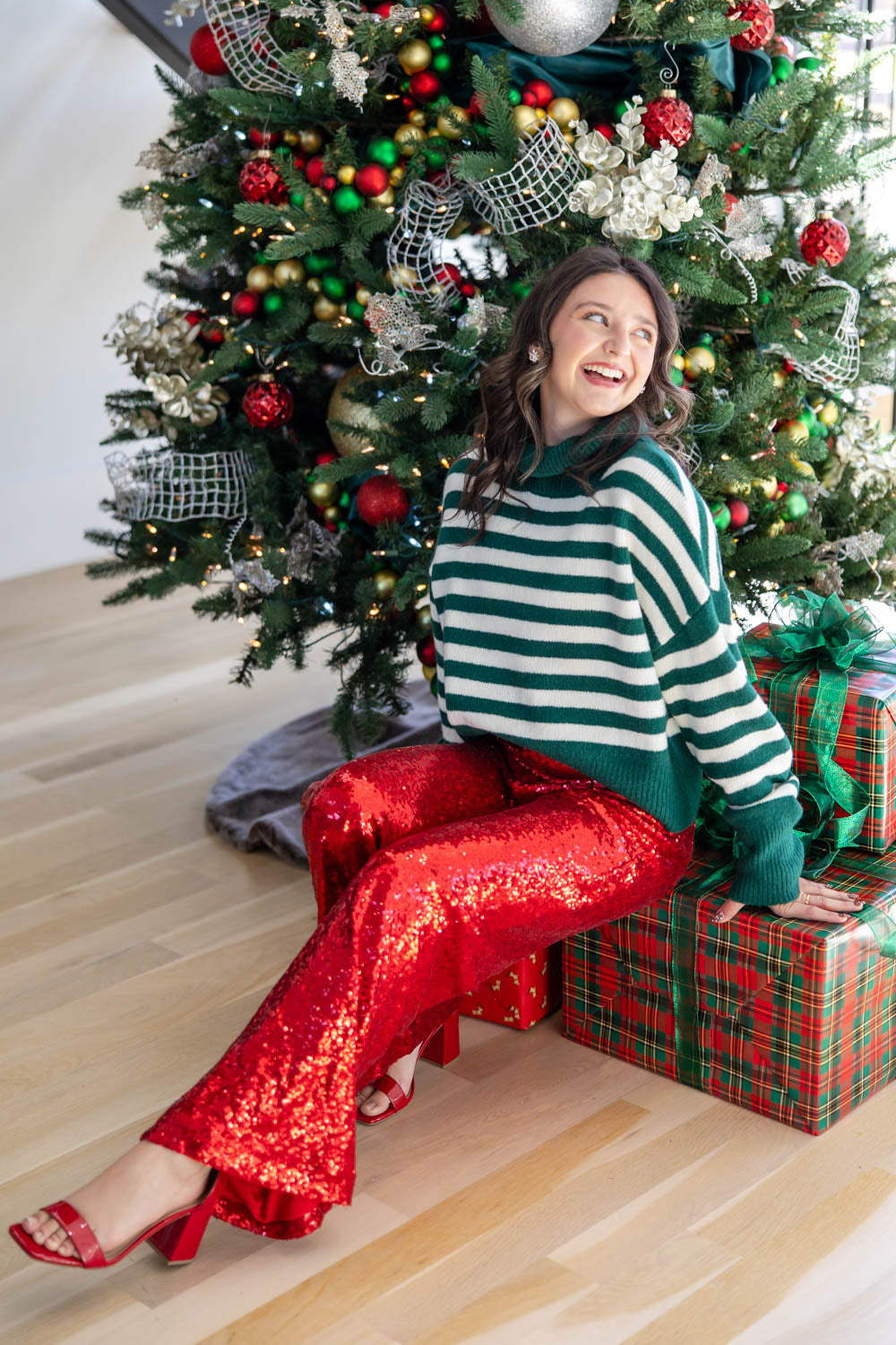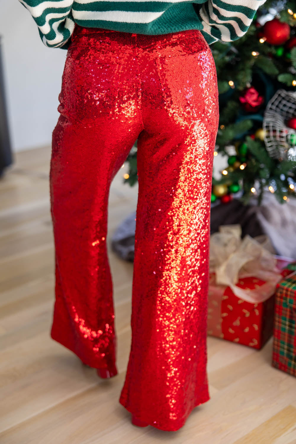 Light up the room—literally—with our Night Lights Sequin Pants, the statement piece your holiday wardrobe has been waiting for. Designed with a bold red sequin exterior, these pants shimmer and sparkle with every step, adding instant glamour without any extra effort. The wide leg silhouette and comfortable mid-rise waist create a flattering shape that moves with you. True to size and lined for all-night comfort, they’re perfect for dressing up a classic sweater or pairing with a sleek blouse for festive parties, NYE plans, or any occasion that calls for a little extra shine.