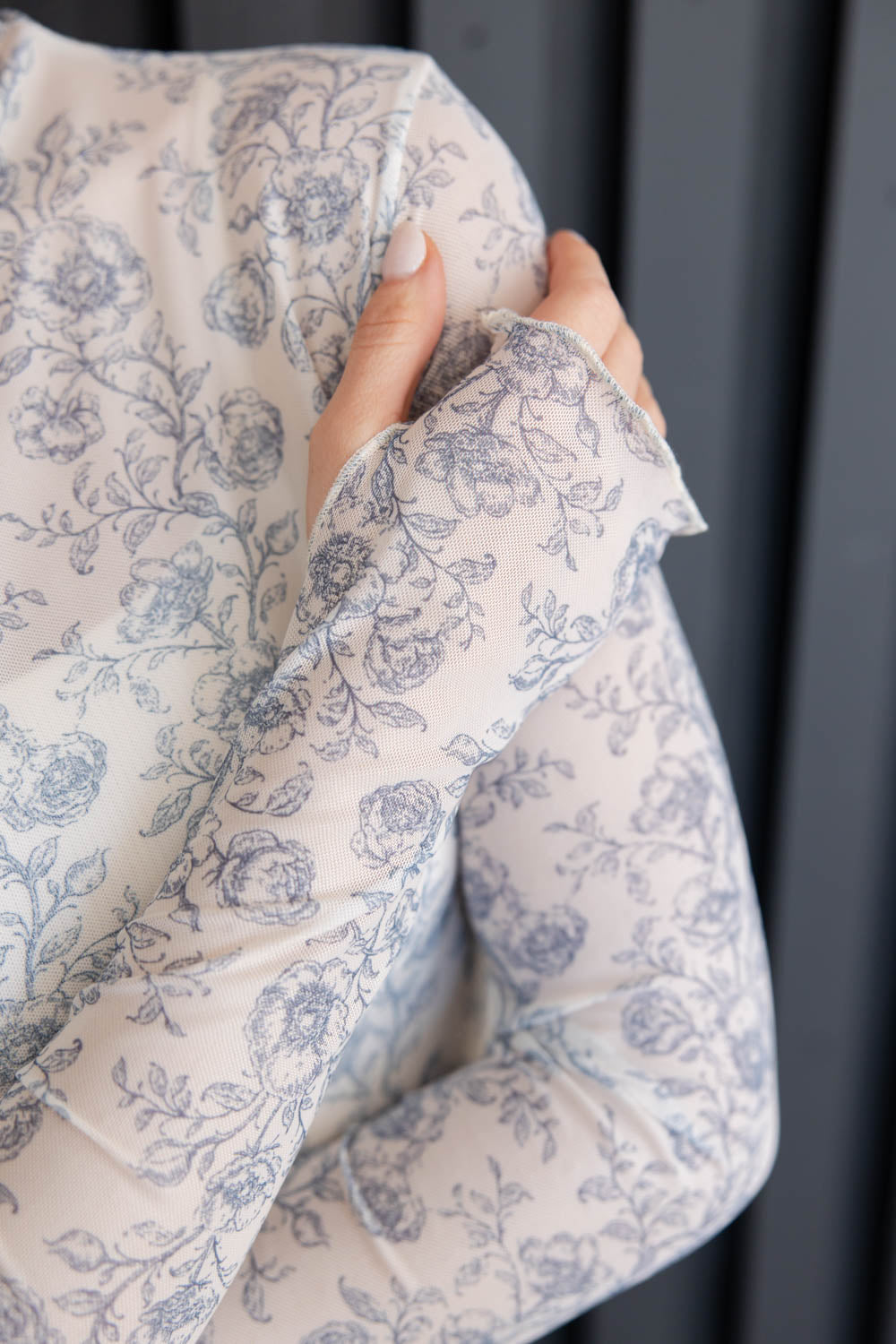 The Oh My Petals Floral Print Long Sleeve Sheer Top is made to stand out while keeping things effortless. With a fitted, true to size shape and hip-length cut, it flatters without feeling restrictive. The mock neckline and thumb hole sleeves add sleek detail, while the lettuce trim softens the edges for a feminine touch. Made from stretchy, sheer mesh, it layers easily and moves with you. A delicate blue floral pattern on white gives it a fresh, eye-catching look that works for everything from day plans to nights out.