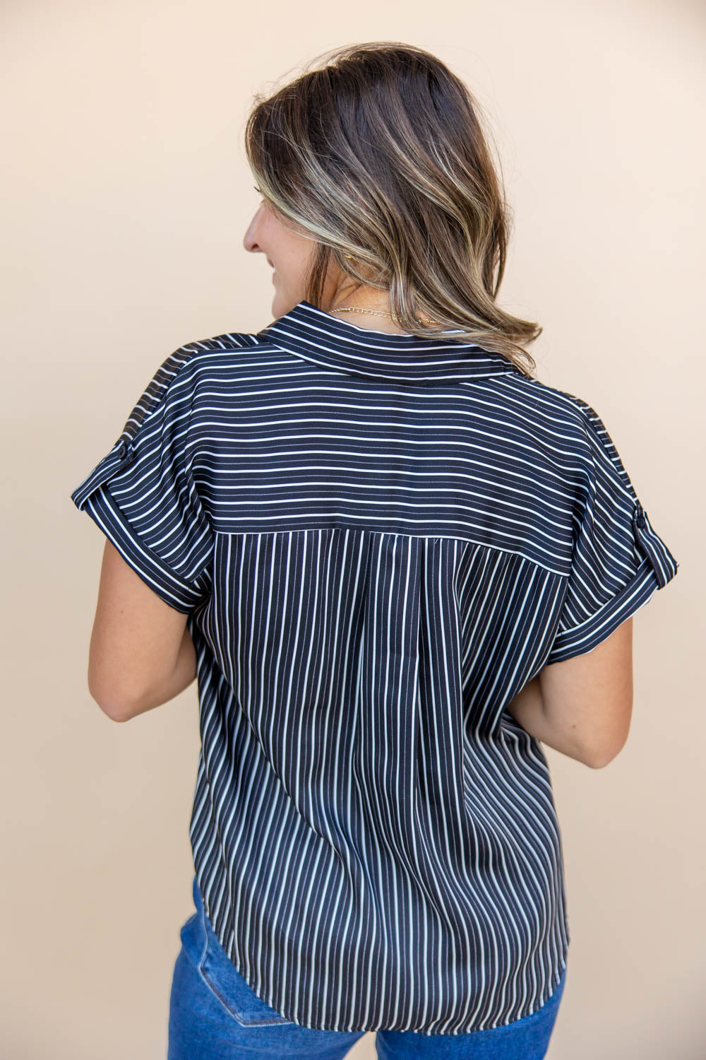 The On The Line Short Sleeve Button Down Top is a crisp classic with just the right amount of ease. Featuring a true to size fit and hip-length cut, it’s designed with a collared V-neckline, functional button front, and a single front pocket for that tailored touch. The vertical stripe pattern keeps the look fresh and flattering, while cuffed short sleeves add a casual edge. Pair it with structured trousers for work, or tuck it into denim shorts and sandals for an elevated off-duty vibe.