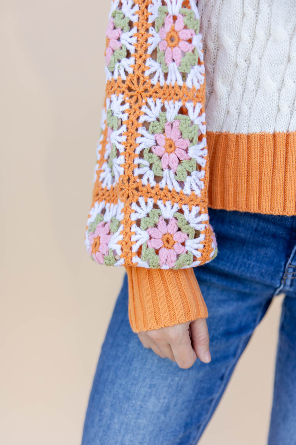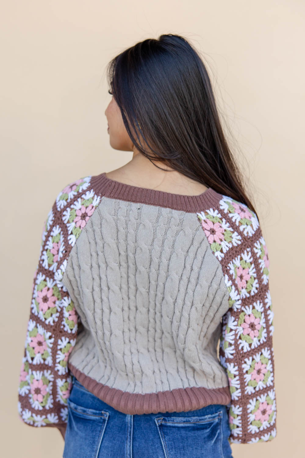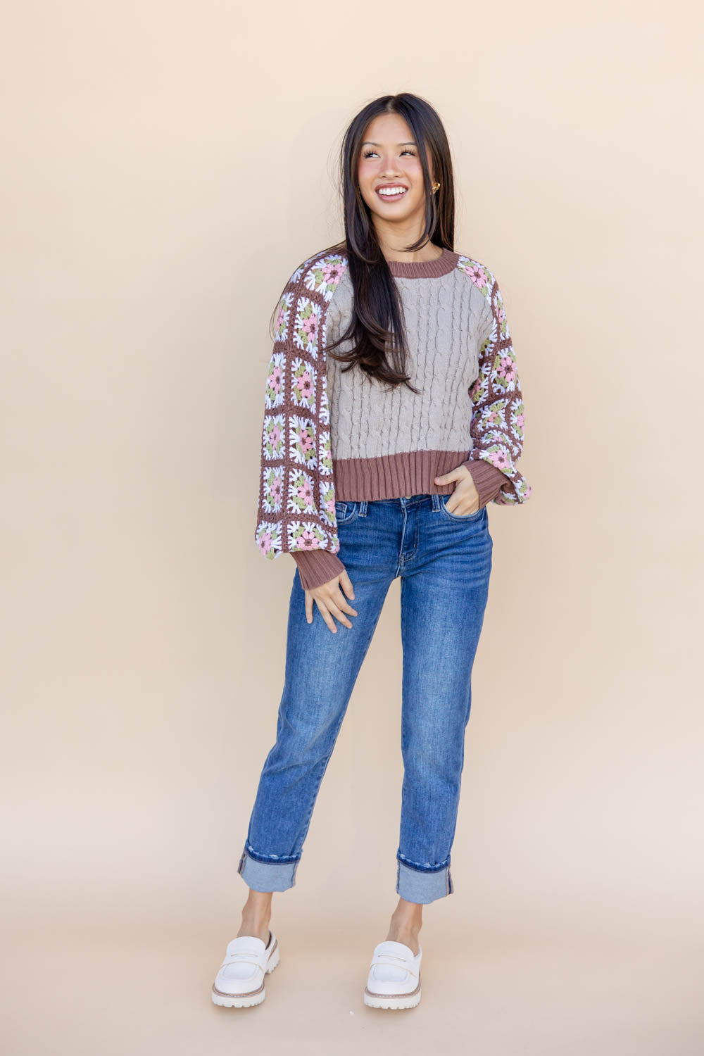 The Patchwork Princess Cable Knit Sweater is a cozy classic with a playful twist. With a true to size fit and cropped length, it’s perfect for pairing with high-rise denim or layered over dresses. The round neckline and mid-weight cable knit body keep things warm and timeless, while the standout feature is all in the sleeves—crochet patchwork in soft, tonal hues that add texture and personality. Finished with rib knit trim at the neckline, cuffs, and hem, this sweater brings the charm whether you're headed out or staying in.
