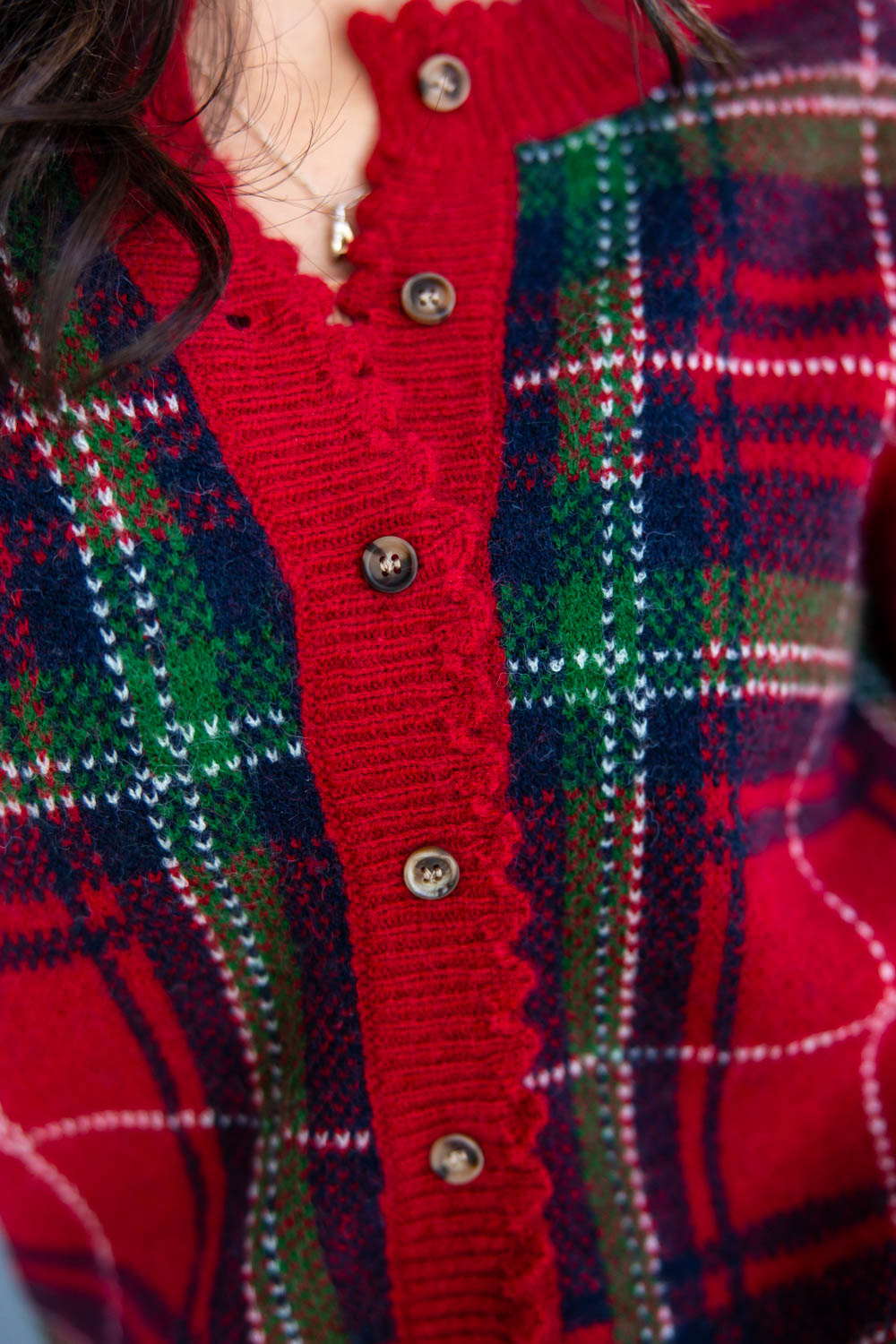 The Plaid & Pretty Puff Sleeve Cardigan brings all the festive charm with zero effort required. Designed with a loose, easy fit and semi-cropped length, it pairs perfectly with high-rise denim or a cozy midi skirt. The round neckline and half-length puff sleeves give it that soft, feminine feel, while the classic plaid pattern brings instant holiday spirit. Functional buttons down the front make it as practical as it is pretty, and the ribbed, scalloped trim along the neckline, placket, cuffs, and hem adds the sweetest finishing touch. From holiday brunch to twinkly light strolls, this top is here to make spirits bright.