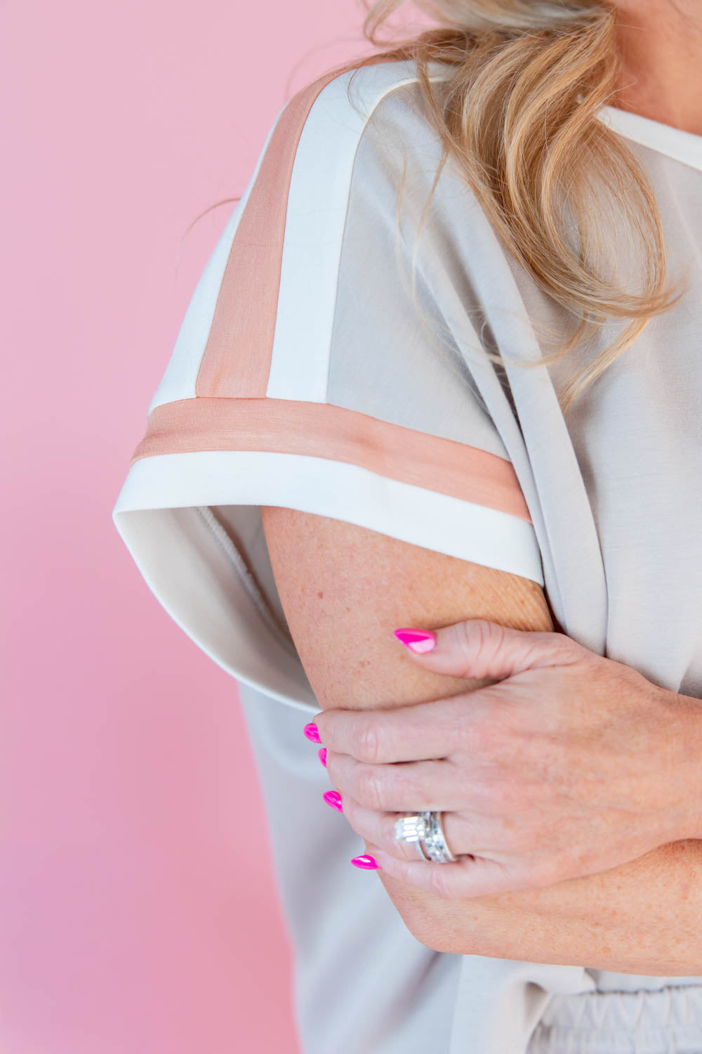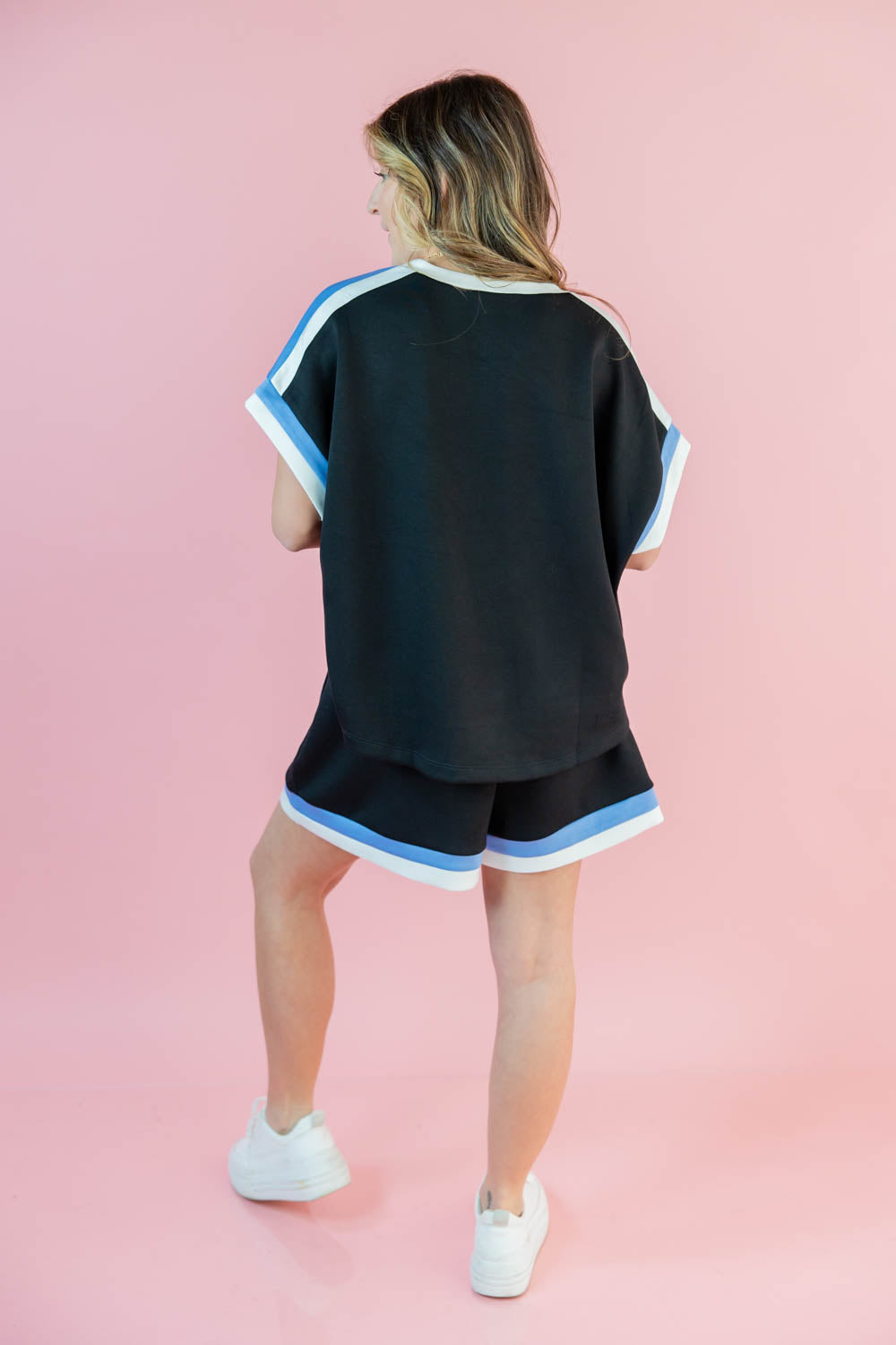 The Power Pop Short Sleeve Top completes your matching set with an effortlessly cool feel. The oversized, boxy fit gives you that relaxed, confident shape, while the semi cropped length pairs perfectly with the coordinating bottoms. A classic crew neckline keeps it timeless and easy to style. Short sleeves with contrasting trim cuffs add a sporty pop that makes the look feel intentional. Comfortable, flattering, and easy to throw on, this is the top that makes casual look put together.